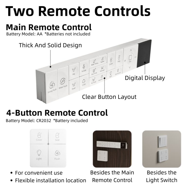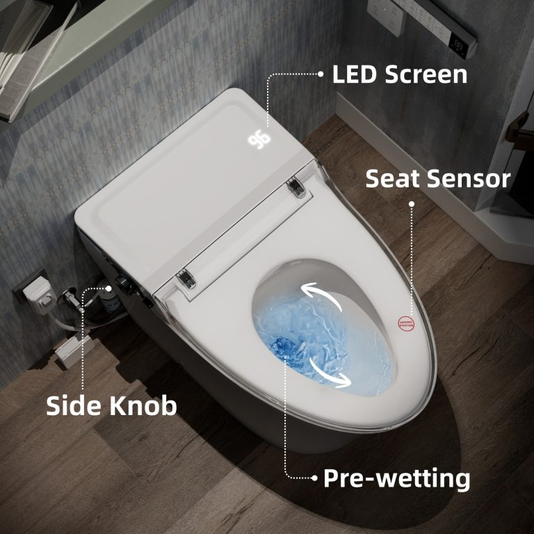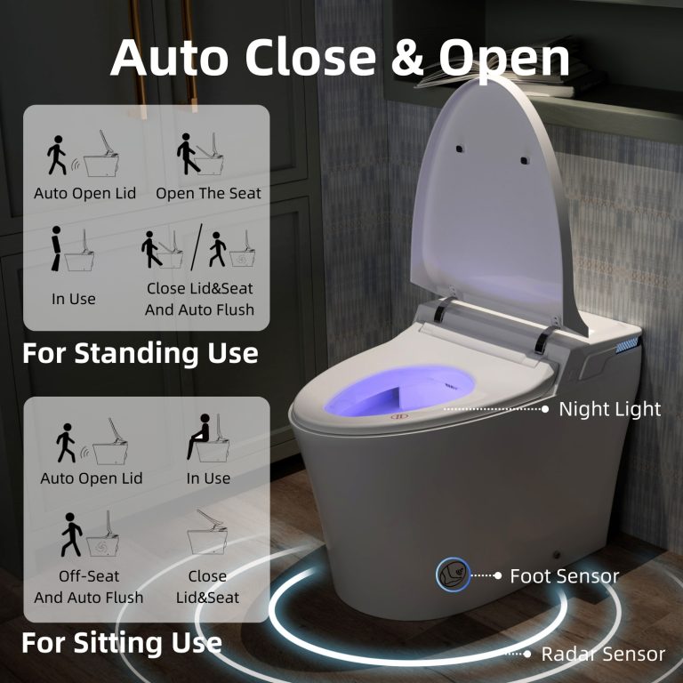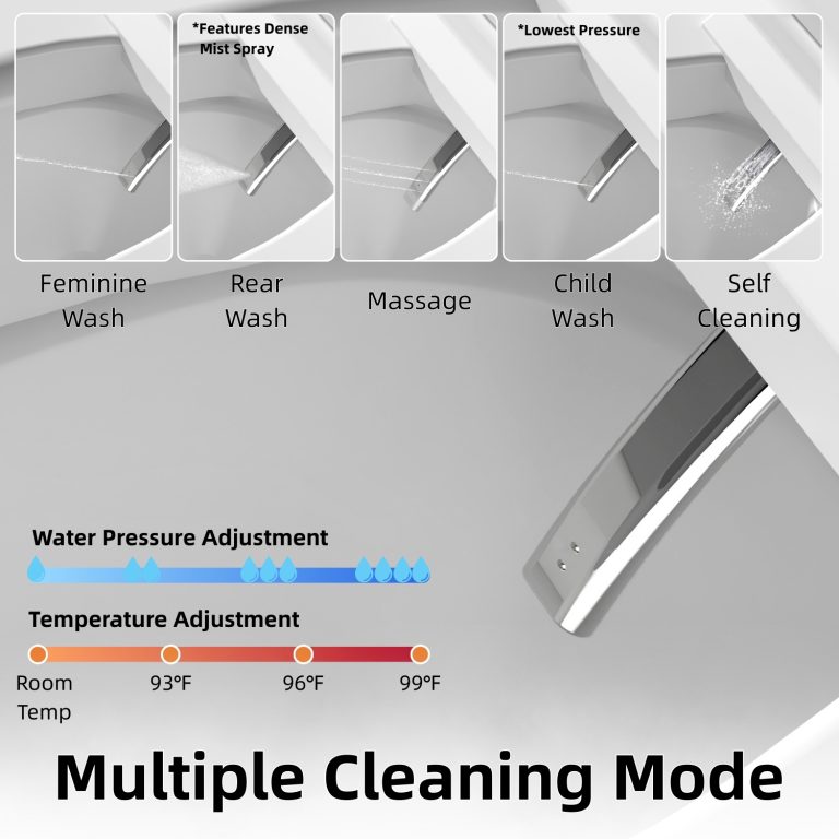 Customizable bidet functions include rear wash, feminine wash, and massage modes, paired with adjustable water temperature, nozzle positions, and pressure levels. A dedicated child wash mode defaults to gentle settings for added comfort. Radar sensing enables automatic lid opening and closing, while the seat sensor activates flushing when you stand. Side controls with clear indicators make daily operation intuitive. Designed for a standard 12-inch rough-in, the toilet includes a detailed manual, straightforward installation requirements, and dependable after-sales support.