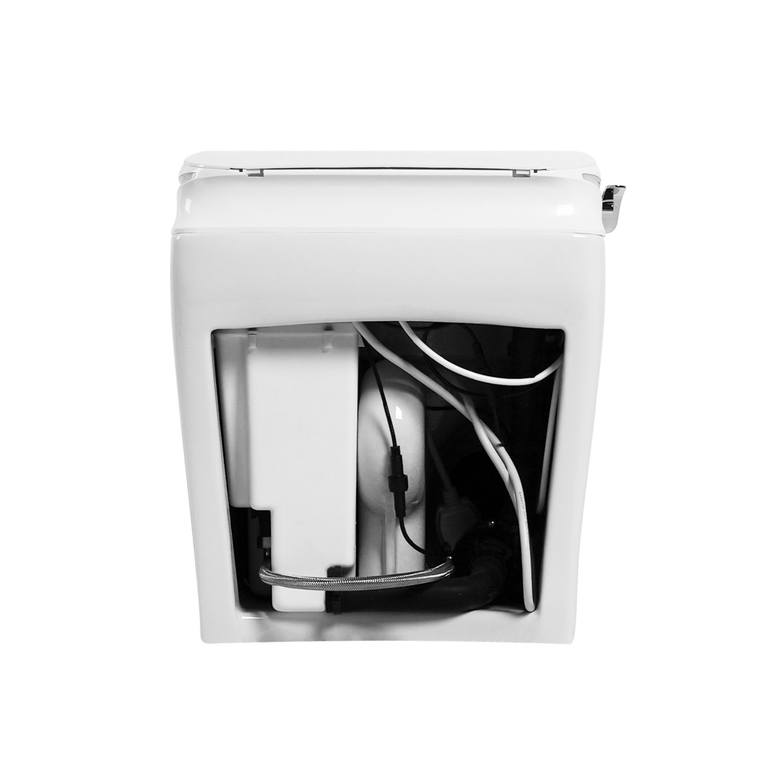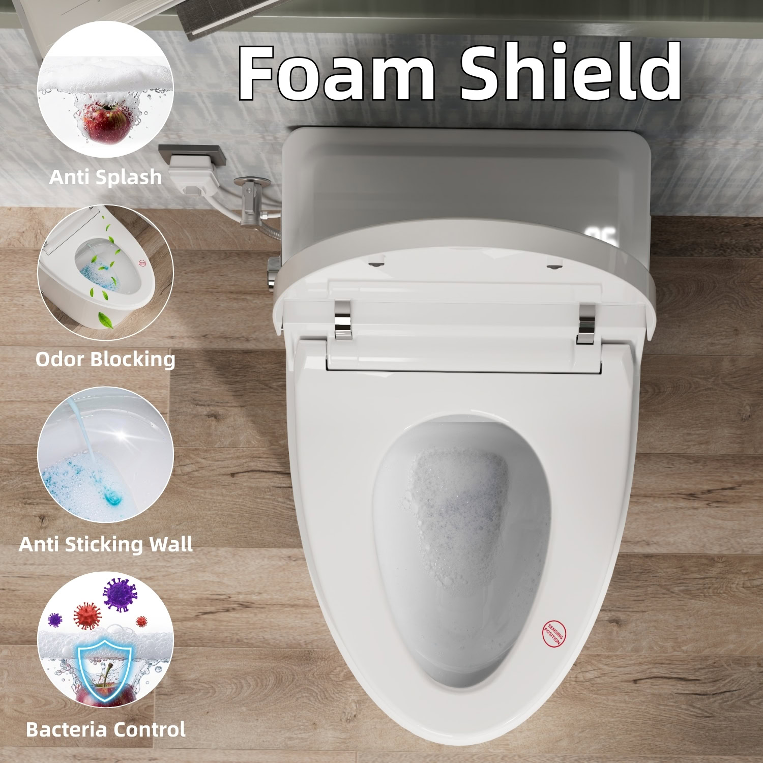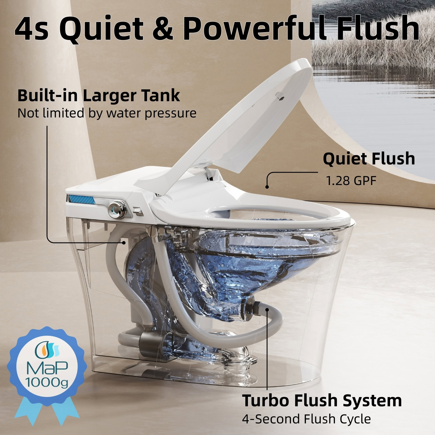 Los Flexi smart toilet brings together thoughtful design and everyday convenience to upgrade your bathroom experience. A built-in foam shield system releases a dense foam layer across the bowl surface, helping limit splashes, contain odors, and reduce residue buildup using a simple 1:1 mix of soap and water. The integrated water tank with booster pump delivers stable siphonic flushing without dependence on household water pressure, offering two flush options at 1.28 GPF and 1.1 GPF.
