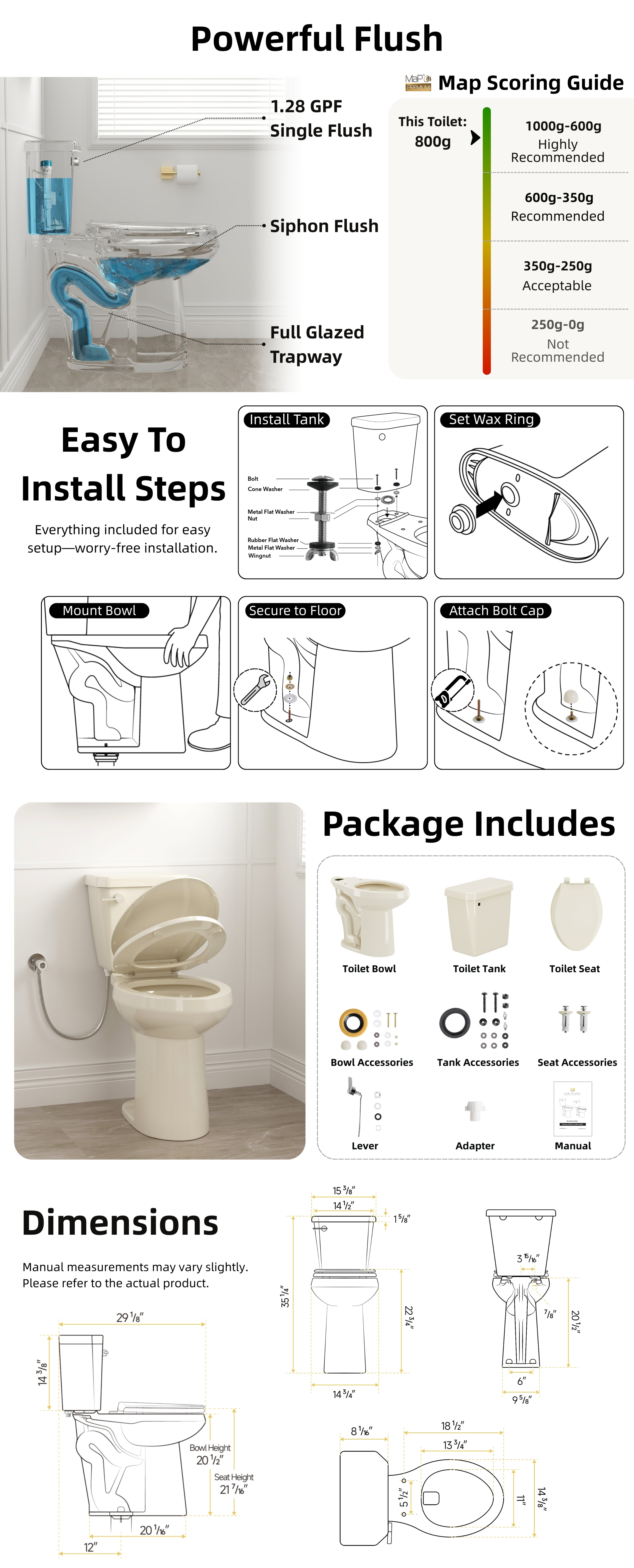 Operating at 1.28 gallons per flush, this tall toilet offers efficient water use without sacrificing flushing power. A quiet soft-close seat is included to prevent slamming and enhance daily comfort. Designed with a standard 12-inch rough-in, installation is simple and straightforward. Dedicated after-sale support is available within 48 hours, ensuring added confidence and a smoother ownership experience.