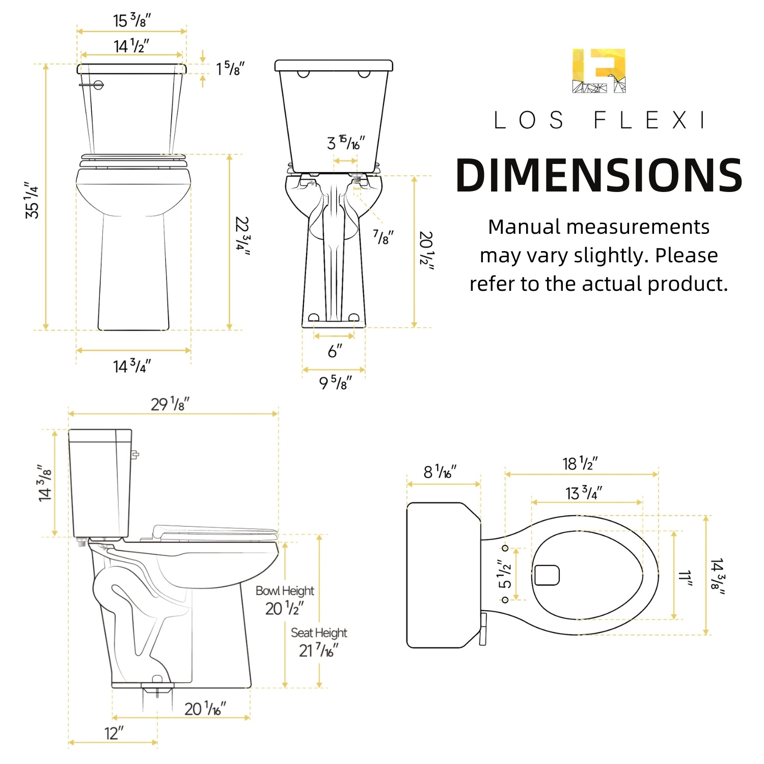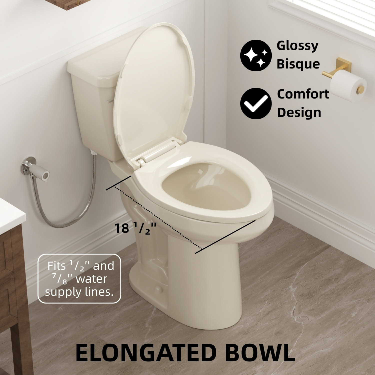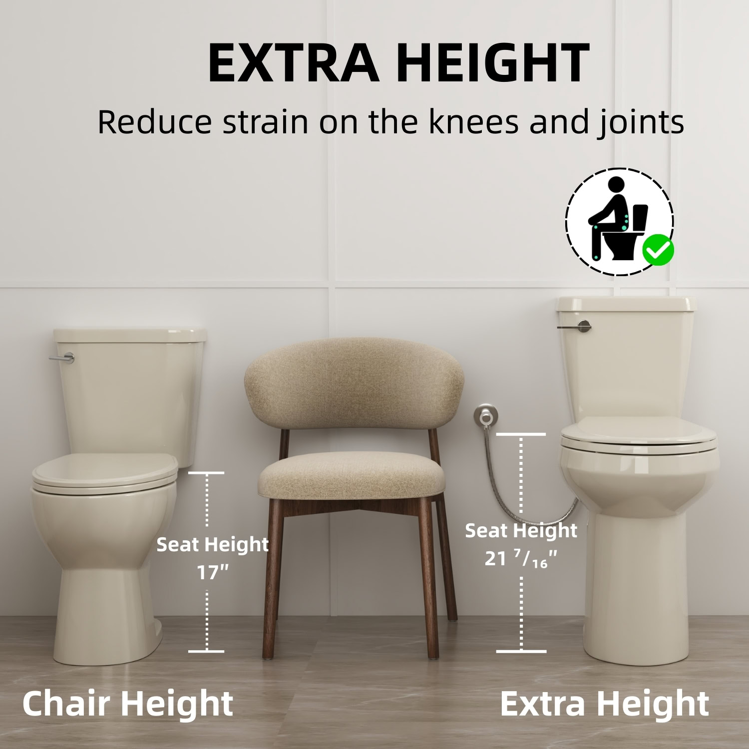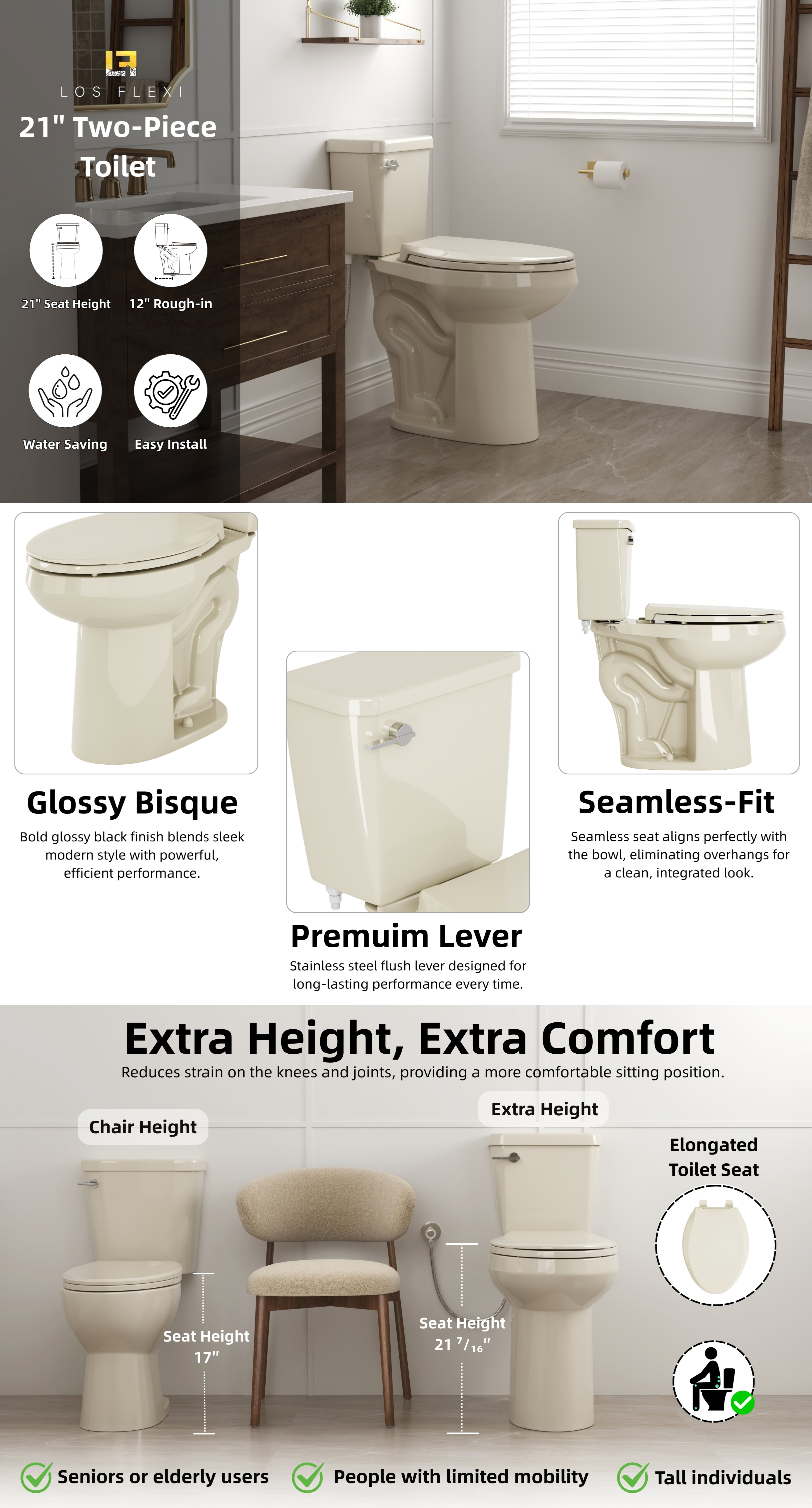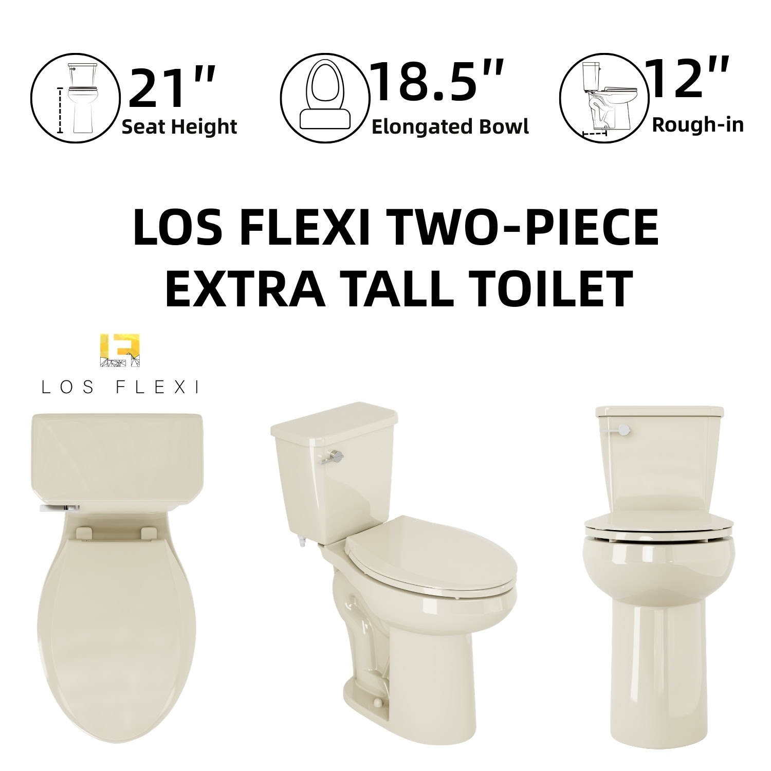 Los Flexi 21-inch tall toilet is designed to deliver everyday comfort, ease of use, and dependable performance. With a seat height of 21 inches from floor to seat, it makes sitting down and standing up noticeably easier, especially for older adults and taller users. The classic two-piece construction pairs with an elongated bowl to provide extra seating space and a familiar, comfortable feel. Finished in a warm bone color, it adds a clean, timeless look that blends easily with a wide range of bathroom styles.