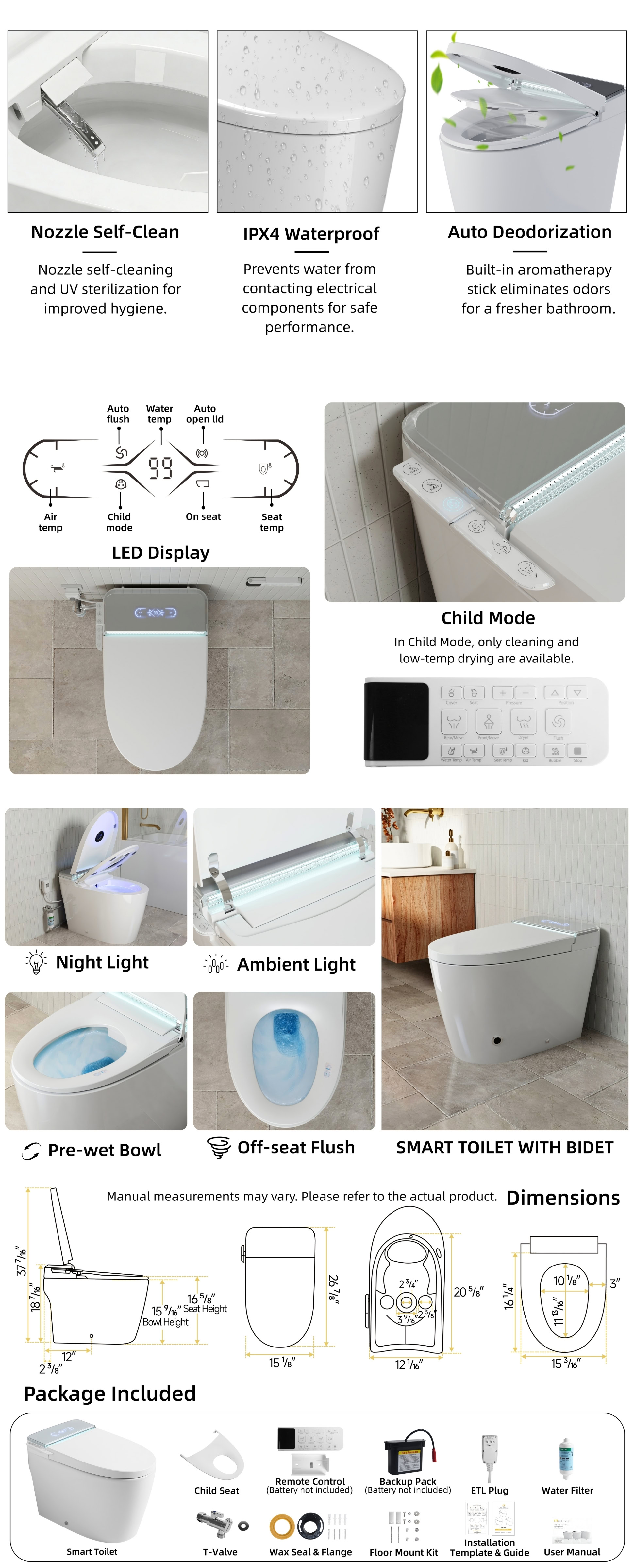 Los Flexi 956 Smart Toilet with Bidet, UV Care, Built-In Tank, Removable Child Seat, Warm Water, Air Dryer, Auto Open/Close Lid, Remote Control