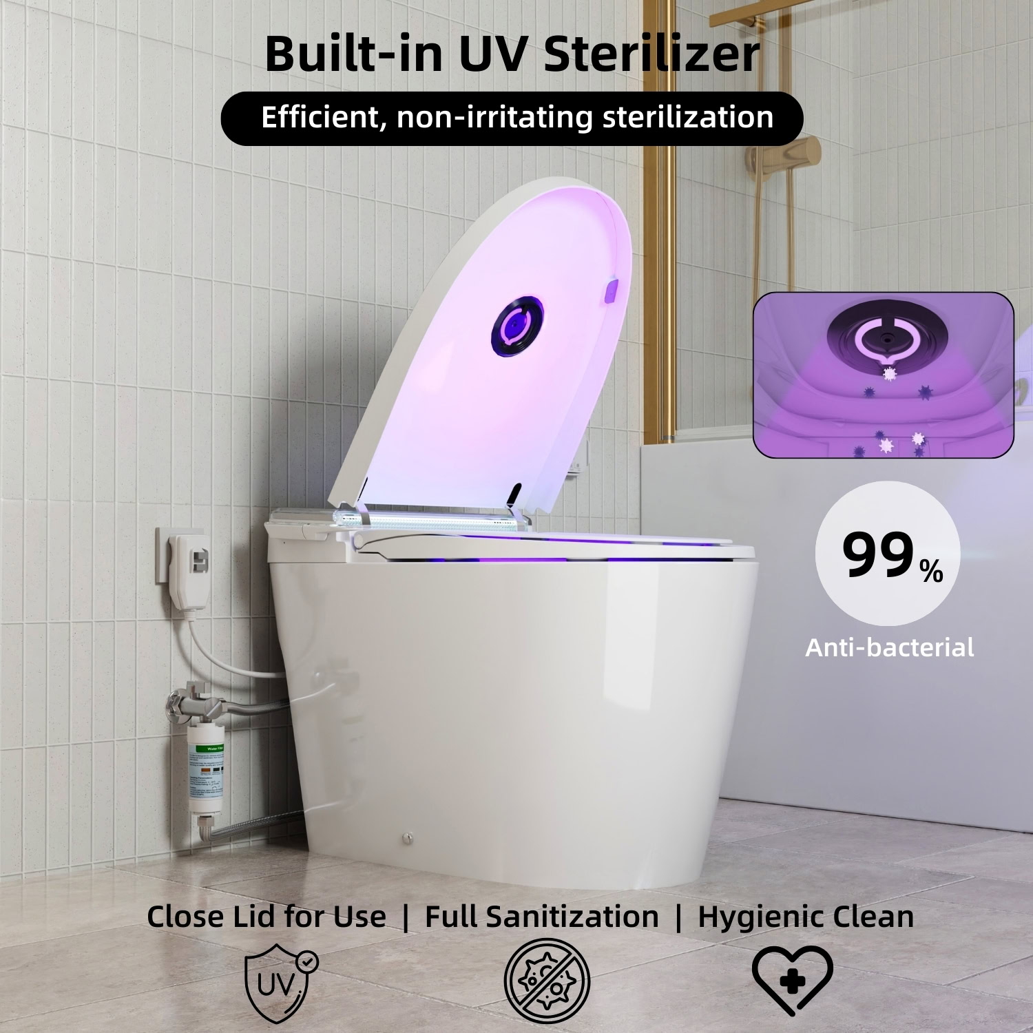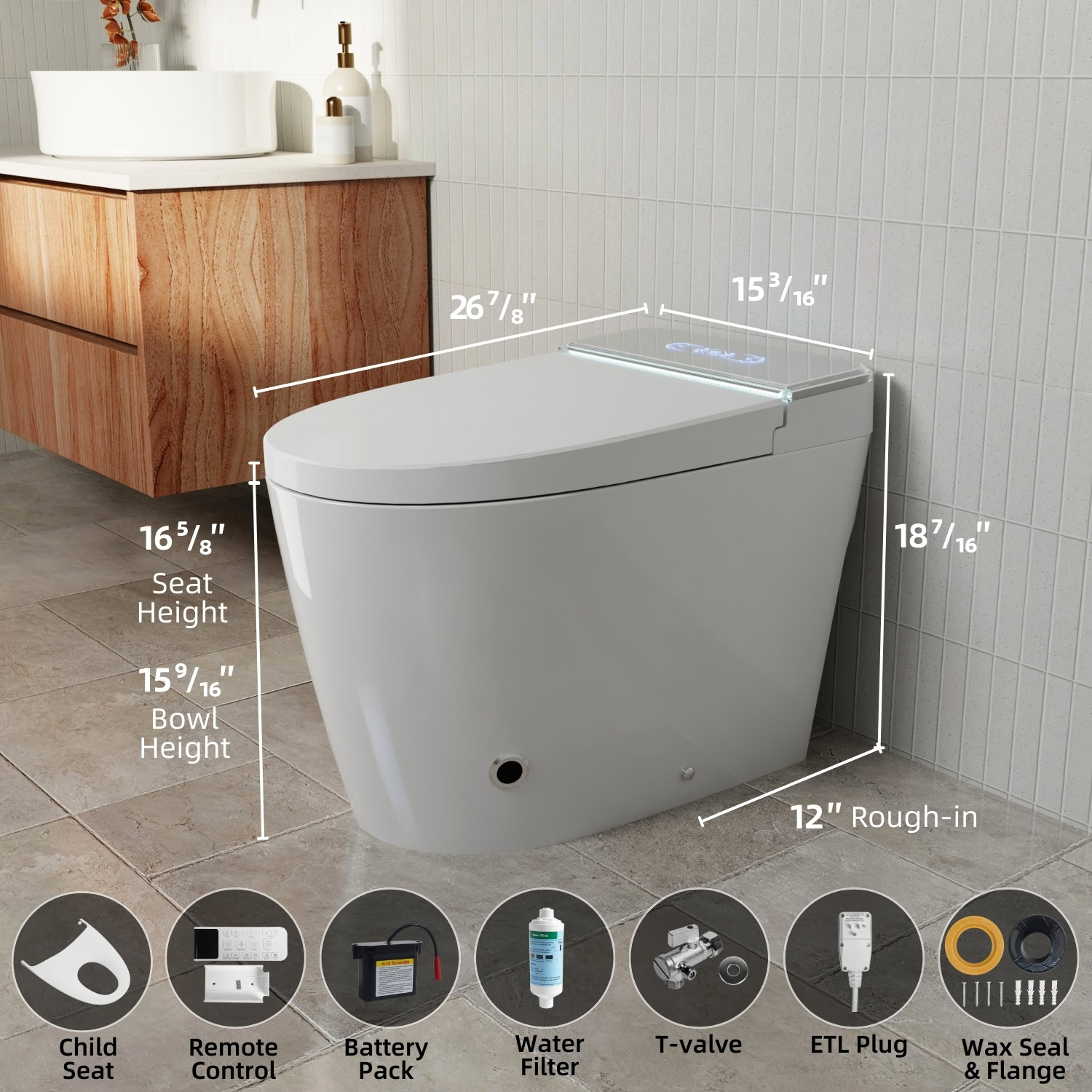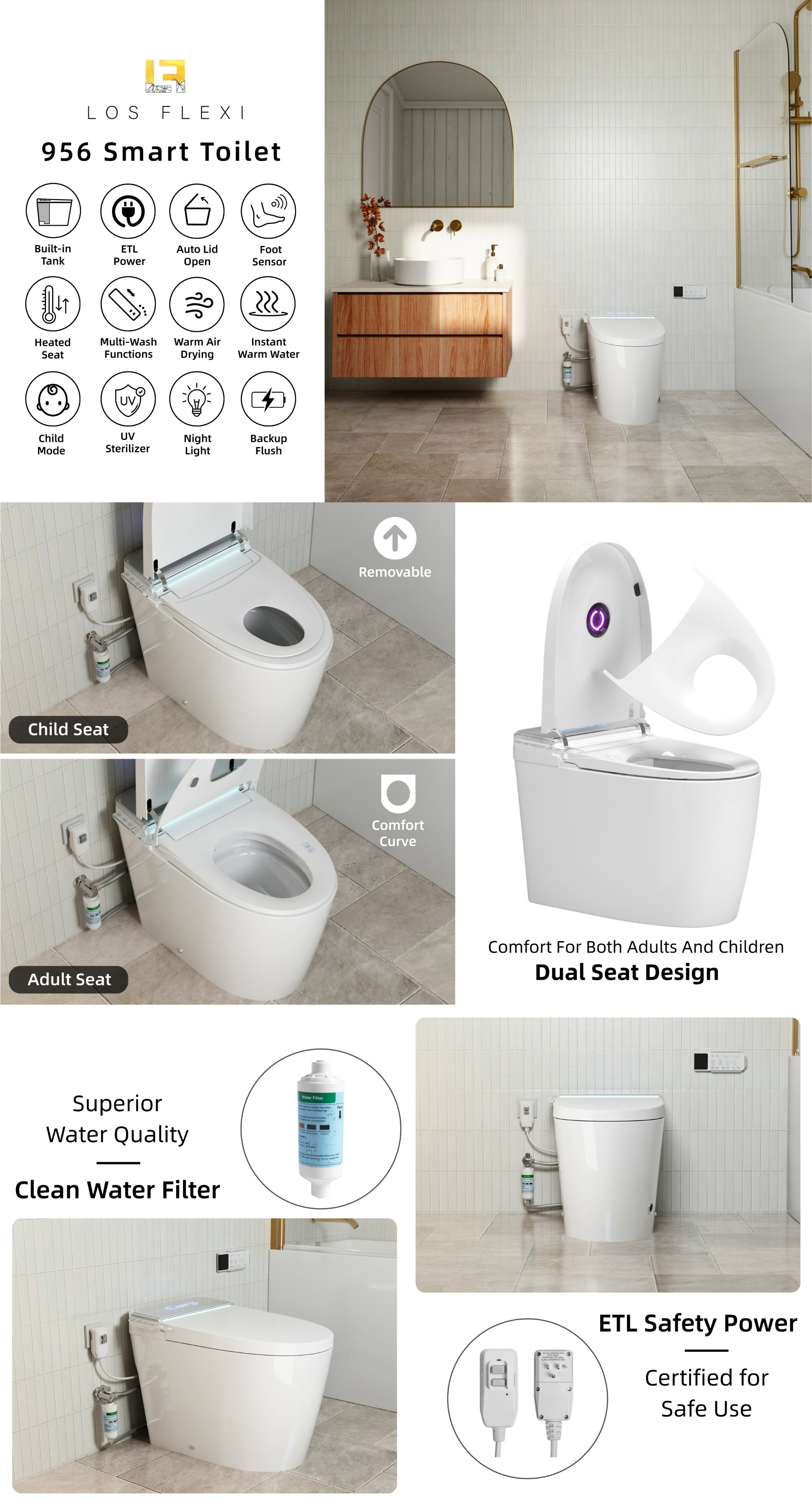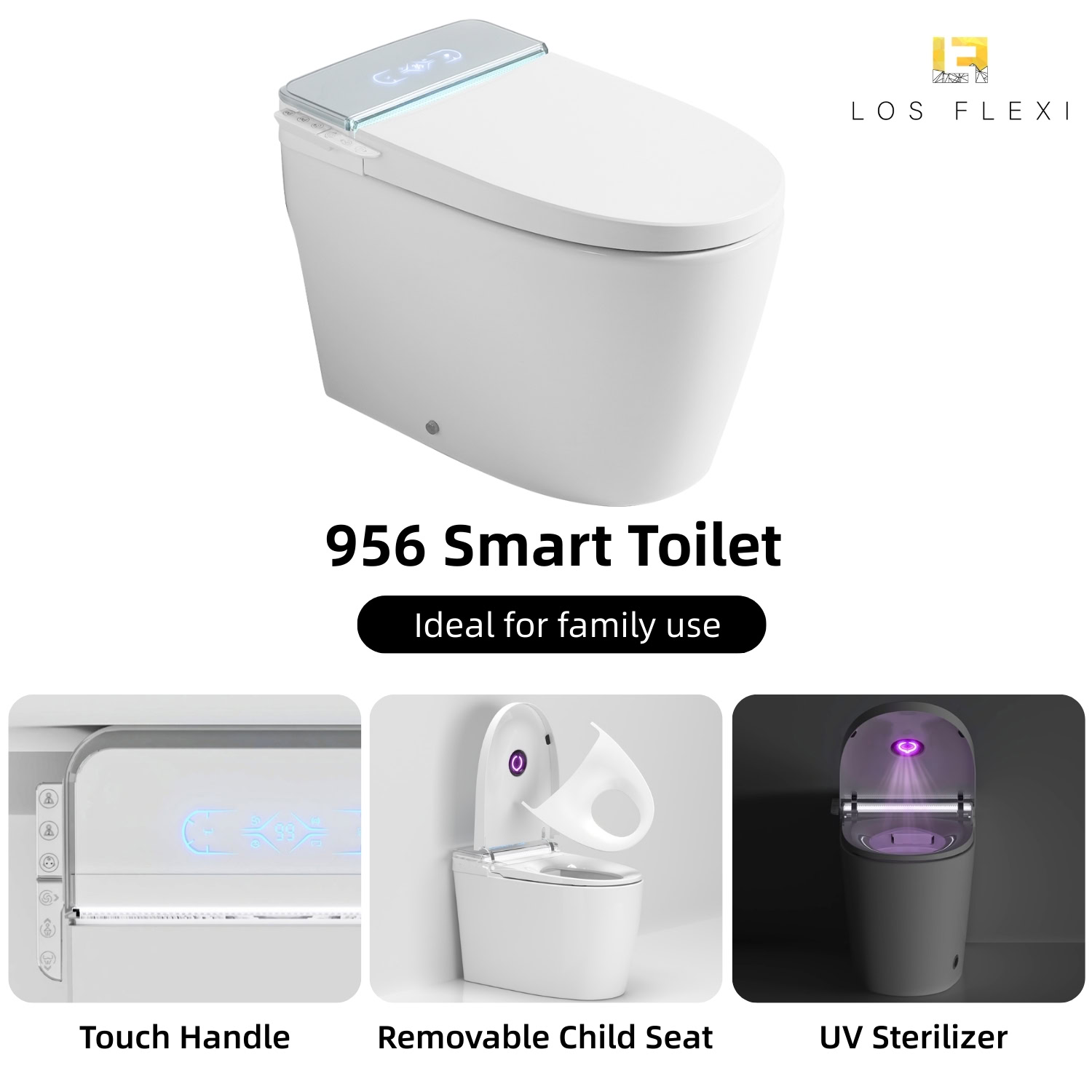 Los Flexi 956 Smart Toilet with Bidet, UV Care, Built-In Tank, Removable Child Seat, Warm Water, Air Dryer, Auto Open/Close Lid, Remote Control