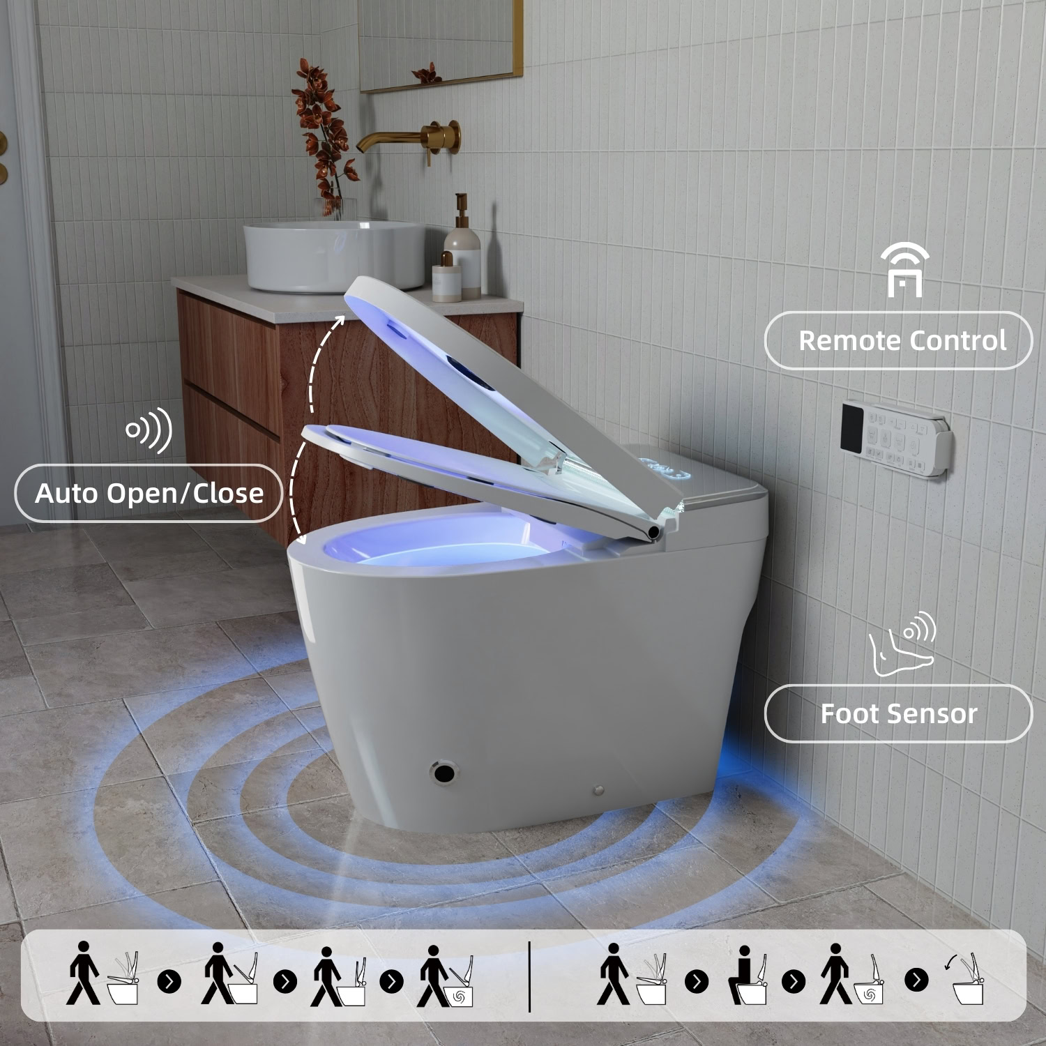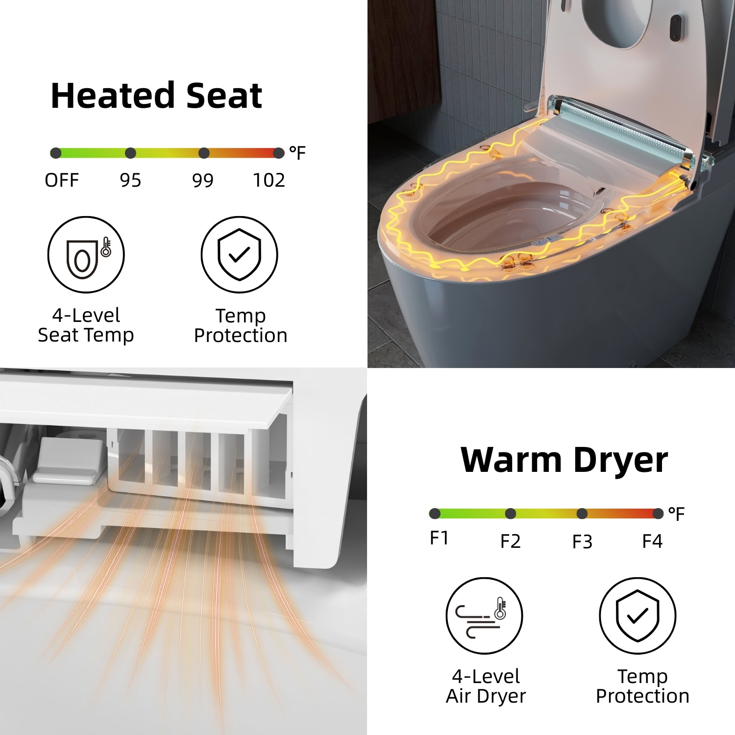 Comfort extends beyond washing. The heated seat and warm air dryer add year-round coziness, while hands-free operation (auto open and close, auto off-seat flush, and foot sensor control) reduces touch points to keep your bathroom experience more hygienic. The thoughtfully integrated removable child seat adapts seamlessly for kids and adults, eliminating the hassle of separate child seats or replacements. For more refined, user-friendly controls, the premium side control panel provides quick access, while the high-quality smart remote with digital display allows easy adjustments from a seated position.