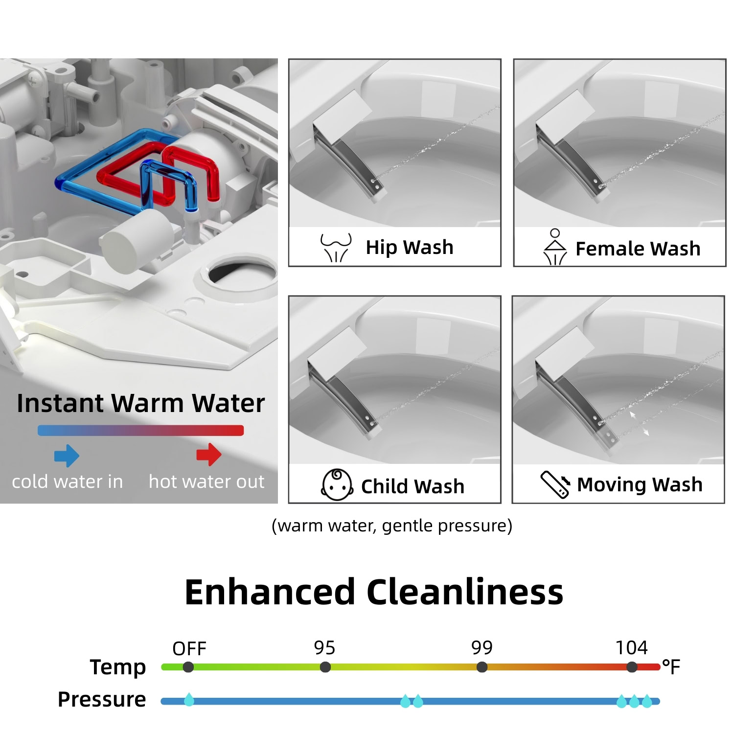 Designed for modern families who value hygiene, comfort, and reliability, the Los Flexi 956 smart toilet with built-in bidet elevates everyday bathroom routines with thoughtfully integrated technology. The UV light built into the lid supports routine care of the spray/nozzle area as part of daily maintenance, ensuring that your bidet experience is fresh and clean. Feature-rich wash modes with adjustable water temperature, pressure, and nozzle position—combined with instant warm water—deliver a personalized, spa-inspired cleanse for every user.
