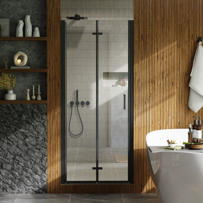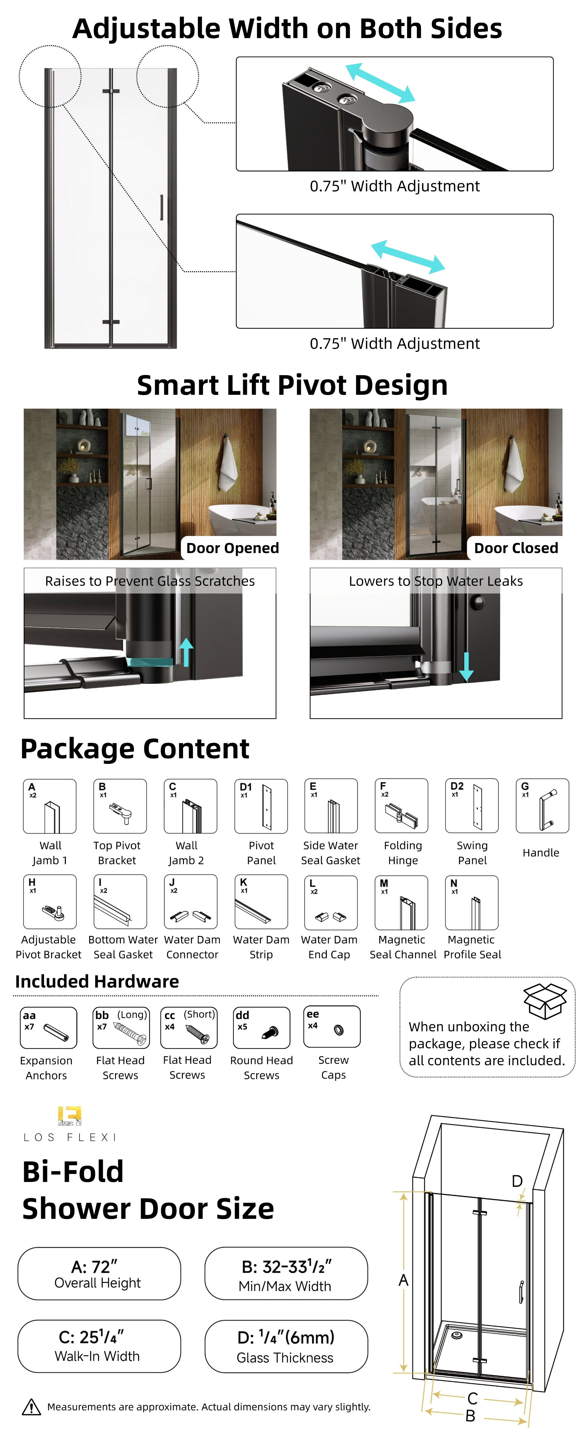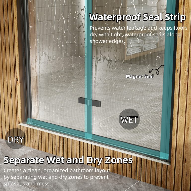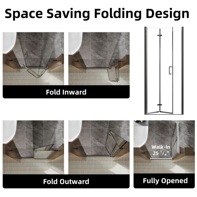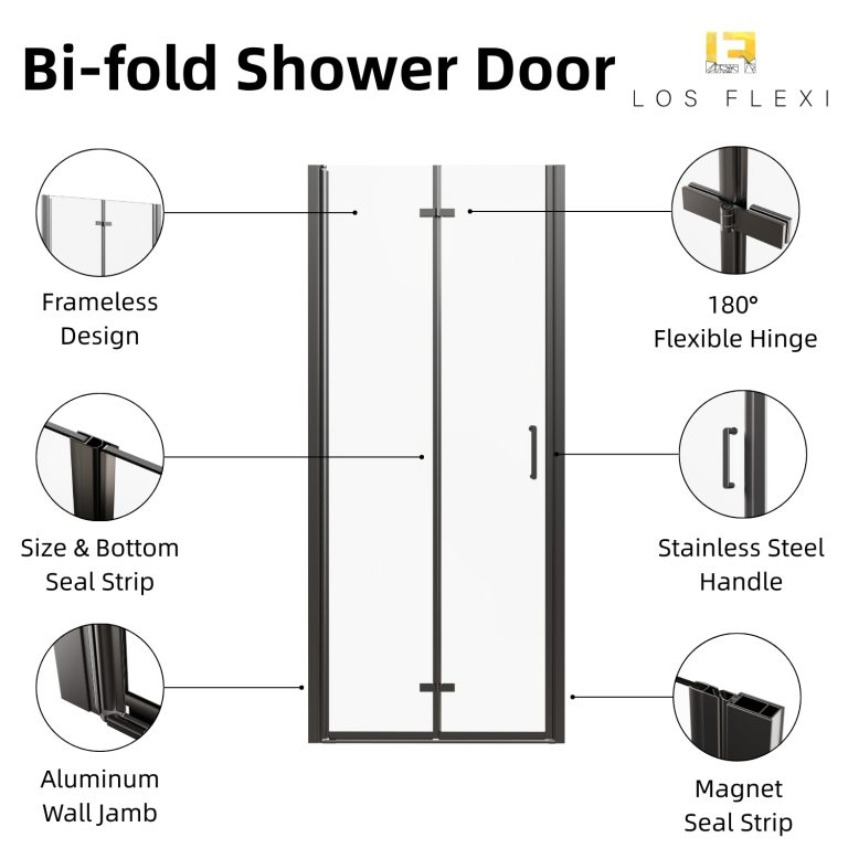 Los Flexi folding shower door combines durable construction, smooth operation, and a modern aesthetic ideal for walk-in showers. Made from 1/4″ (6mm) tempered glass that meets SGCC and ANSI standards, it offers reliable strength and long-term performance. The corrosion-resistant aluminum frame and stainless steel handle ensure stable, effortless movement even in humid environments. With 180° rotating hinges, the shower door folds inward or outward to maximize entry space, while reversible installation adapts to different bathroom layouts. Magnetic seals, side seals, and bottom strips work together to prevent leaks, and the raise-and-fall mechanism helps control water splashes and protects the glass. Its matte black finish adds a clean, contemporary look that complements a wide range of bathroom styles. Designed to fit various wall conditions, this retractable shower door includes all necessary hardware, secure packaging, and a 1-year limited warranty for worry-free installation and dependable everyday use.