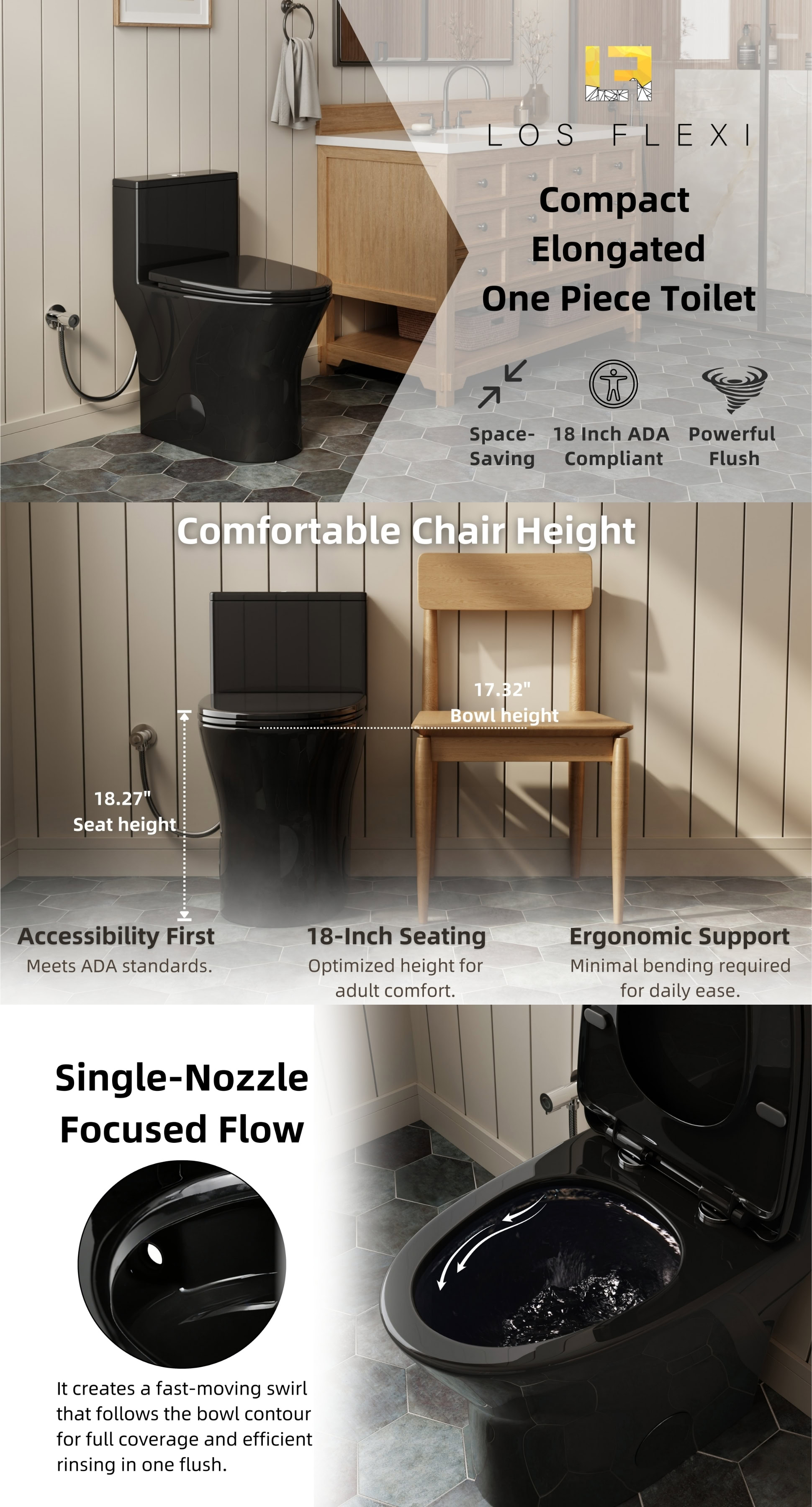 Los Flexi C 18″ Compact & Elongated One Piece Toilet Glossy Black With Rimless Swirl Flush