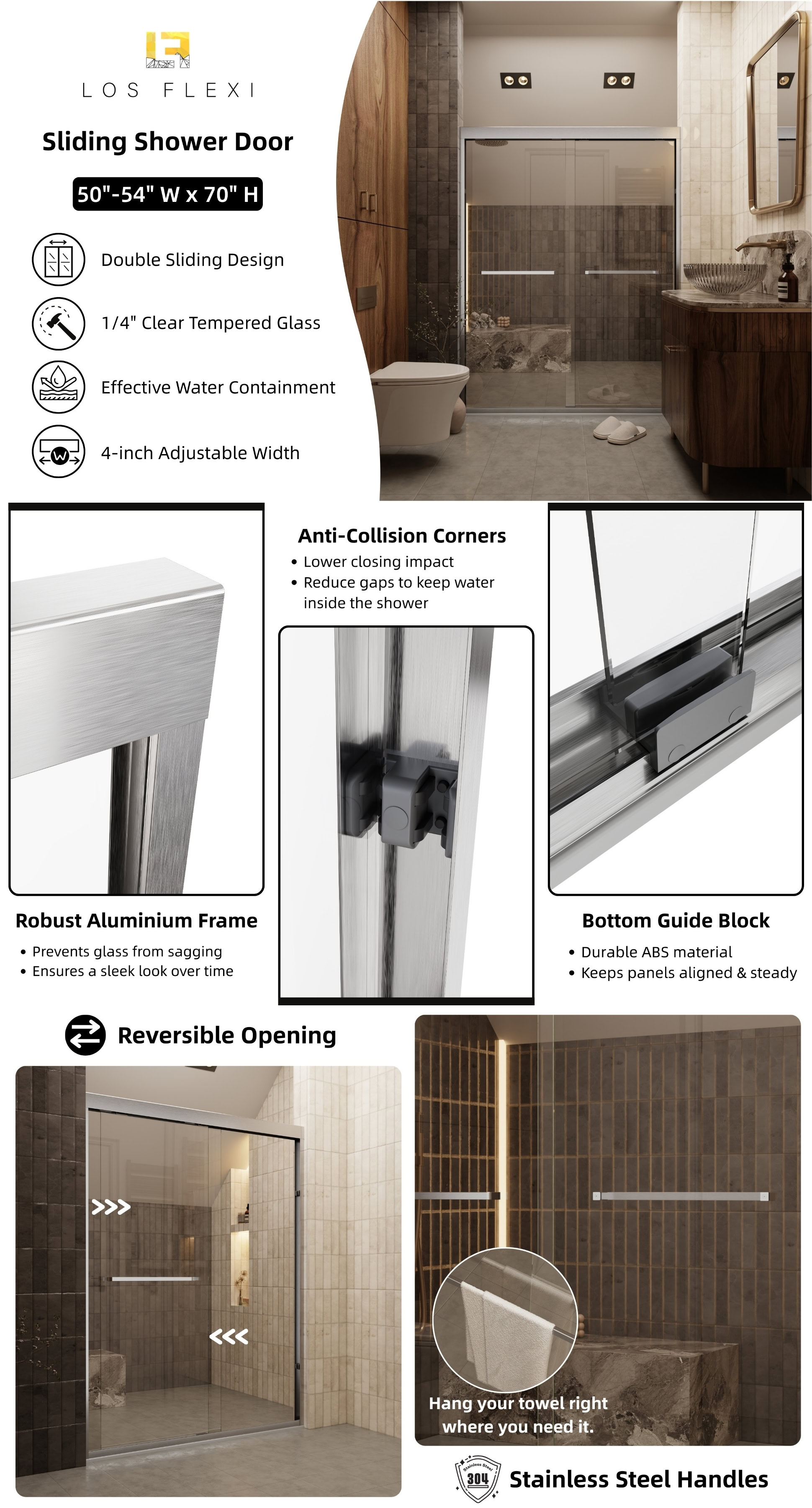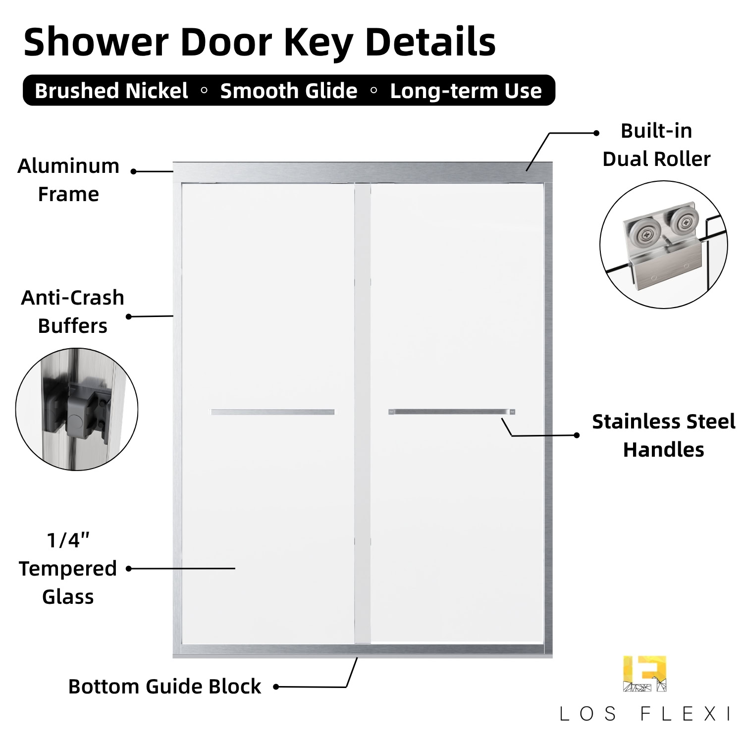 Upgrade your bathroom with the Los Flexi Double Sliding Shower Door, engineered for smooth performance and modern style. Featuring quiet dual rollers and 4 anti-collision buffers, this sliding system delivers a stable, low-noise glide for a more comfortable daily shower experience.