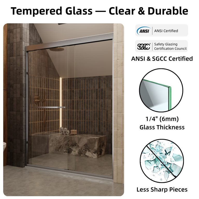 Crafted with 1/4″ (6 mm) clear tempered glass and durable brushed nickel stainless steel hardware, it offers long-lasting strength while maintaining a bright, open look that enhances any bathroom space. The clean design pairs easily with both modern and classic interiors.