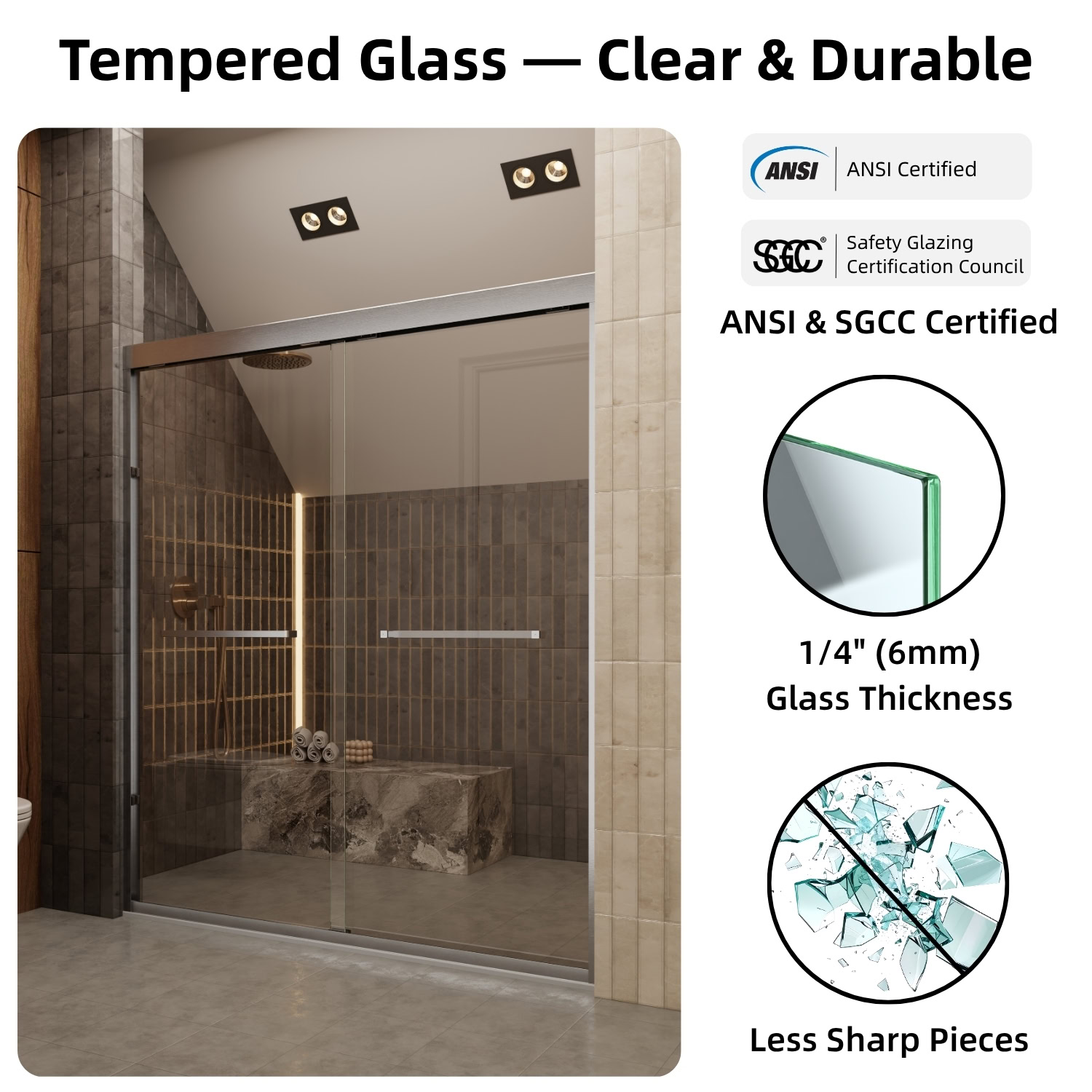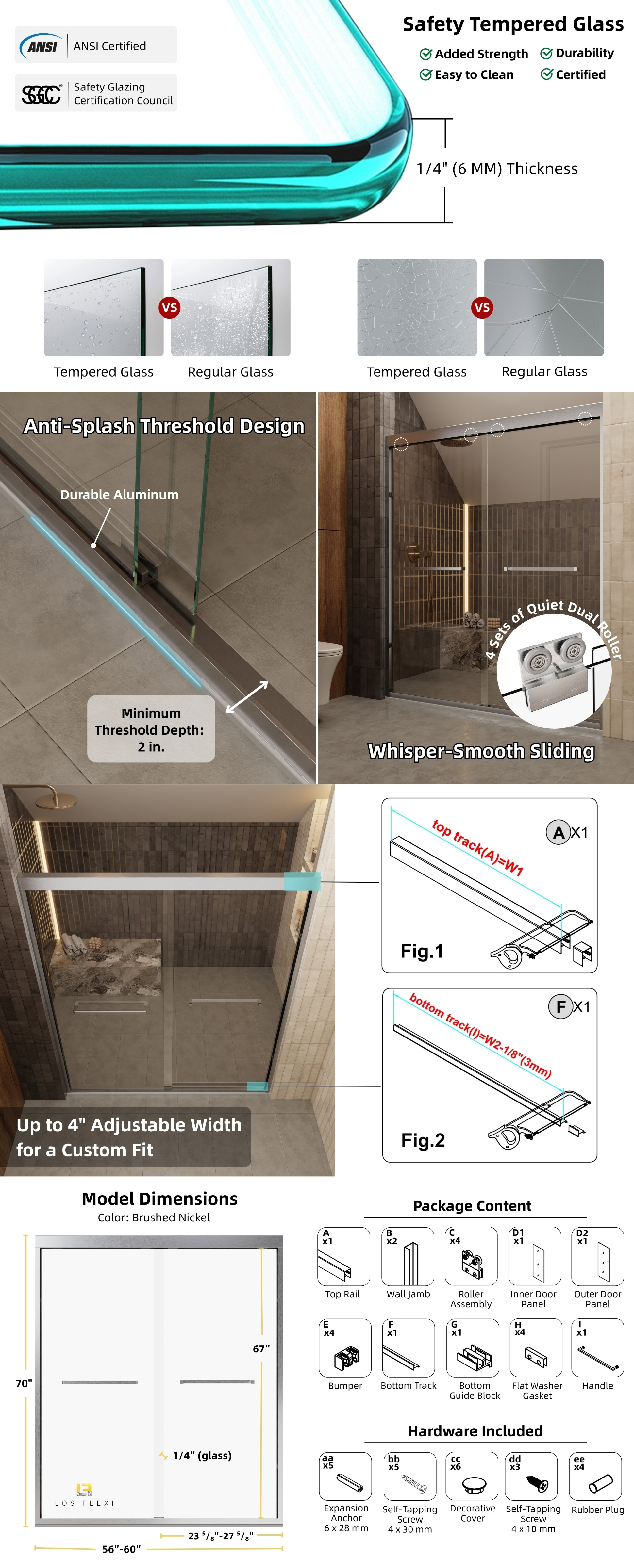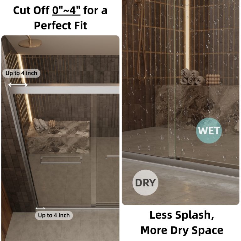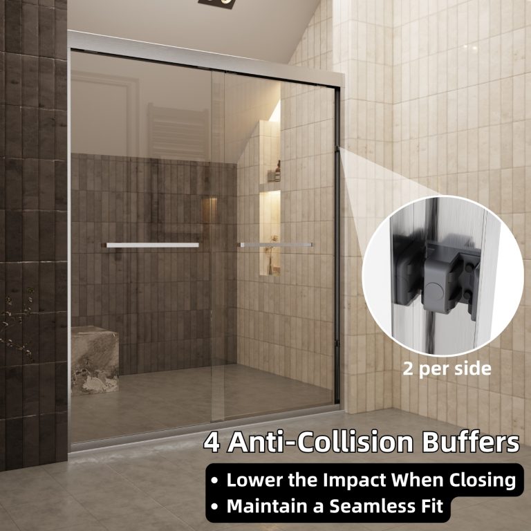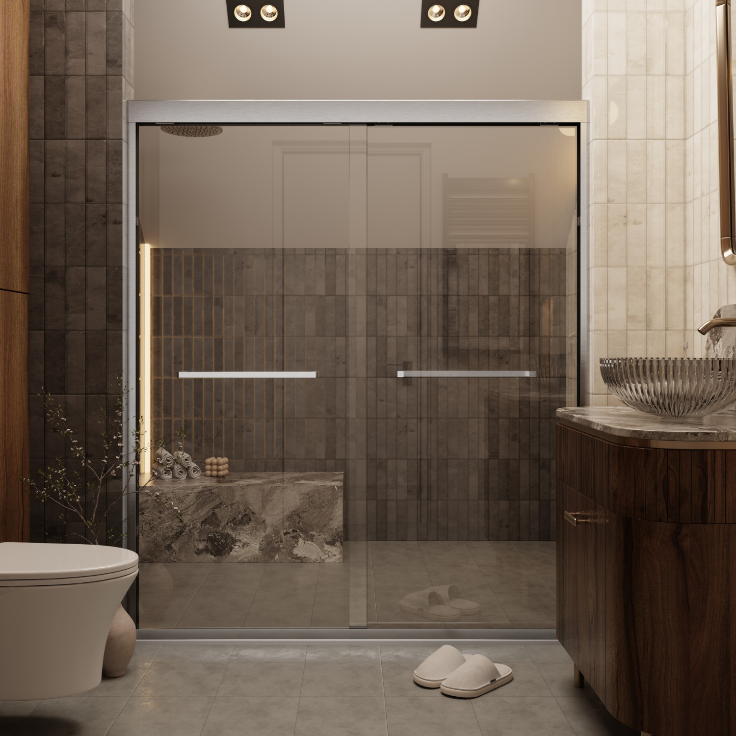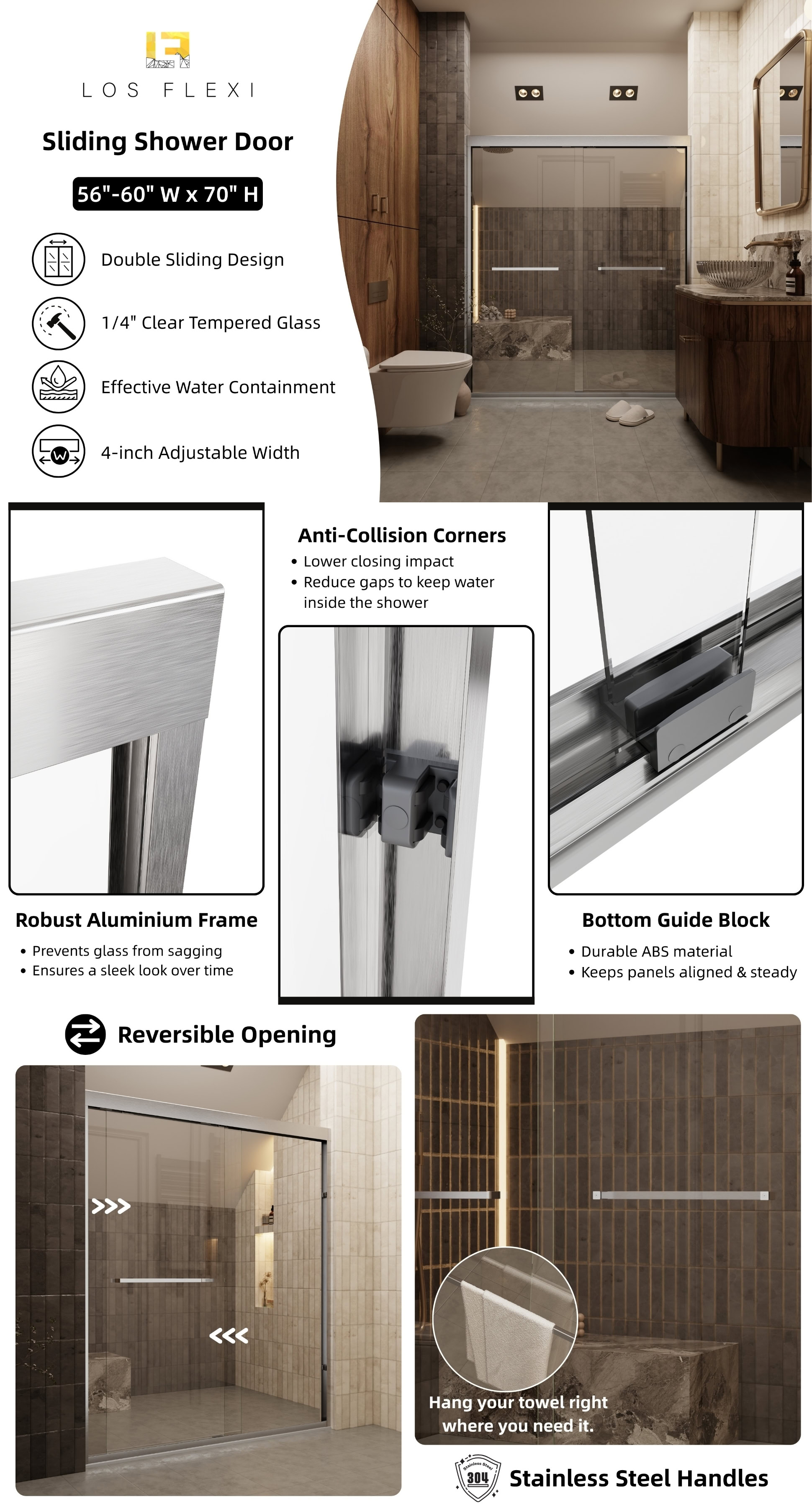 Enhance your space with the Los Flexi Double Sliding Shower Door (56–60″ W x 70″ H), designed for a smooth, reliable shower experience. Equipped with precision dual rollers and 4 anti-collision buffers, it delivers a steady, low-noise glide that feels effortless every time you use it. Made with 1/4″ (6 mm) clear tempered glass and brushed nickel stainless steel hardware, this shower door combines lasting durability with a clean, modern finish that complements a wide range of bathroom styles while keeping the space bright and open. The adjustable width (up to 4 inches) allows for a more flexible fit across different shower openings, making installation easier. Ideal for bathroom updates, this sliding shower door balances style, smooth operation, and practical adaptability for everyday use.
