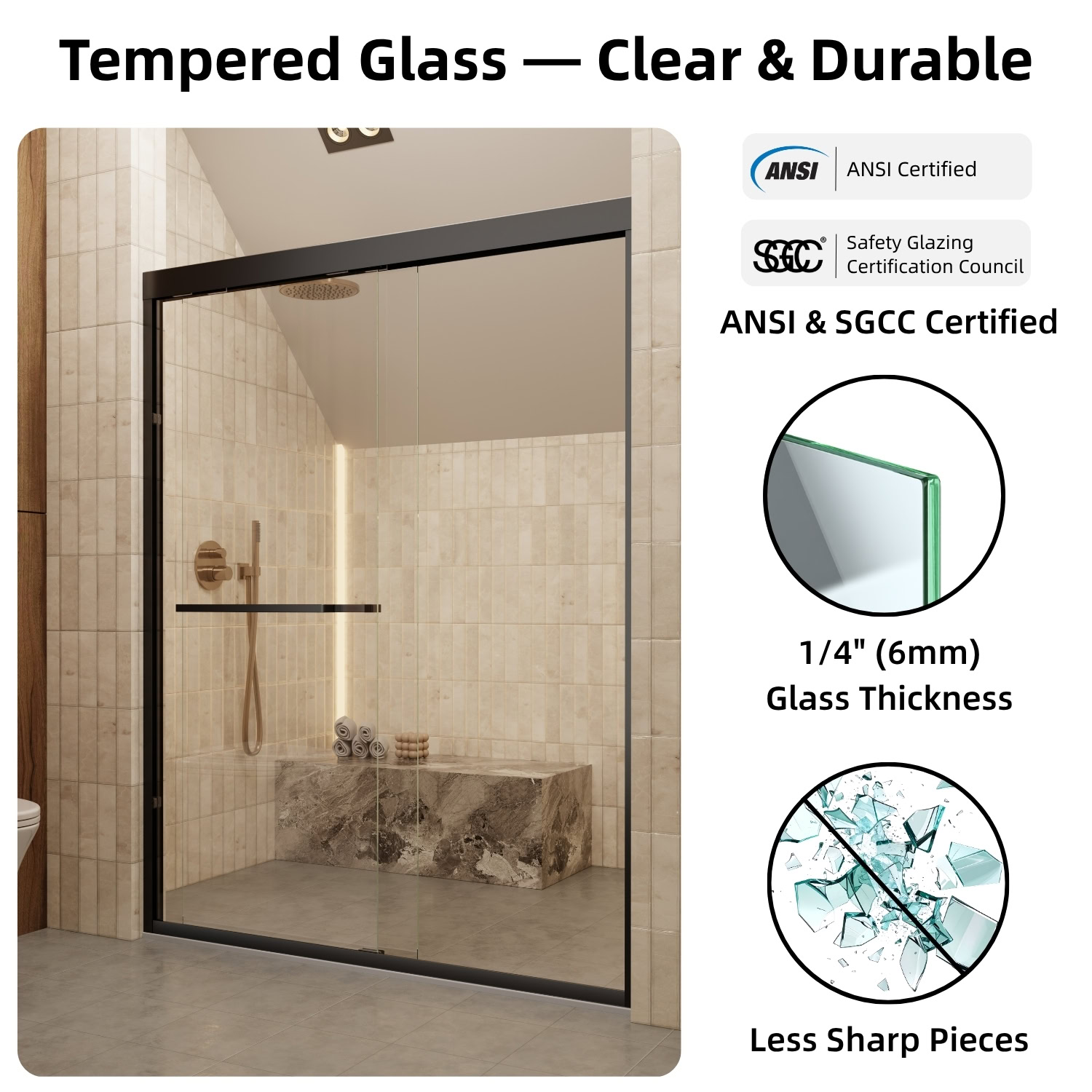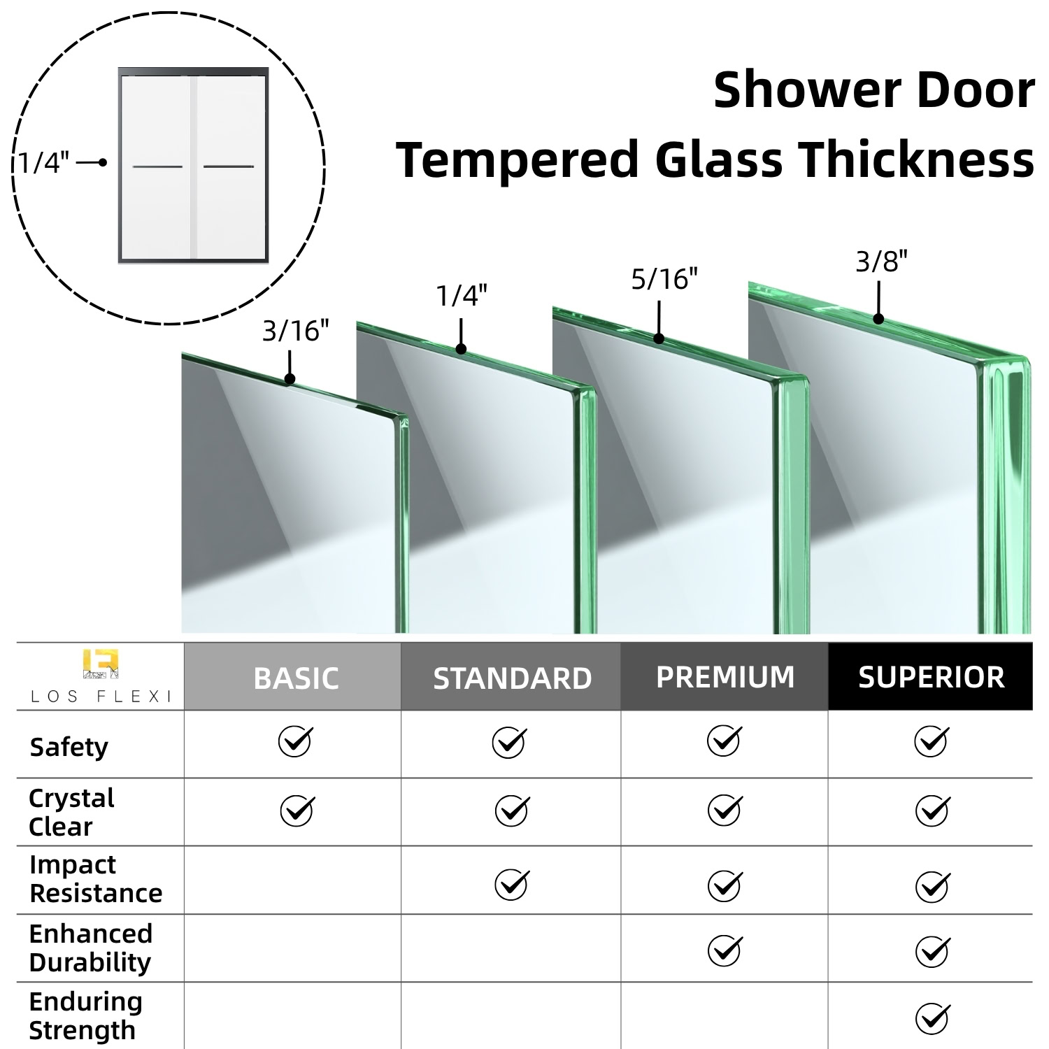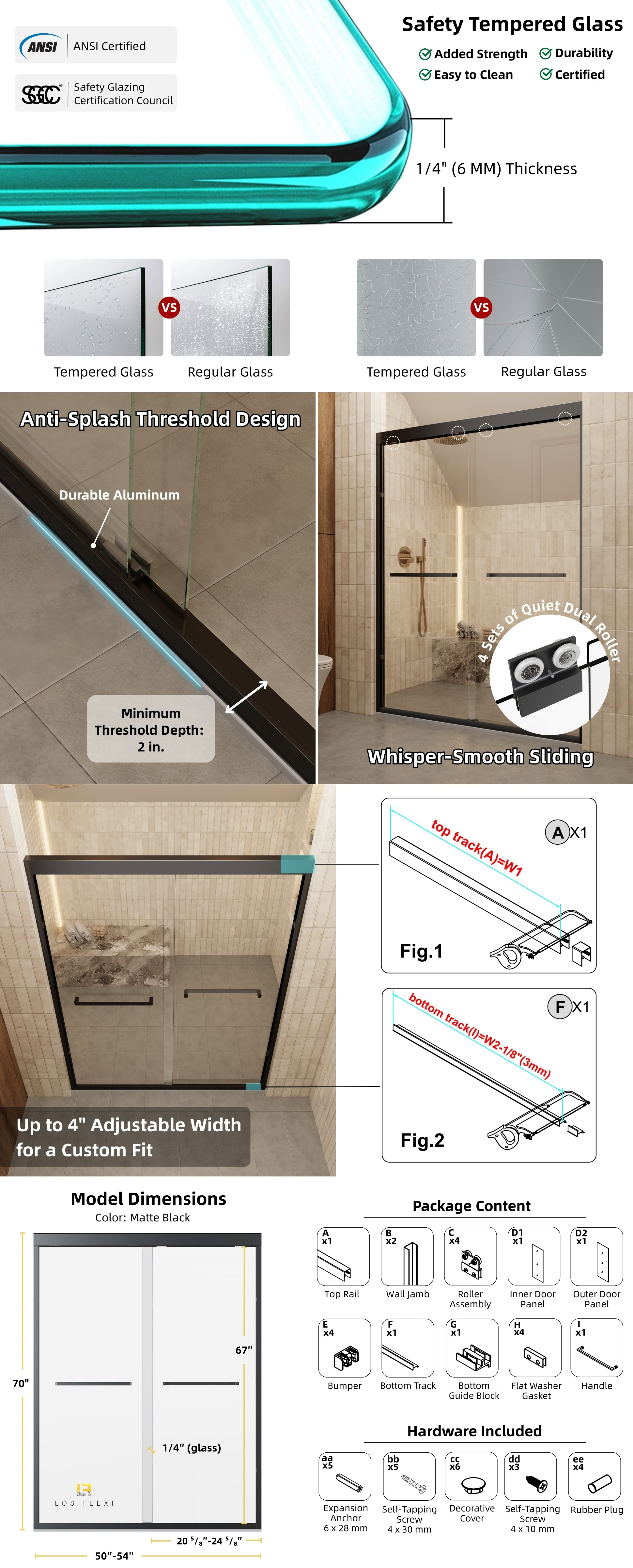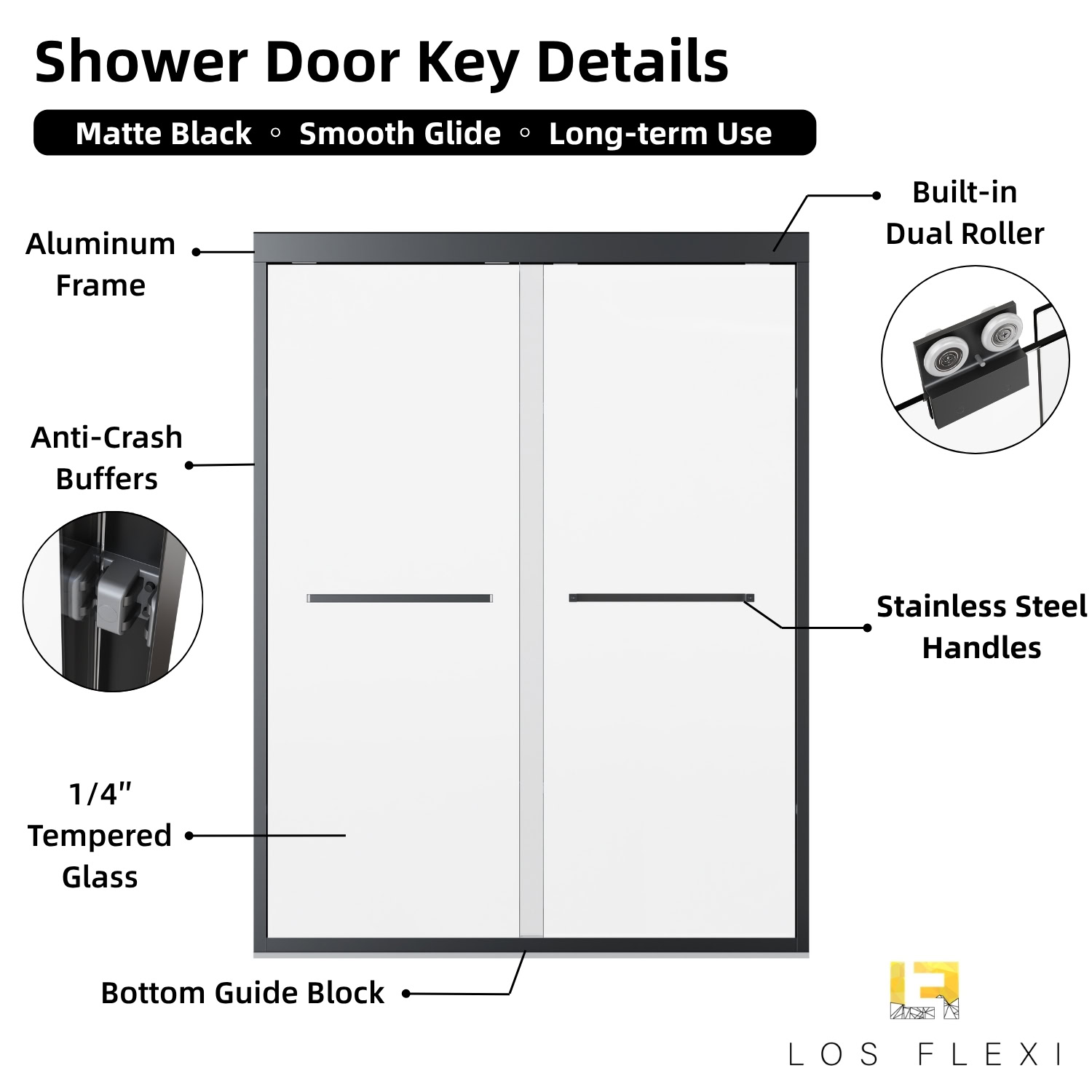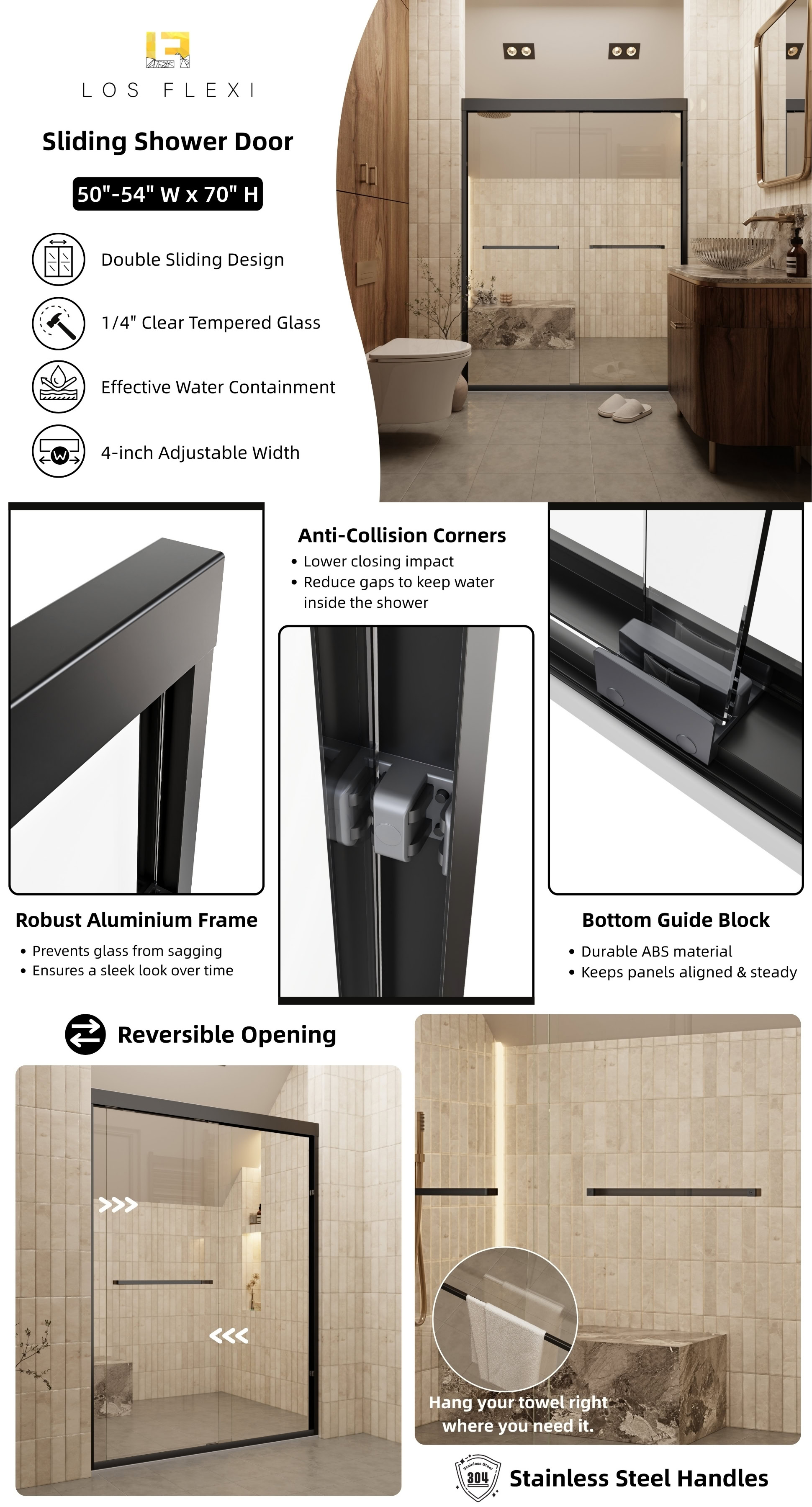 Los Flexi Double Sliding Shower Door Matte Black 54″W x 70″H with 1/4″ Tempered Glass