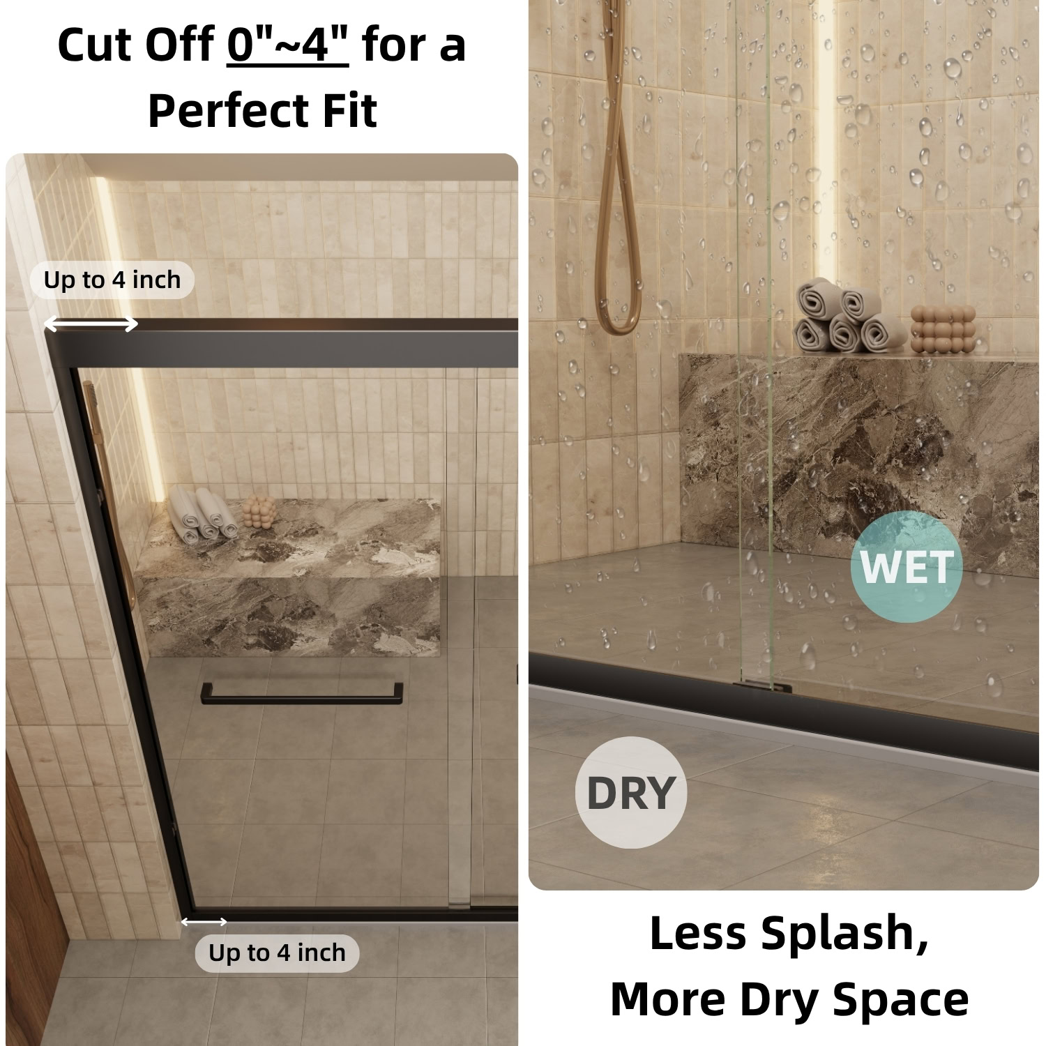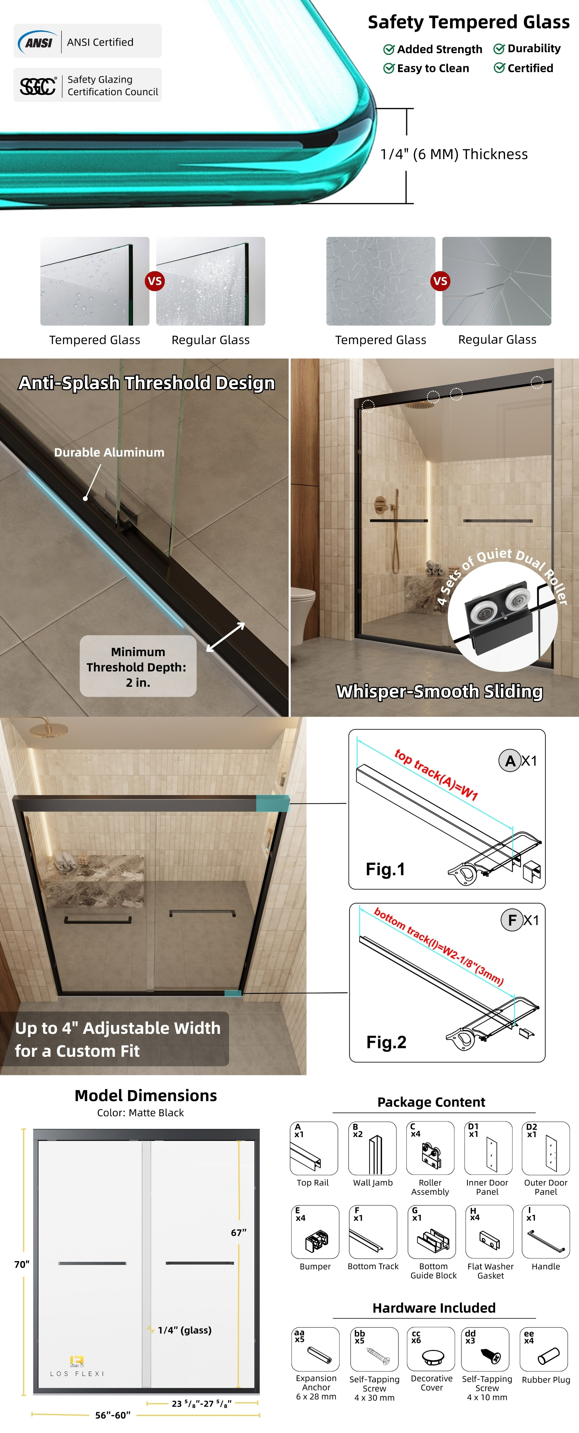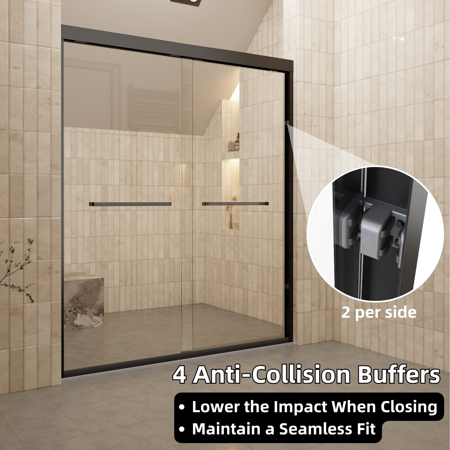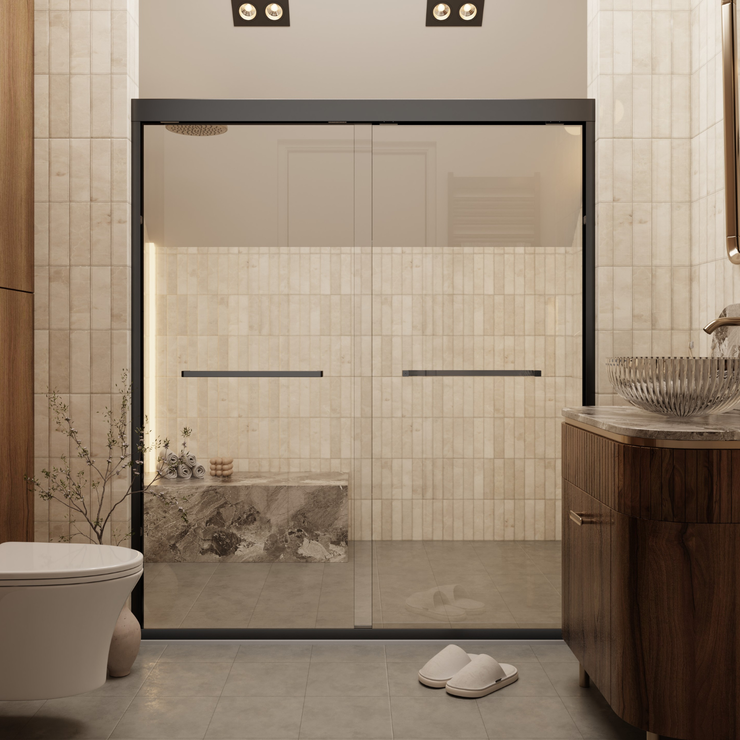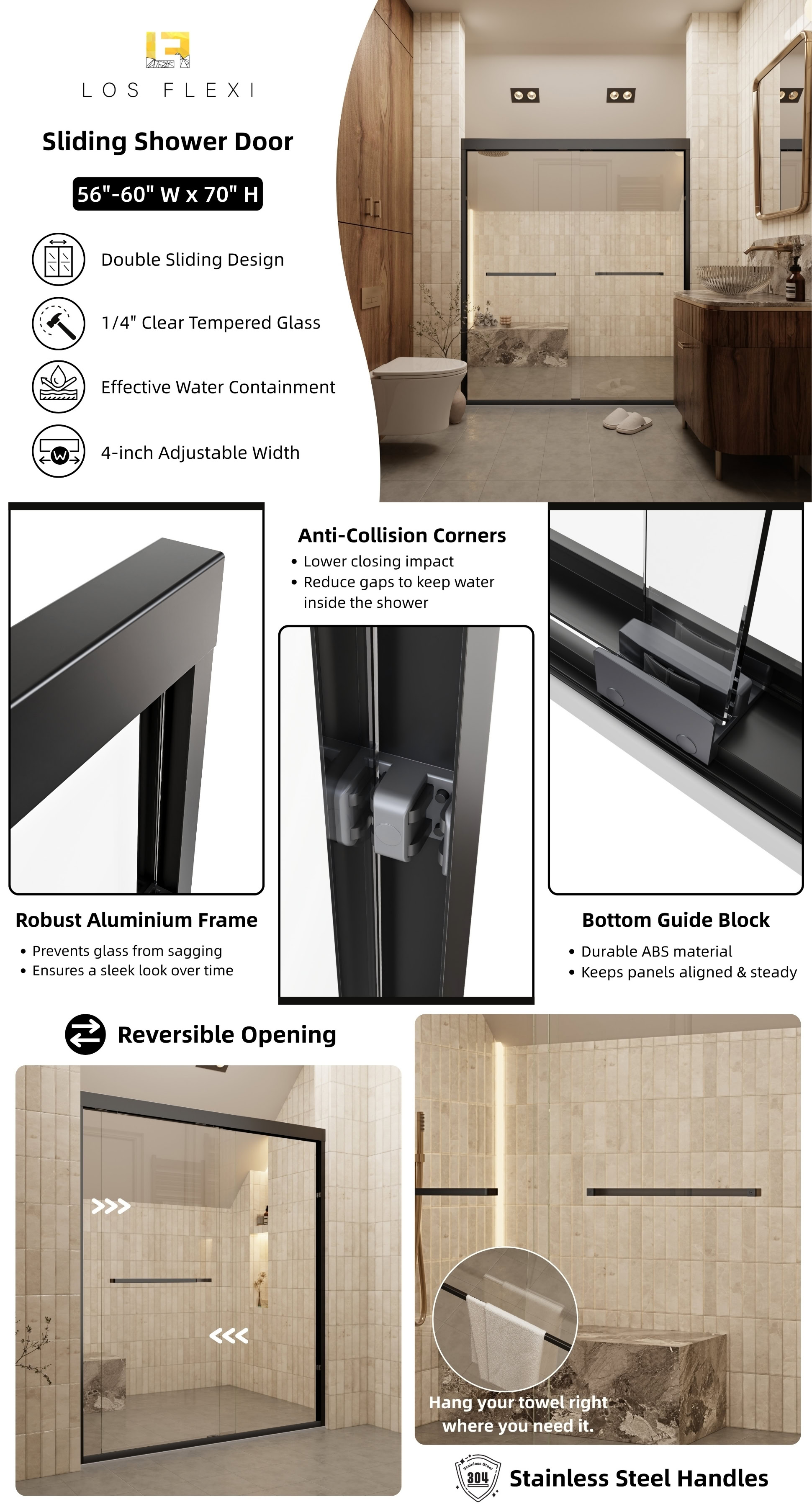 Upgrade your bathroom with the Los Flexi Double Sliding Shower Door (56–60″ W x 70″ H), built for a refined and easy-glide shower experience. The system features dual track rollers paired with 4 anti-collision buffers, helping ensure a smooth, controlled, and quiet sliding motion every time. Constructed from 1/4″ (6 mm) clear tempered glass and complemented by matte black stainless steel hardware, it delivers dependable durability while adding a clean, contemporary edge to your space. The transparent glass design also keeps your bathroom feeling open and bright. With up to 4 inches of adjustable width, this door offers greater installation flexibility to fit a range of shower layouts. Ideal for both updates and renovations, it combines modern styling, consistent performance, and practical adaptability in one streamlined solution.