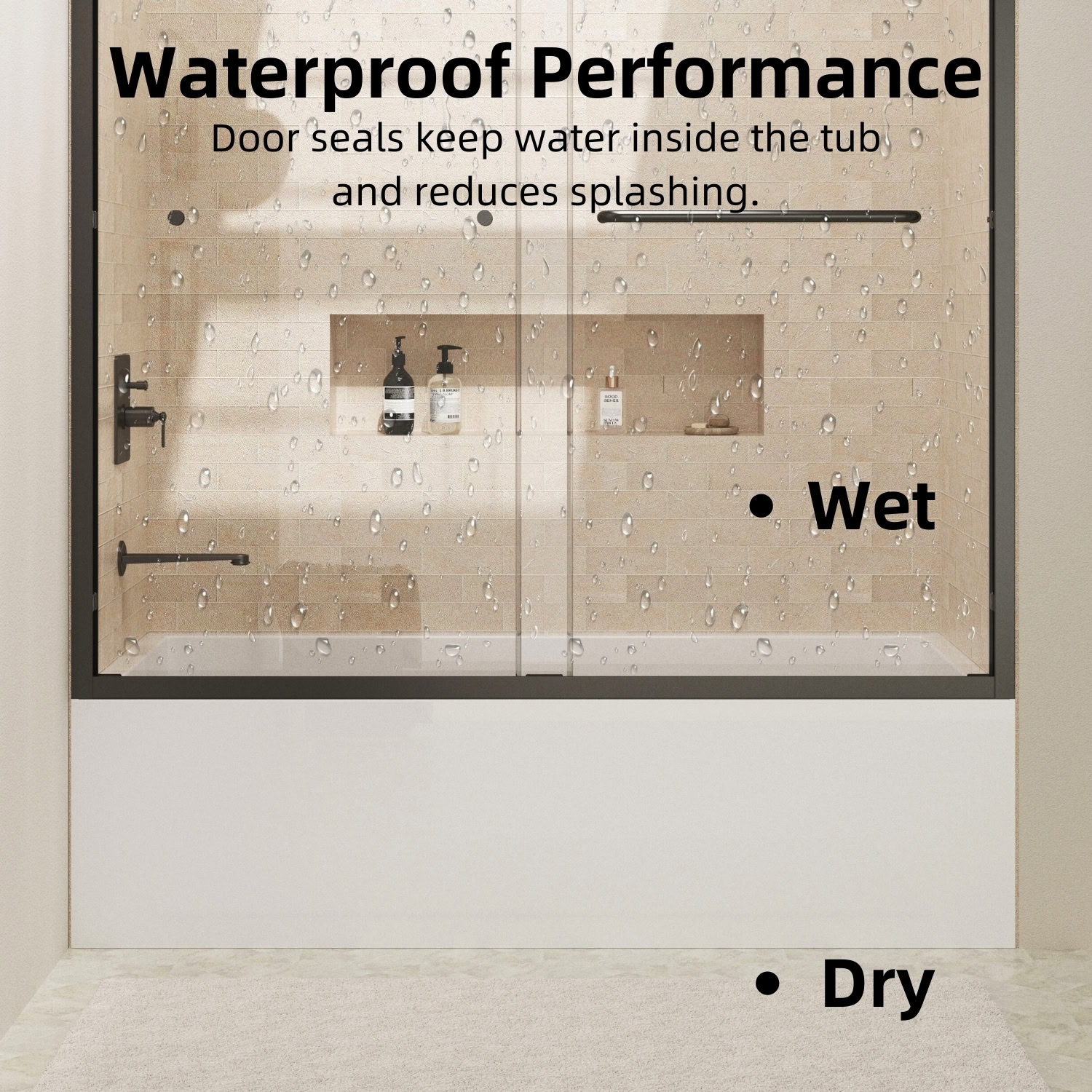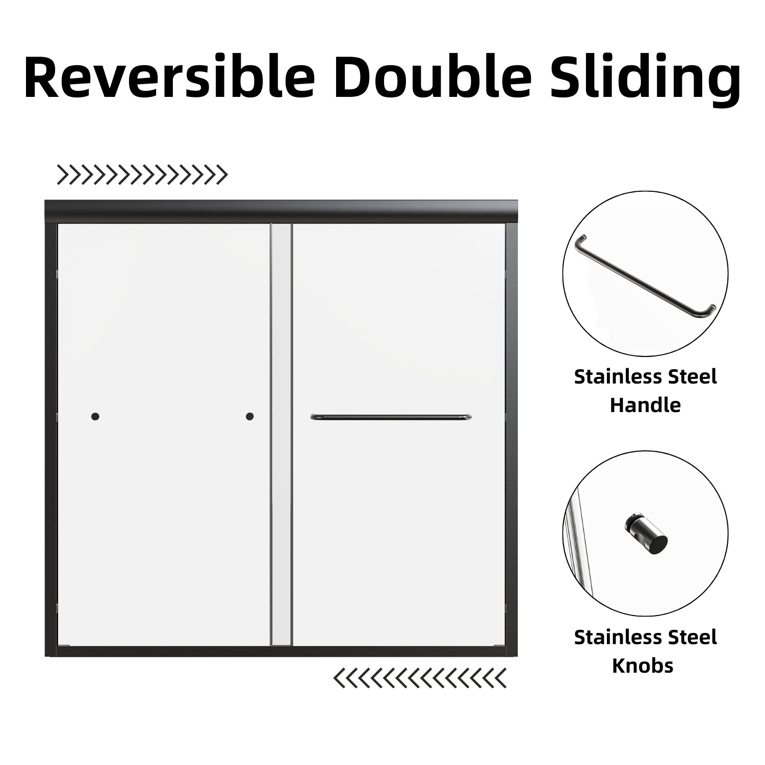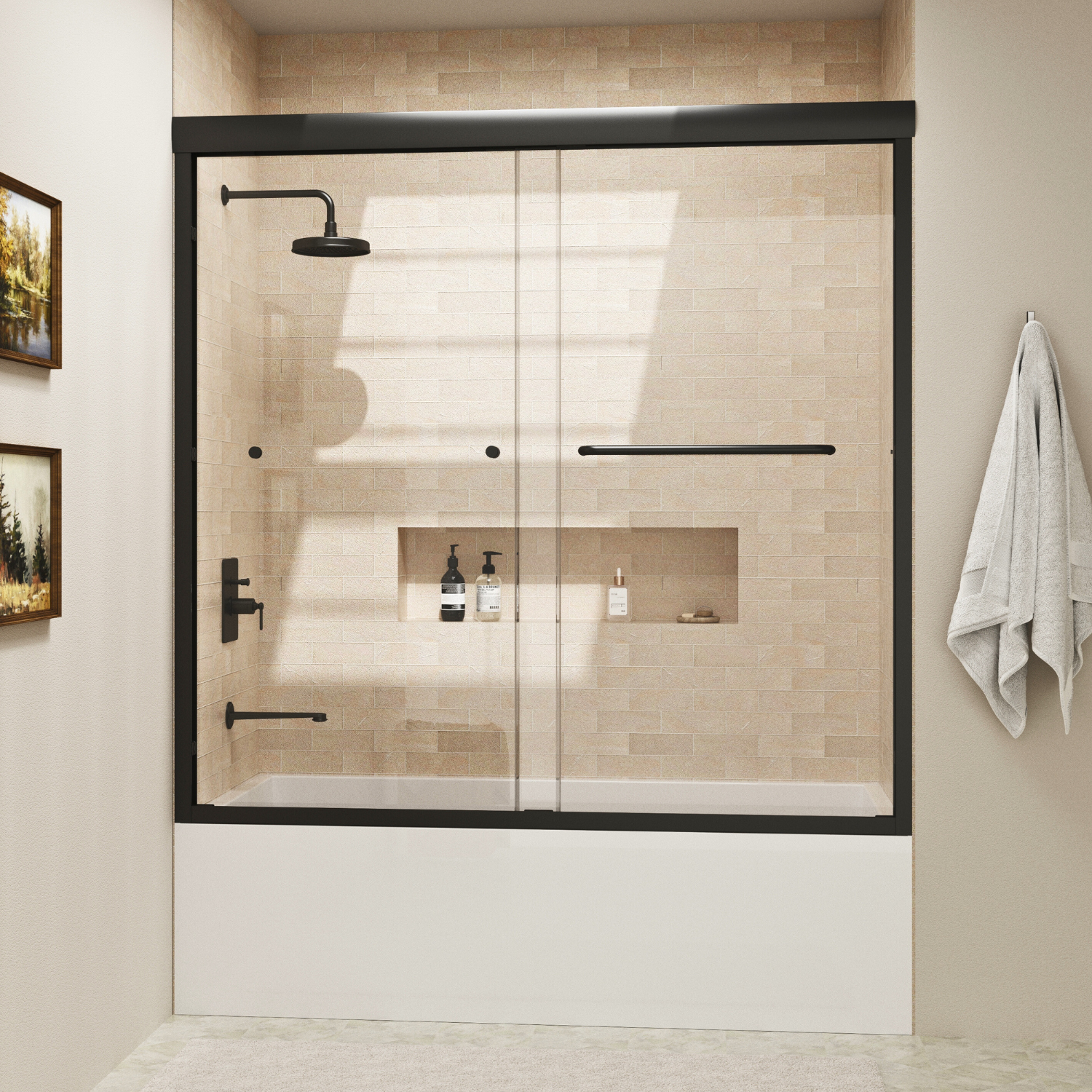 Define your bath space with this double sliding tub door (56″-60″ W x 58″ H). The structure features 6 mm tempered safety glass that meets SGCC and ANSI standards, supporting durability for daily use. The smooth dual roller operation system makes the bathtub shower door slide steadily and keeps the panel perfectly lined up. Anti-collision buffer protection helps the sliding bathtub door close gently, reducing impact over time. Both panels are designed to move in either direction for flexible entry.