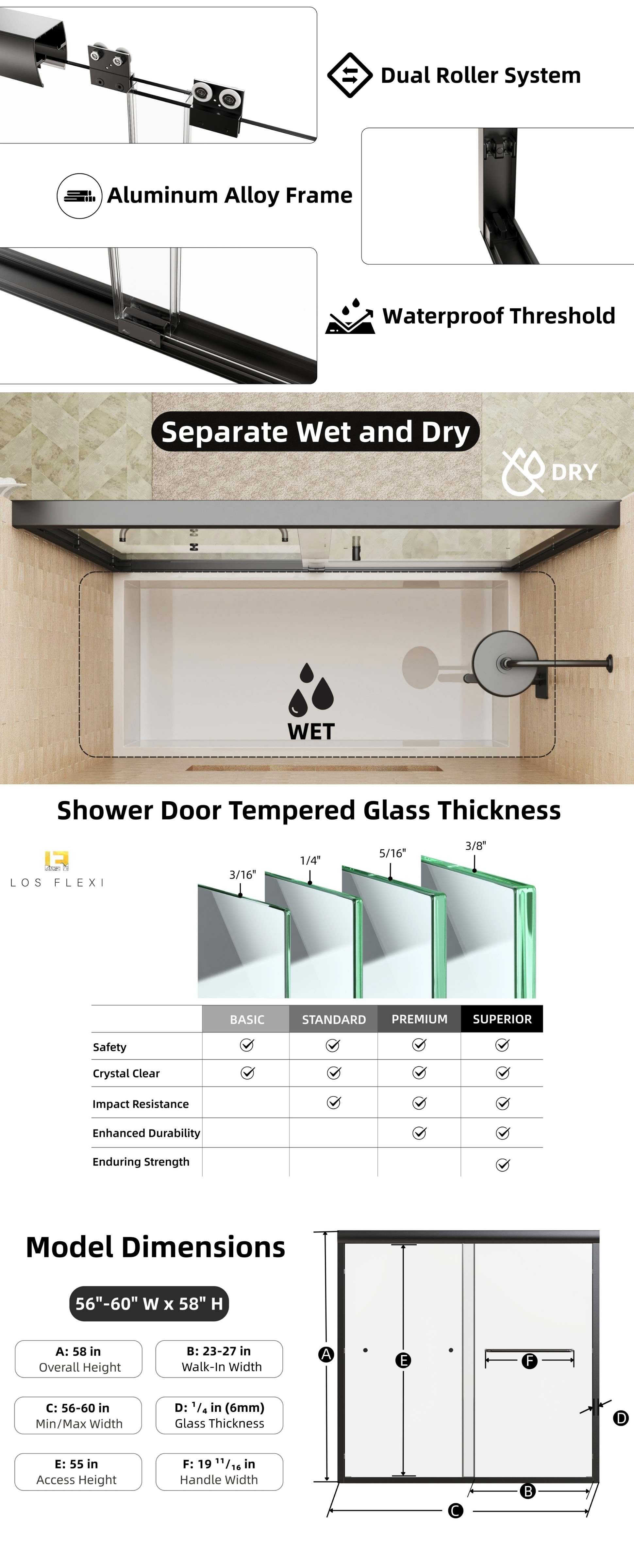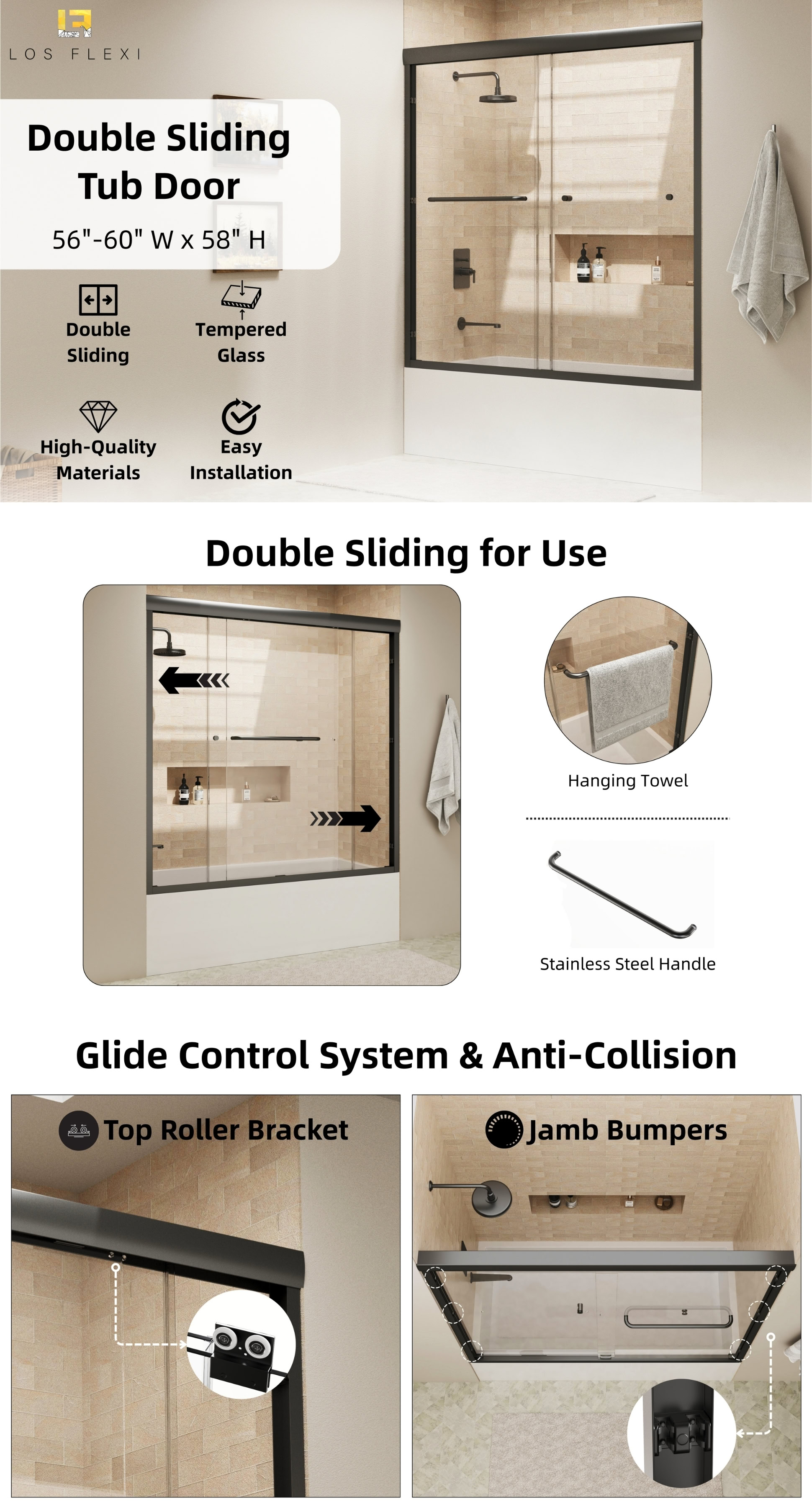Los Flexi Double Sliding Tub Door Matte Black 60″W x 58″H with 1/4″ Tempered Glass