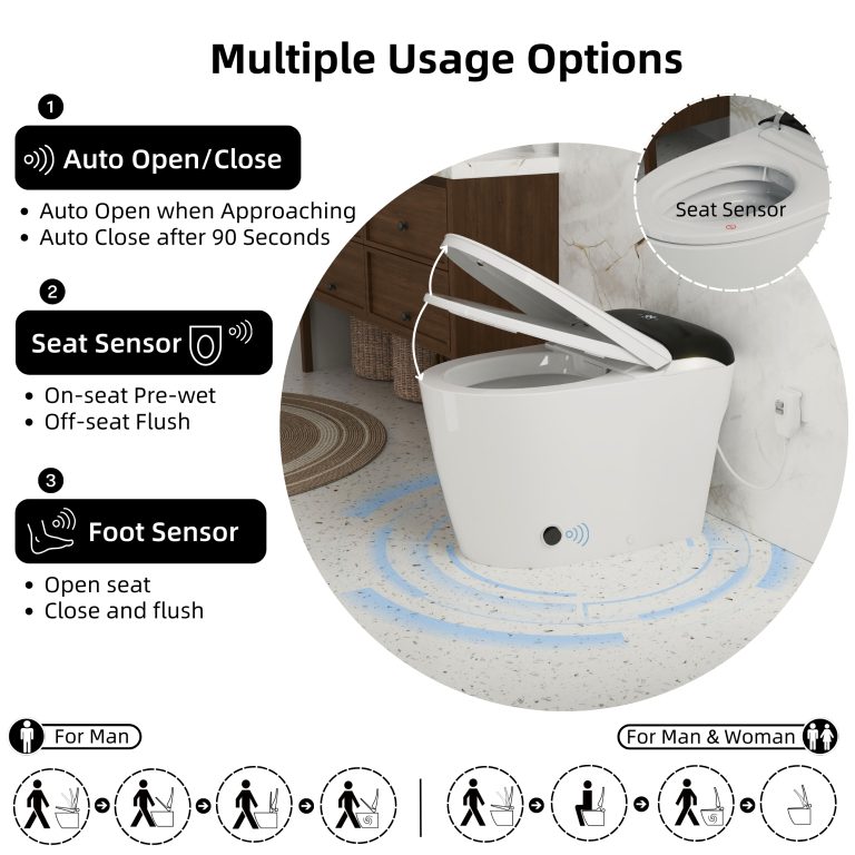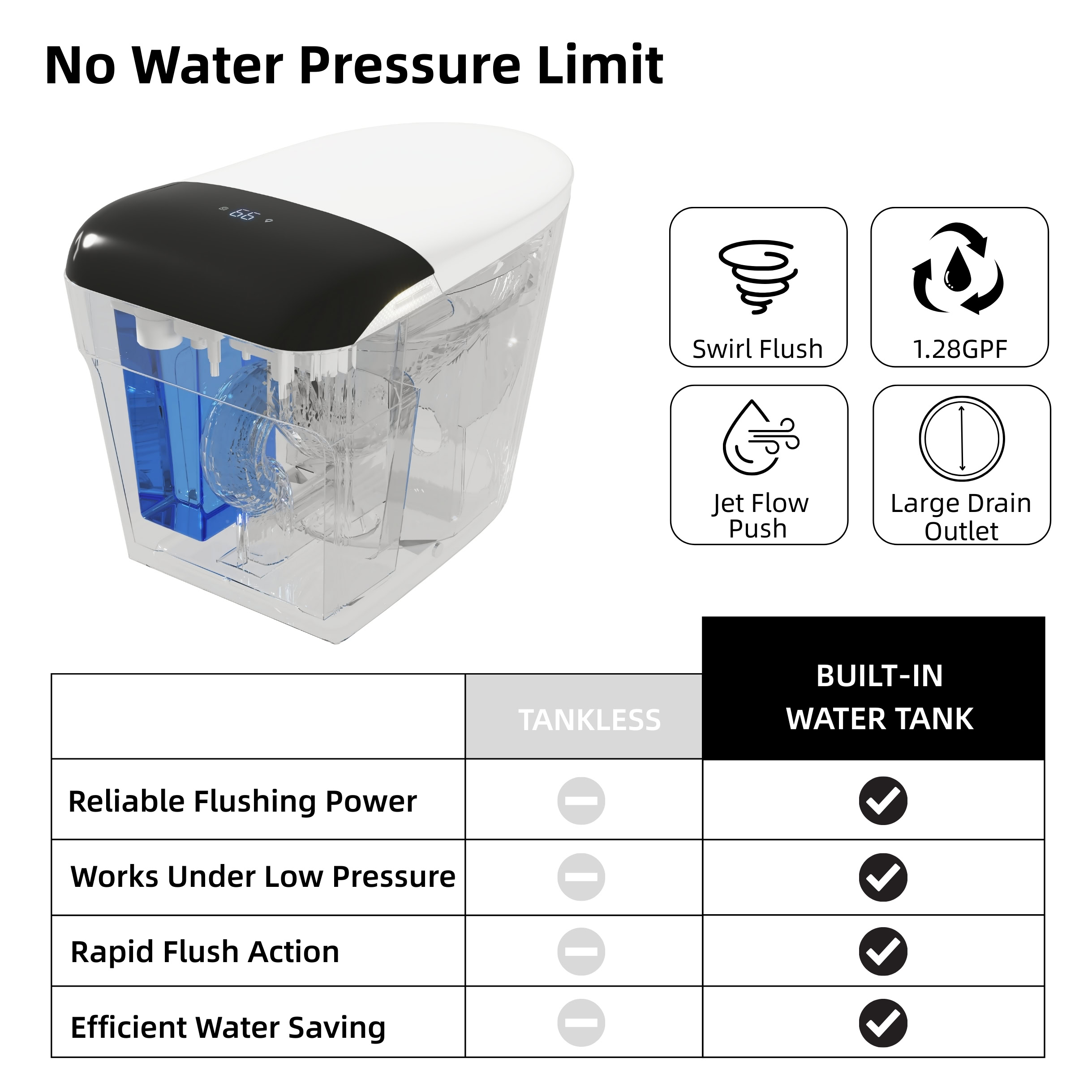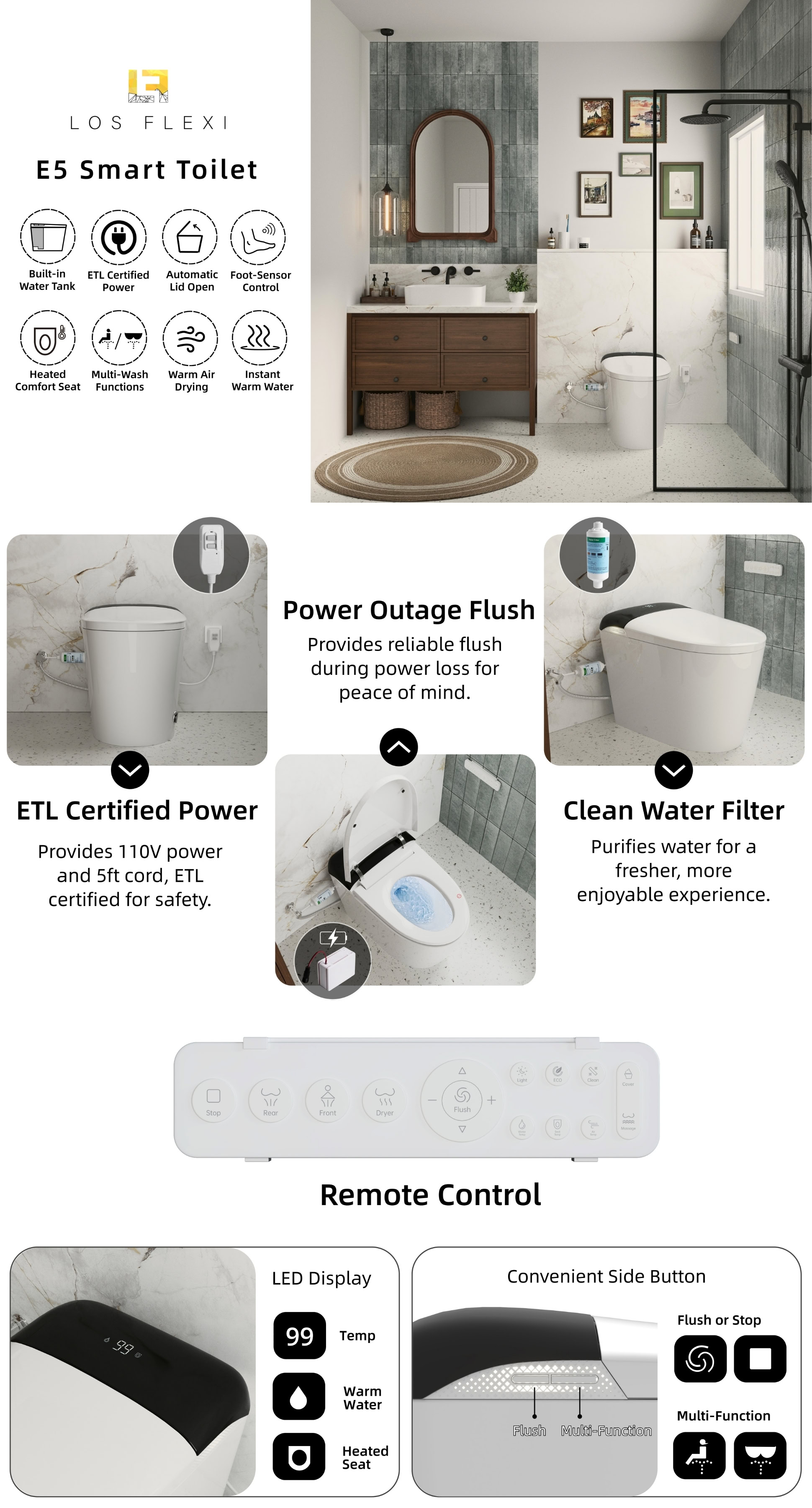 Built for reliability, the integrated water tank helps ensure stable flushing even in low water pressure environments. It is a smart choice for apartments and households with older plumbing. For added convenience and hygiene, this smart bidet toilet includes an automatic open/close lid, foot sensor control, remote operation, and auto flush with pre-wetting to help keep the bowl cleaner before each use. Powered by an ETL-listed plug, the Los Flexi E5 provides you with safe, dependable performance throughout the year.