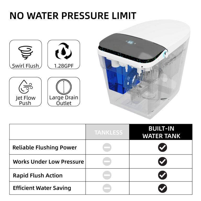 The Los Flexi E6 is an all-in-one white smart toilet with a built-in bidet, designed to deliver everyday comfort, reliability, and uncompromised cleanliness with the accessible premium price tag. Equipped with a built-in water tank, it not only saves space but also ensures consistent flushing even in environments with unstable or low water pressure, making it a smart modern solution for compact bathrooms and households with older plumbing systems.