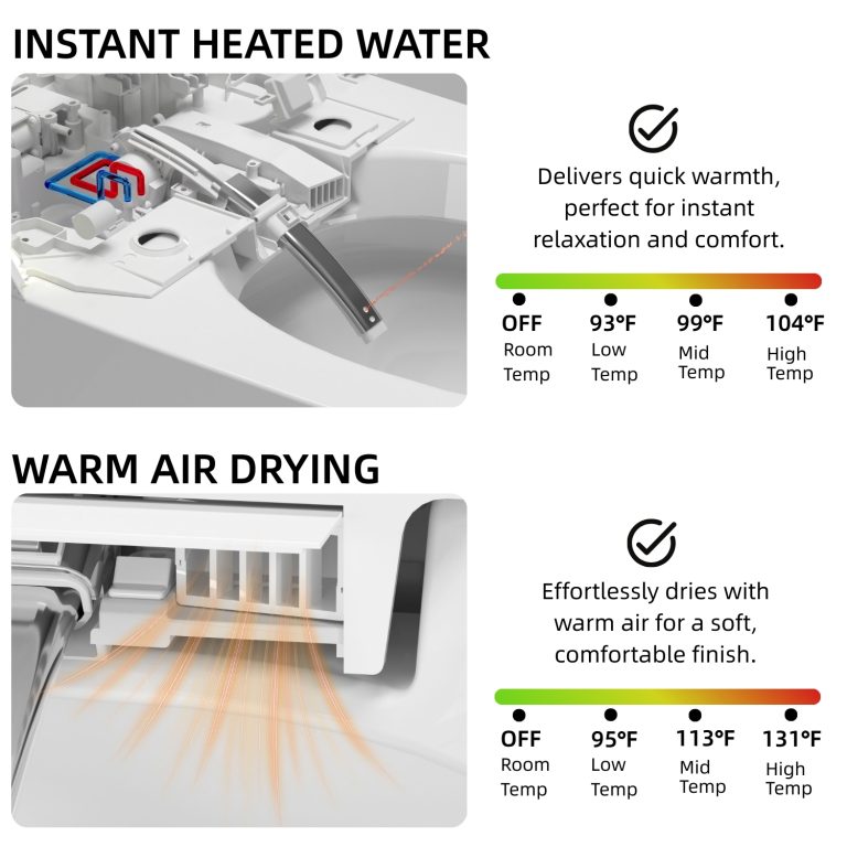 Say goodbye to cold seats in winter. The instant heating technology ensures continuous and adjustable warm water, comfortable seat warmth, and warm air breeze for every user. Designed with ultimate comfort in mind, this toilet offers multiple wash modes to meet your cleansing needs, such as hip wash, female wash, rear wash, and oscillating wash, while the adjustable nozzle position with a self-cleaning function creates a clean, spa-like cleansing experience with gentle care in every season.