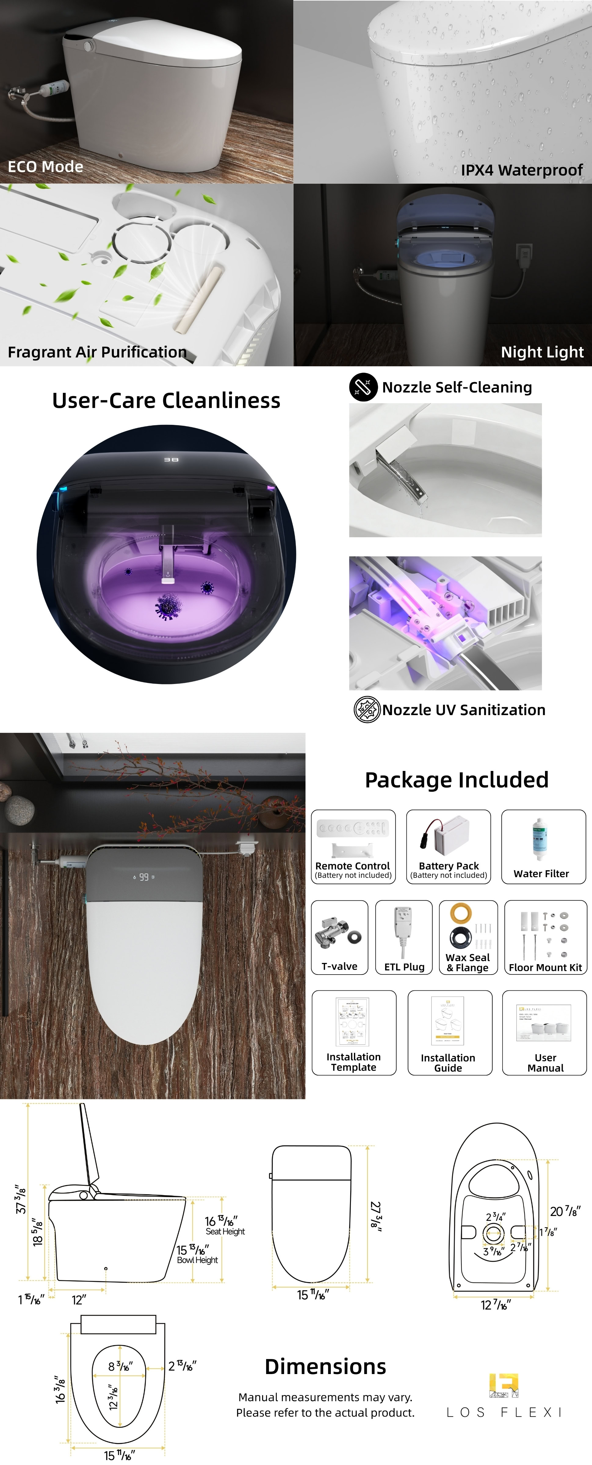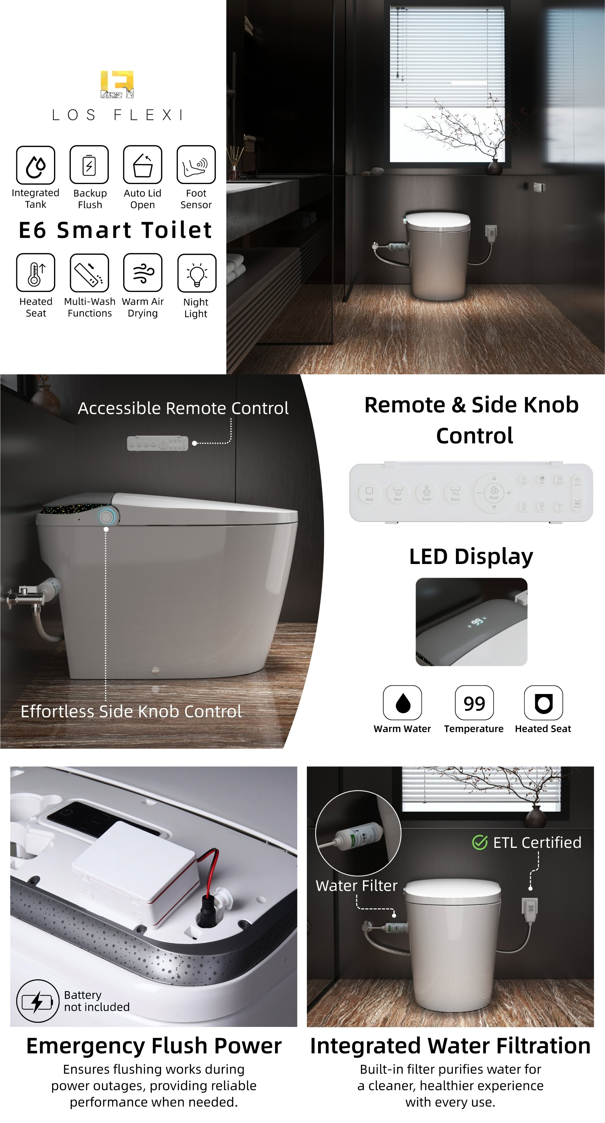 Los Flexi E6 Smart Toilet with Bidet, Built-In Tank, Auto Lid, Foot Sensor, Warm Water, Heated Seat, Air Dryer, UV Nozzle Light, Remote Control