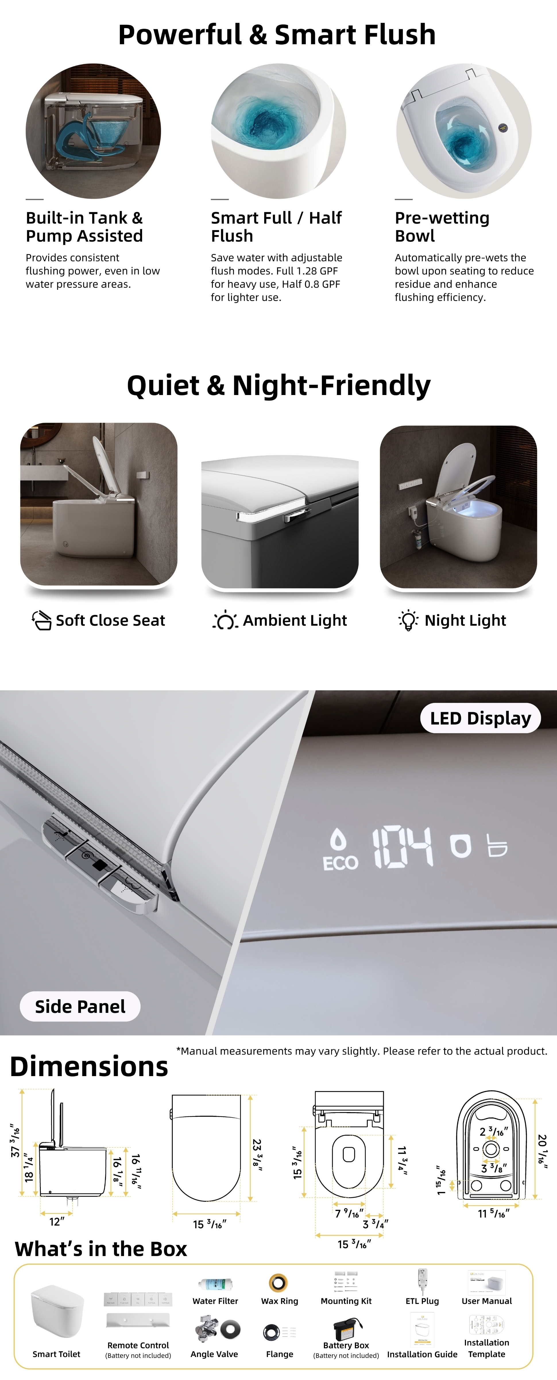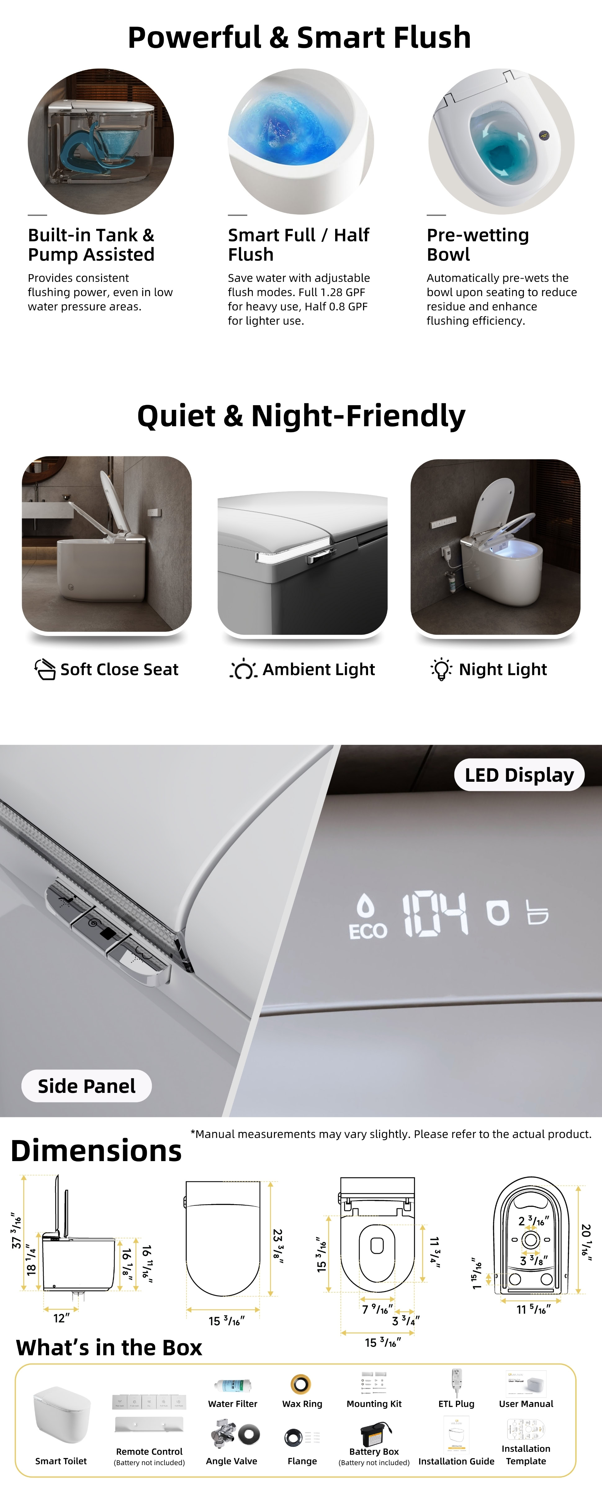 The Los Flexi E81 Compact Smart Toilet seamlessly blends innovation and comfort, ideal for smaller spaces and modern remodels. Its built-in water tank ensures powerful, consistent flushing, even under low water pressure. The rimless one-piece design provides effortless cleaning with smooth surfaces and fewer hard-to-reach spots. Indulge in a luxurious bidet experience with instant warm water, customizable temperature, pressure, and nozzle positions, all for a personalized clean. Designed for convenience, it features a self-cleaning nozzle, deodorization, LED display, and night light. With safety in mind, it includes a power-outage flush system and ETL certification, ensuring reliable performance every day.