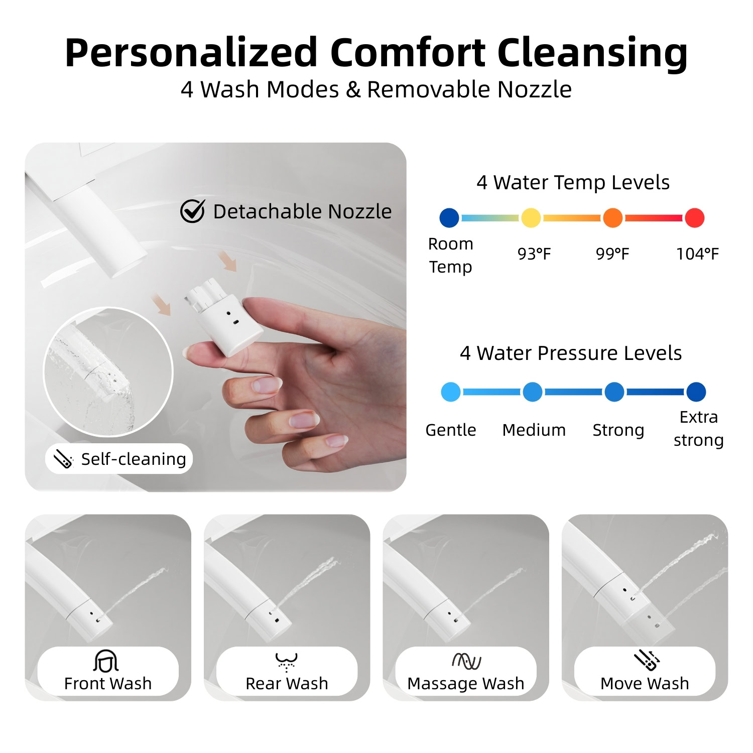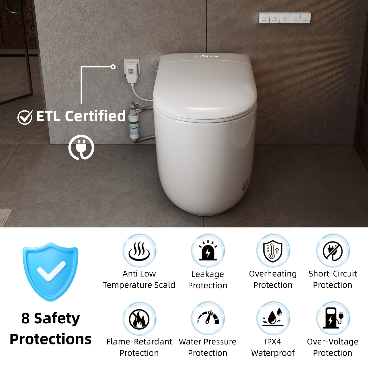 The Los Flexi E81 Compact Smart Toilet seamlessly blends innovation and comfort, ideal for smaller spaces and modern remodels. Its built-in water tank ensures powerful, consistent flushing, even under low water pressure. The rimless one-piece design provides effortless cleaning with smooth surfaces and fewer hard-to-reach spots. Indulge in a luxurious bidet experience with instant warm water, customizable temperature, pressure, and nozzle positions, all for a personalized clean. Designed for convenience, it features a self-cleaning nozzle, deodorization, LED display, and night light. With safety in mind, it includes a power-outage flush system and ETL certification, ensuring reliable performance every day.
