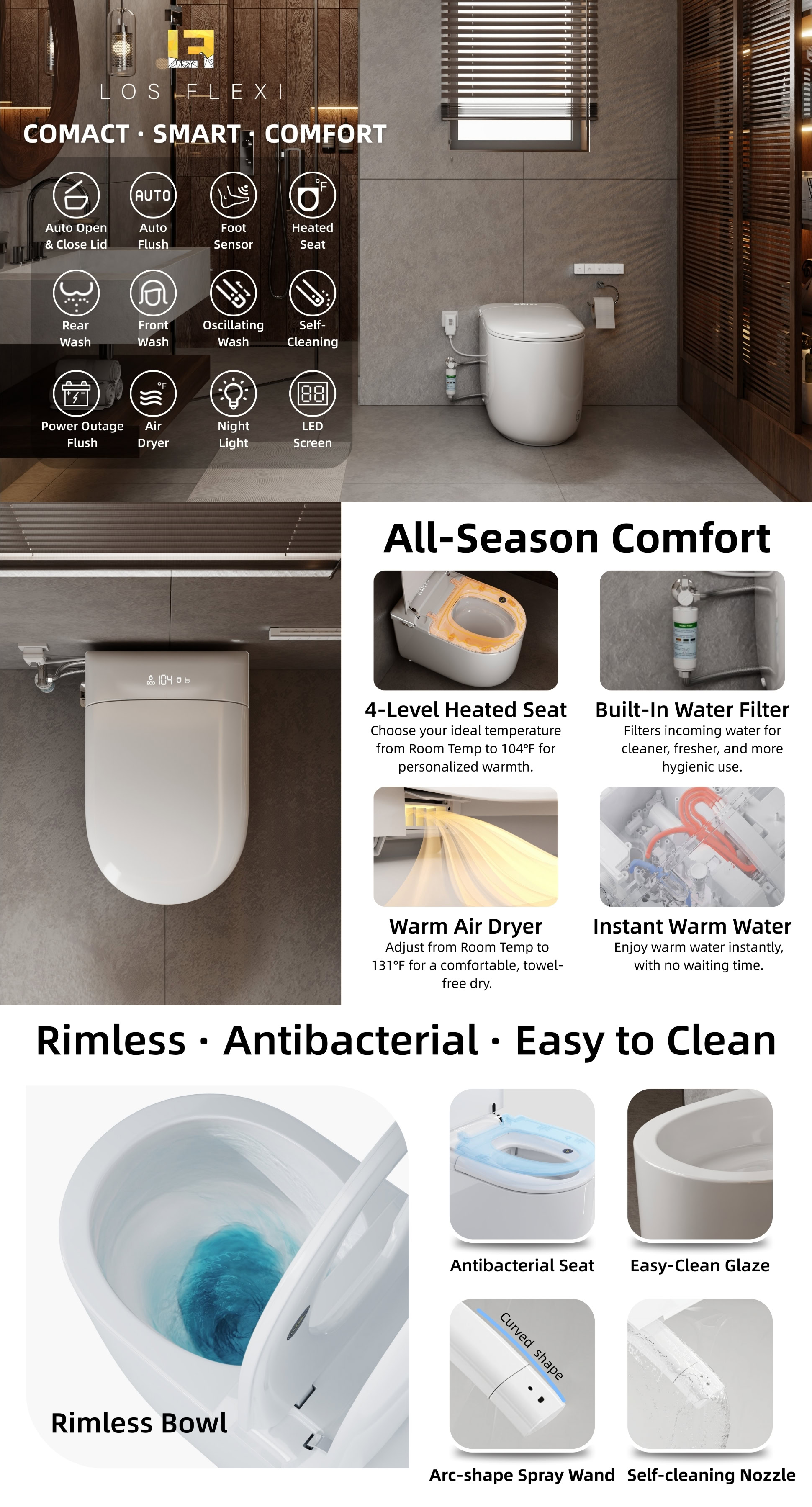 Los Flexi E81 Compact Smart Toilet, Rimless One-Piece Design, Built-In Water Tank, Instant Warm Water Bidet, Heated Seat, Foot Sensor, ETL Certified, Remote Control