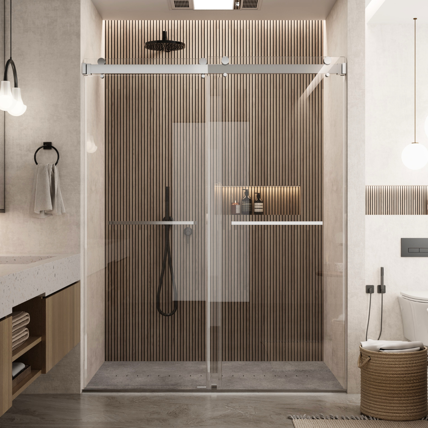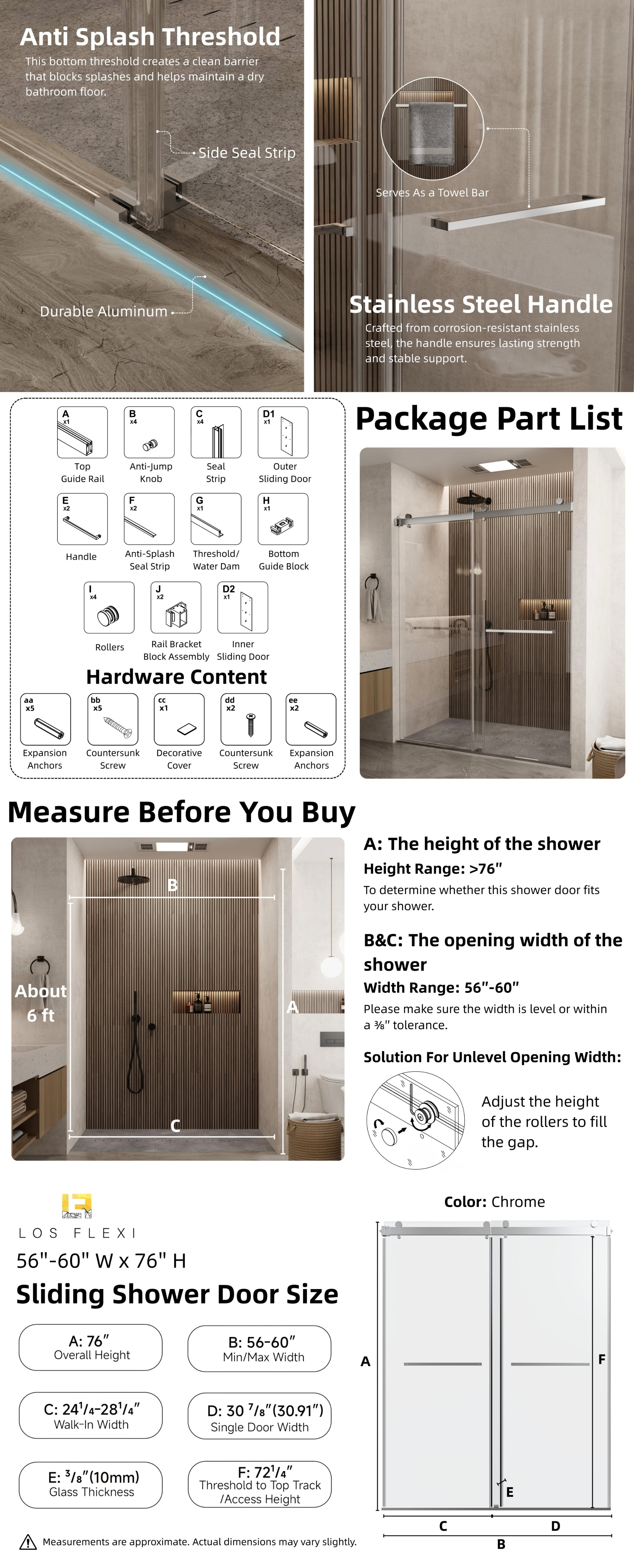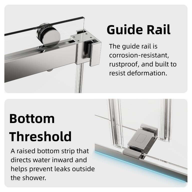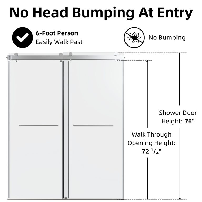 The frameless sliding shower door brings a clean, modern upgrade to a wide range of bathroom setups. Its adjustable 56″–60″ width and 76″ height allow it to fit comfortably into varied spaces while keeping the area bright and open. The clear tempered glass pairs with chrome stainless steel hardware to create a refined, contemporary look. A full water-control system—featuring continuous aluminum seals and a dedicated threshold—helps keep water inside the enclosure and maintains a neat floor. The 3/8-inch tempered glass meets ANSI standards and is designed to reduce visible water marks, making everyday upkeep more manageable. Smooth stainless steel rollers allow both panels to glide quietly, and the reversible entry option gives added flexibility during installation. With included hardware and clear illustrated instructions, setup is straightforward, supported further by helpful customer care and a 1-year limited coverage.