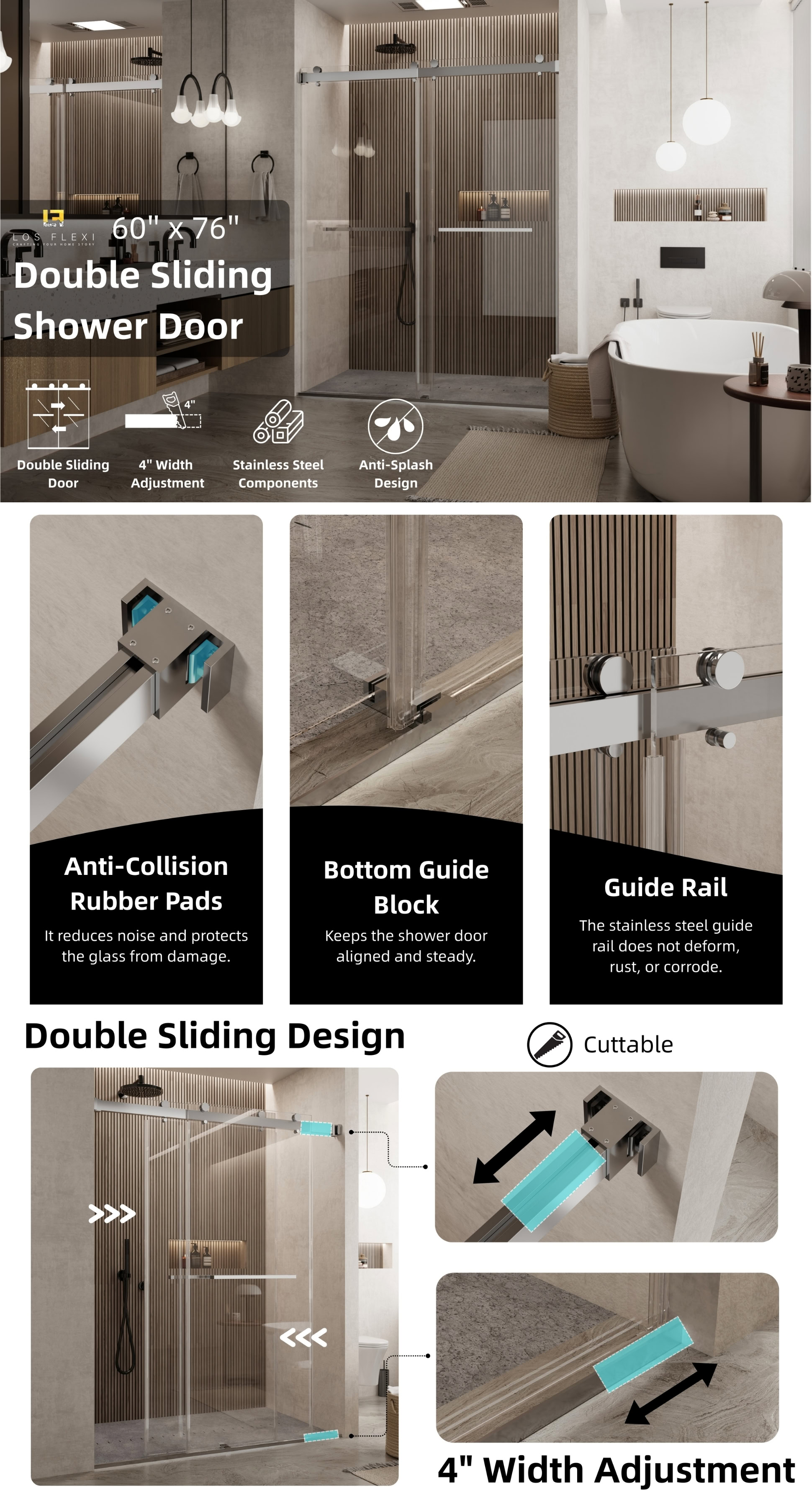 Los Flexi Frameless Double Sliding Shower Door 60″ W x 76″ H Chrome with 3/8″ Tempered Glass