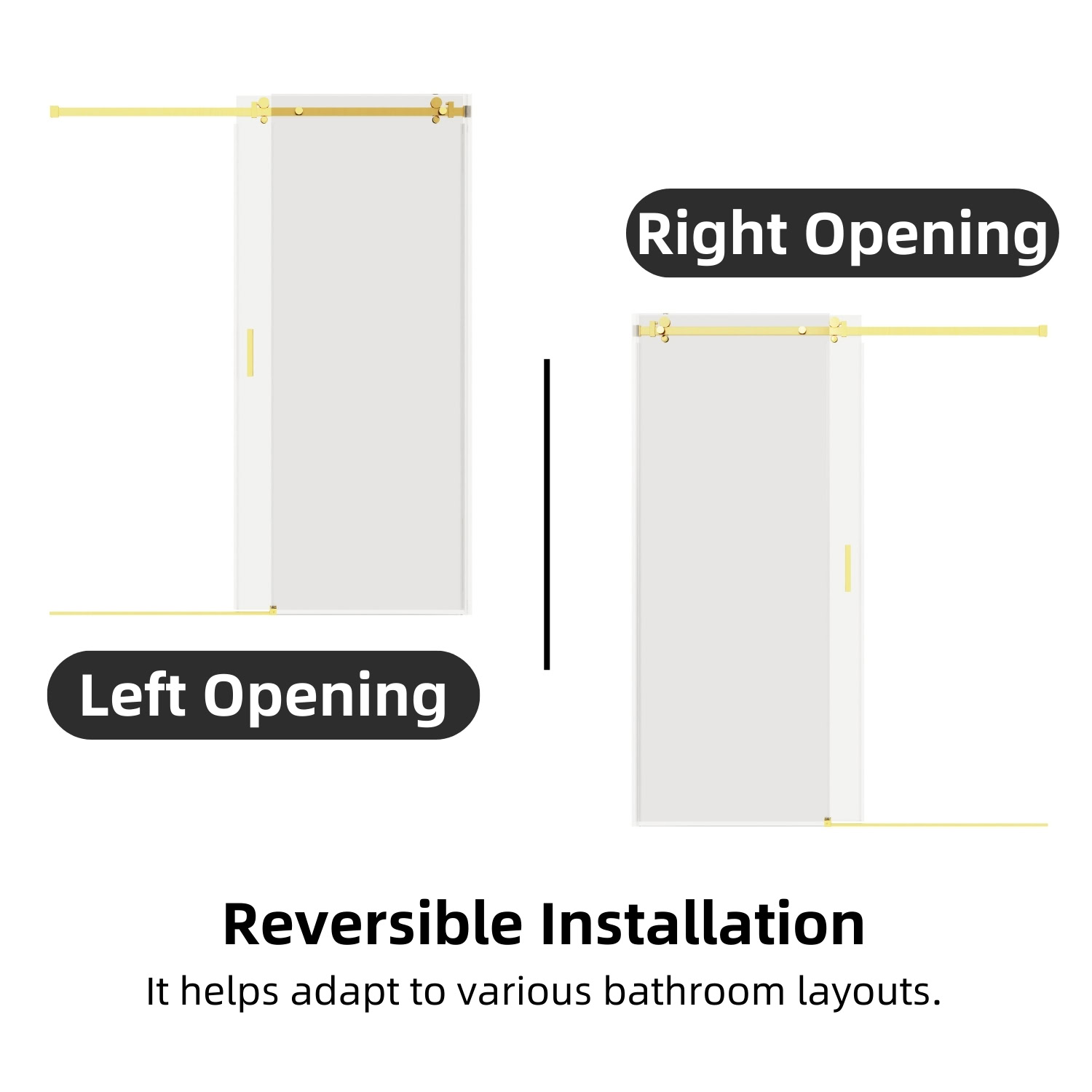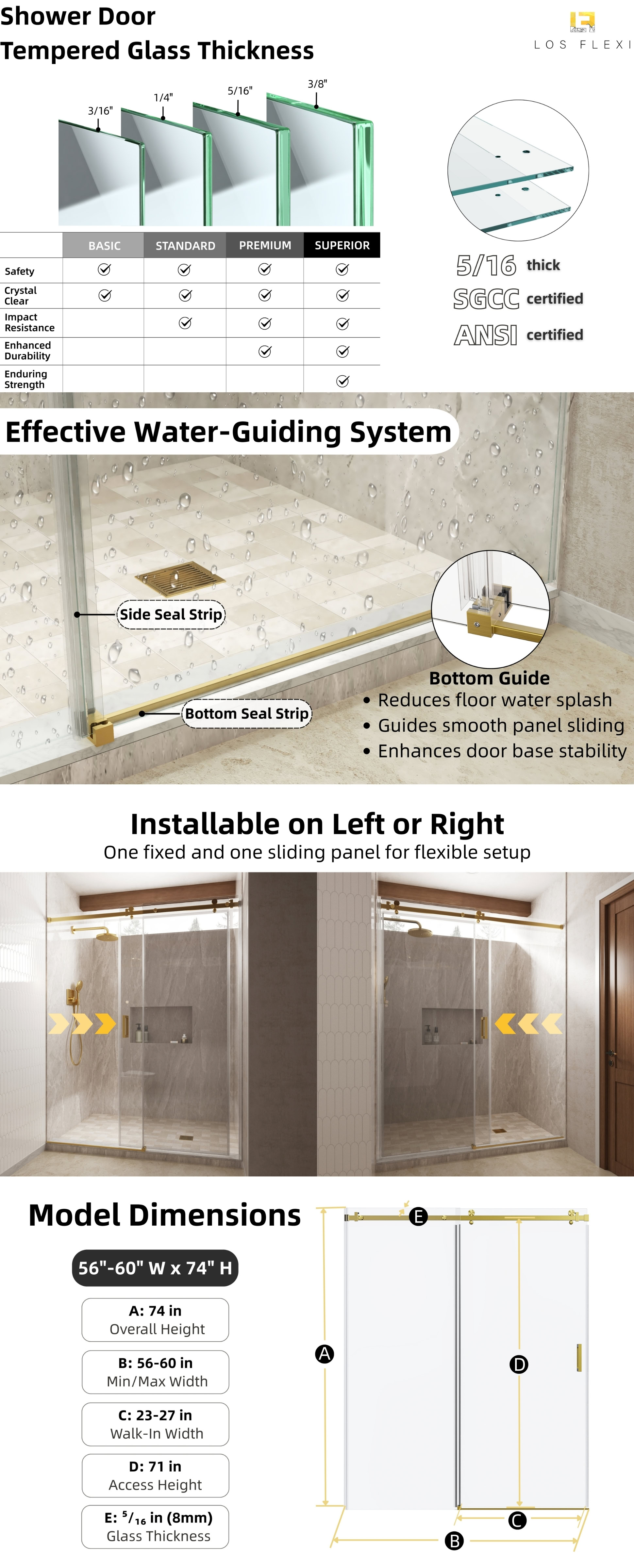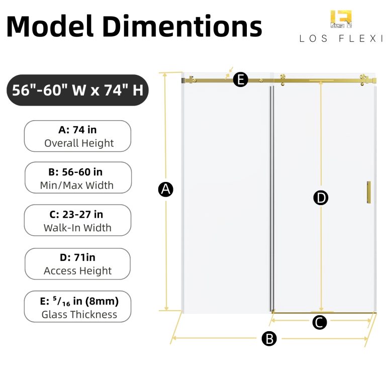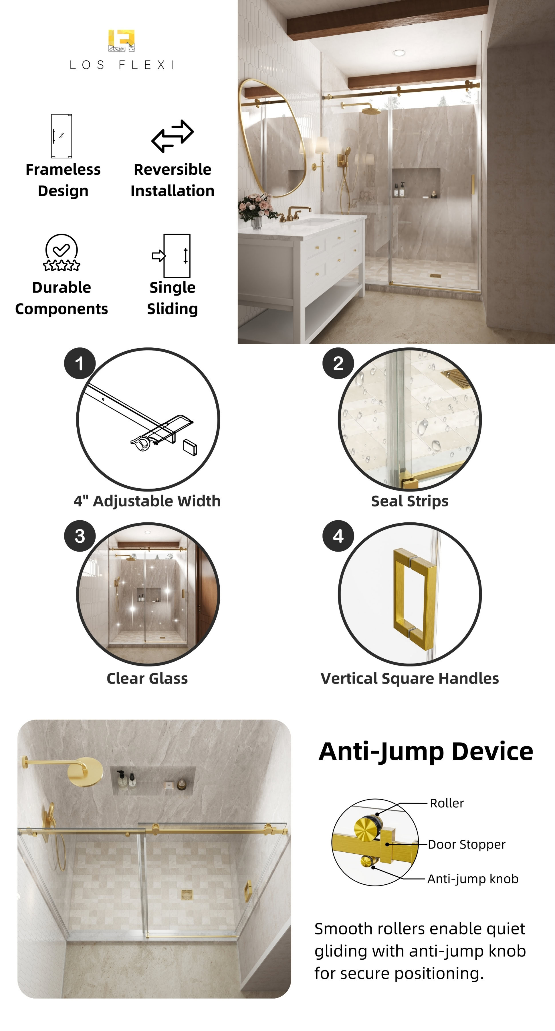 Invest in style and lasting quality with the Los Flexi brushed gold frameless sliding door (56″-60″ W). The clear 8 mm (5/16 in.) tempered glass instantly adds a high-end look while providing solid durability that meets SGCC/ANSI safety standards. It’s fully reversible for simple left or right installation and adjusts easily to fit your specific opening. The secure anti-jump system guarantees the panel slides reliably every single time.