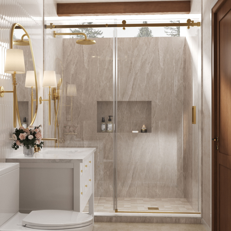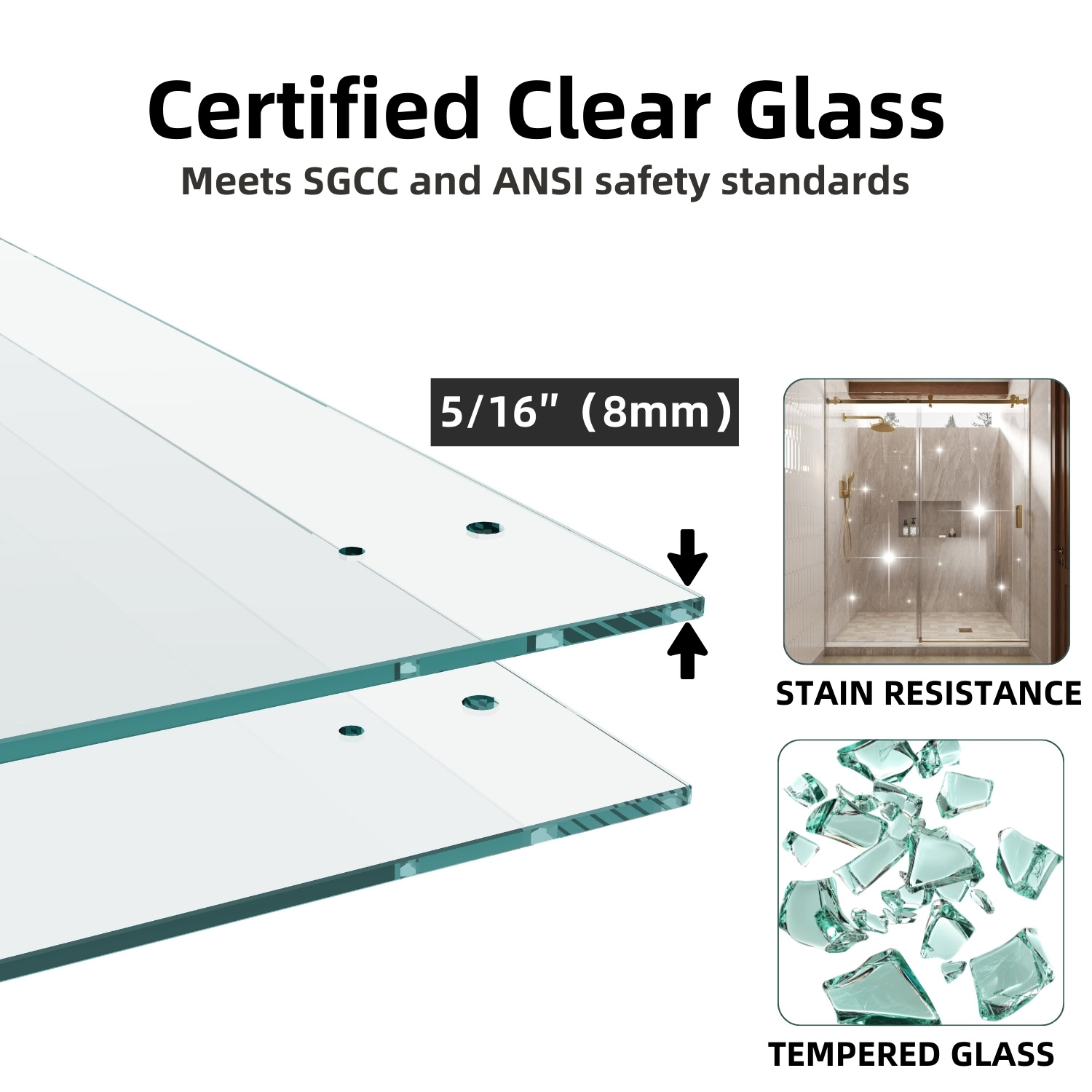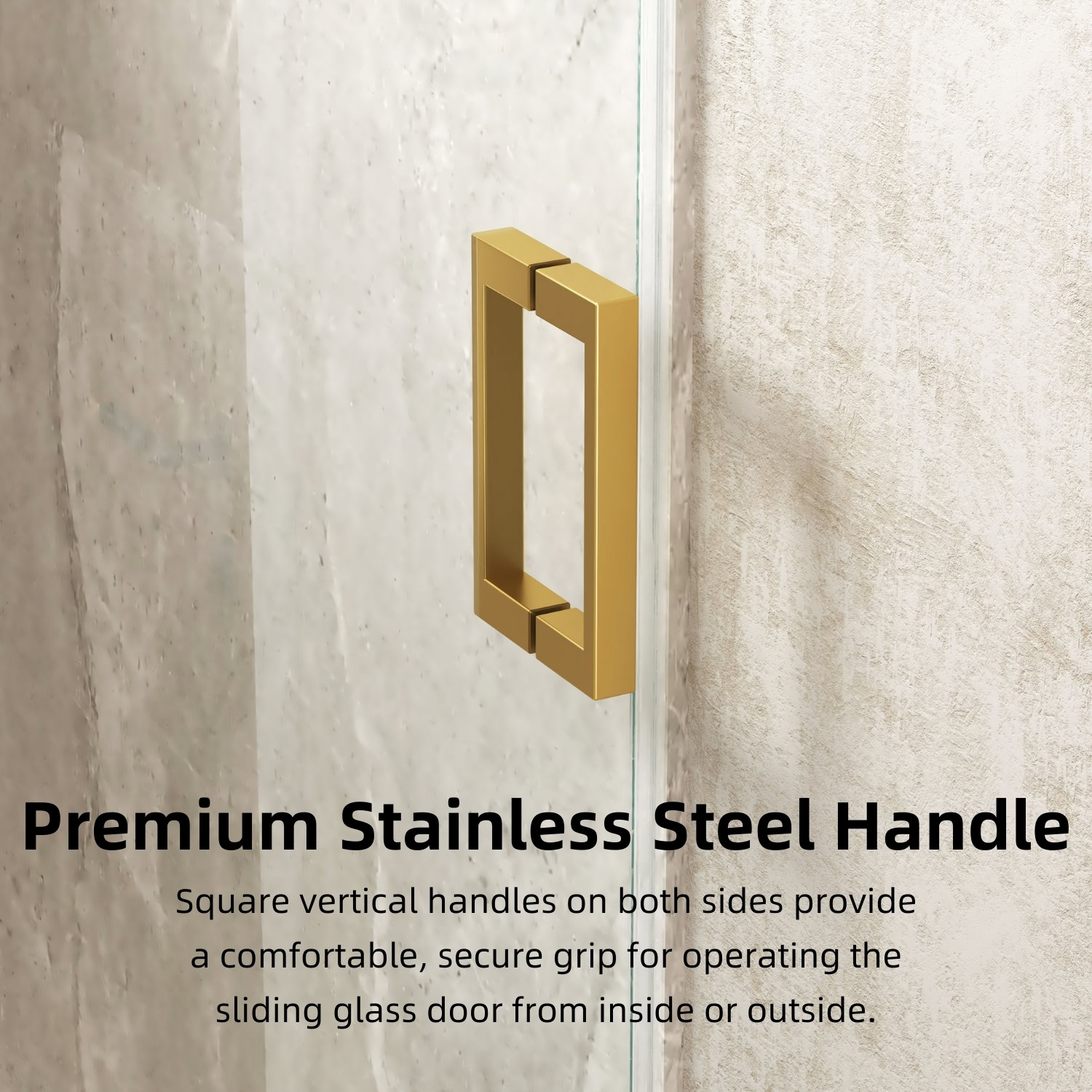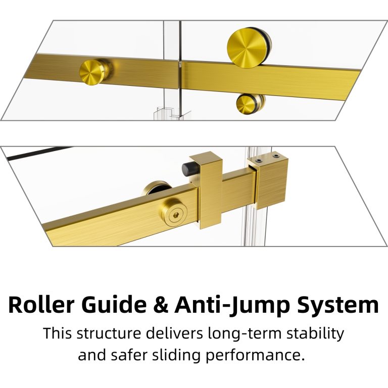 Invest in style and lasting quality with the Los Flexi brushed gold frameless sliding door (56″-60″ W). The clear 8 mm (5/16 in.) tempered glass instantly adds a high-end look while providing solid durability that meets SGCC/ANSI safety standards. It’s fully reversible for simple left or right installation and adjusts easily to fit your specific opening. The secure anti-jump system guarantees the panel slides reliably every single time.