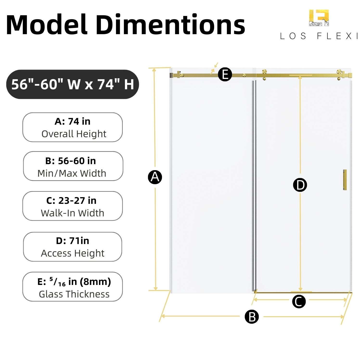 Los Flexi Frameless Single Sliding Shower Door 60″W x 74″H Brushed Gold with 5/16″ Tempered Glass