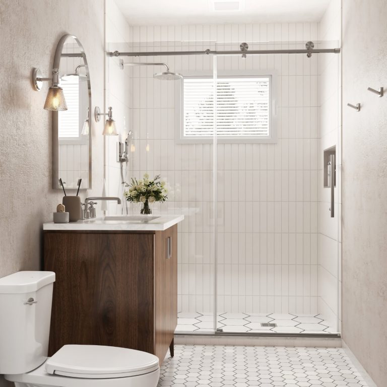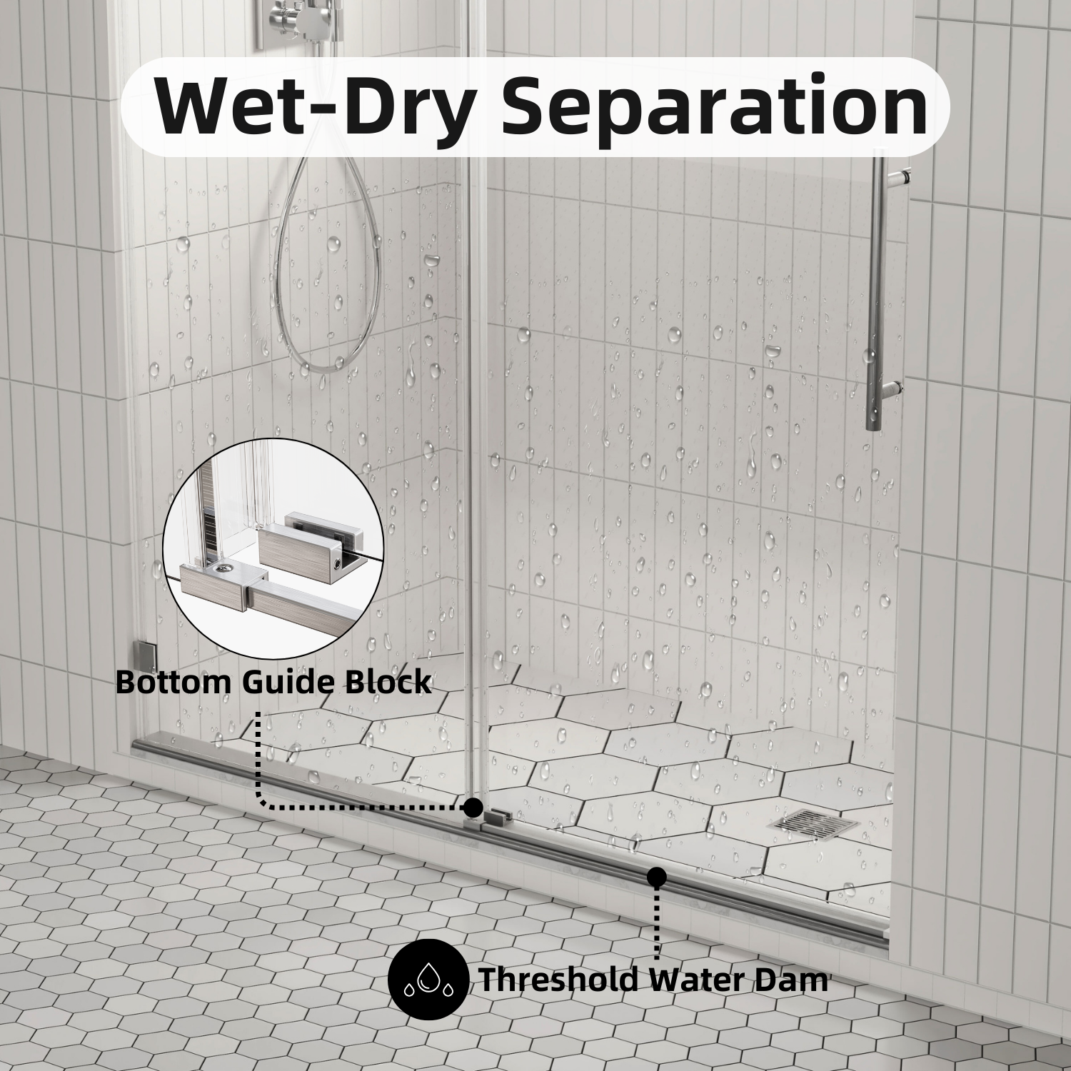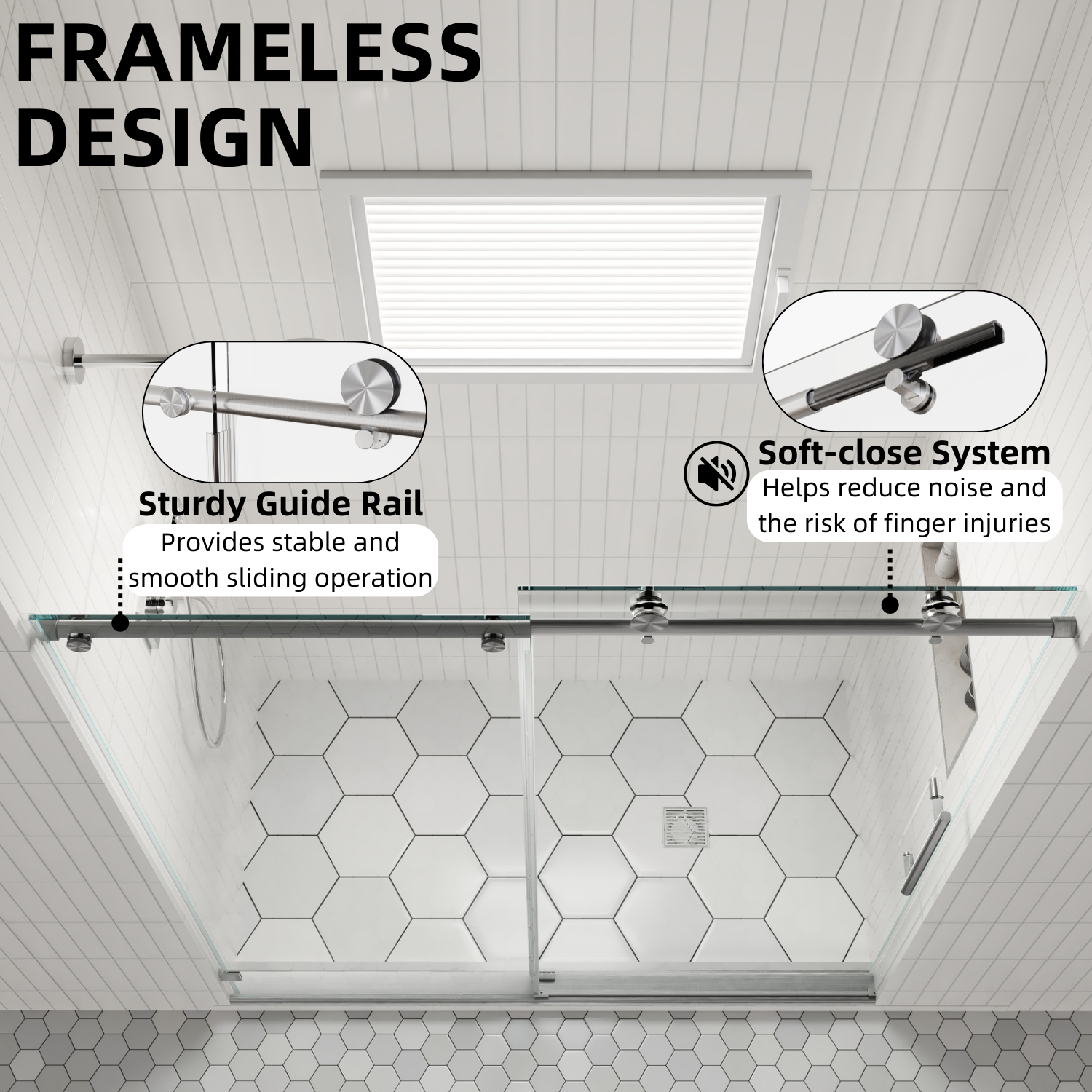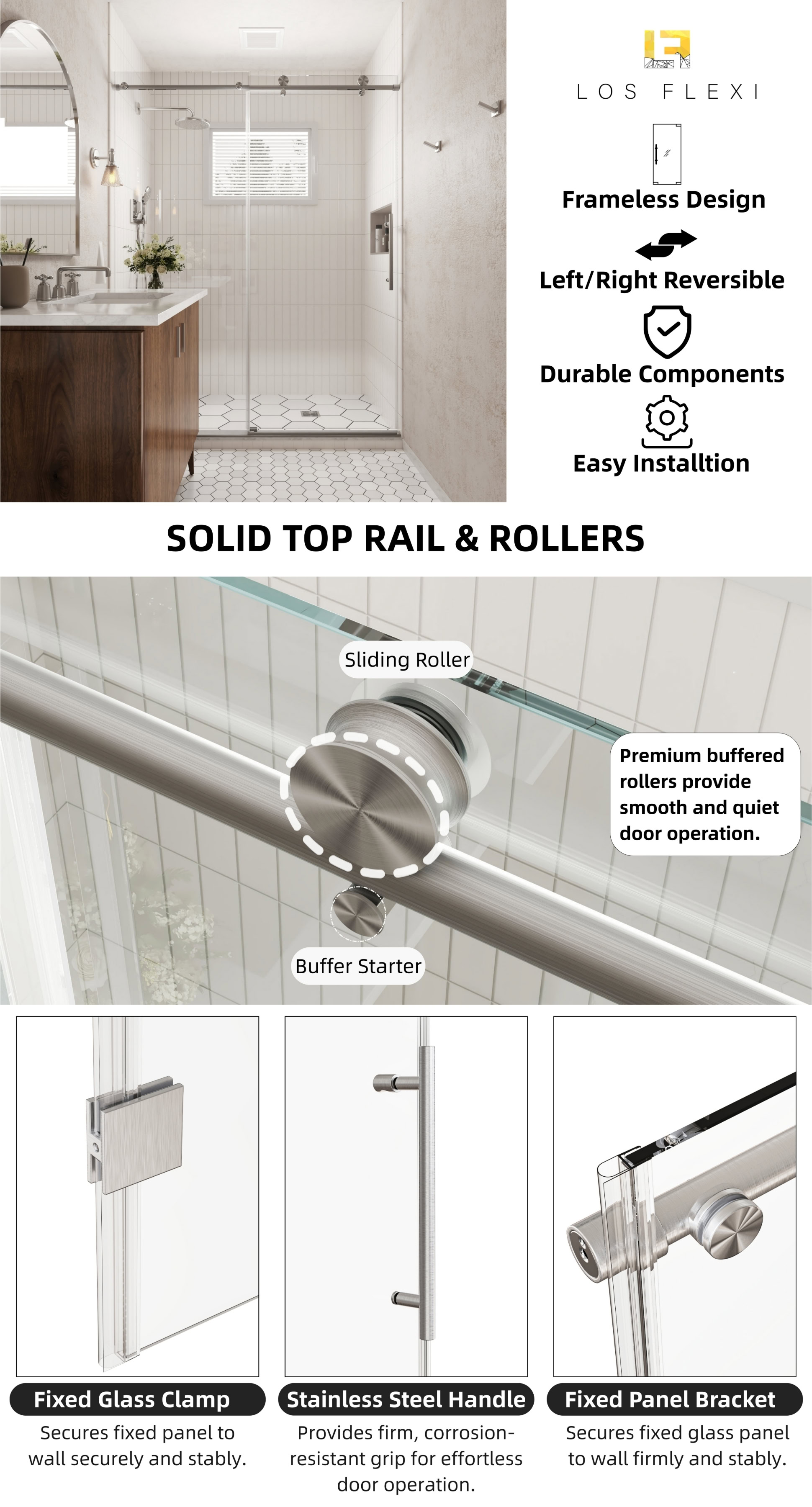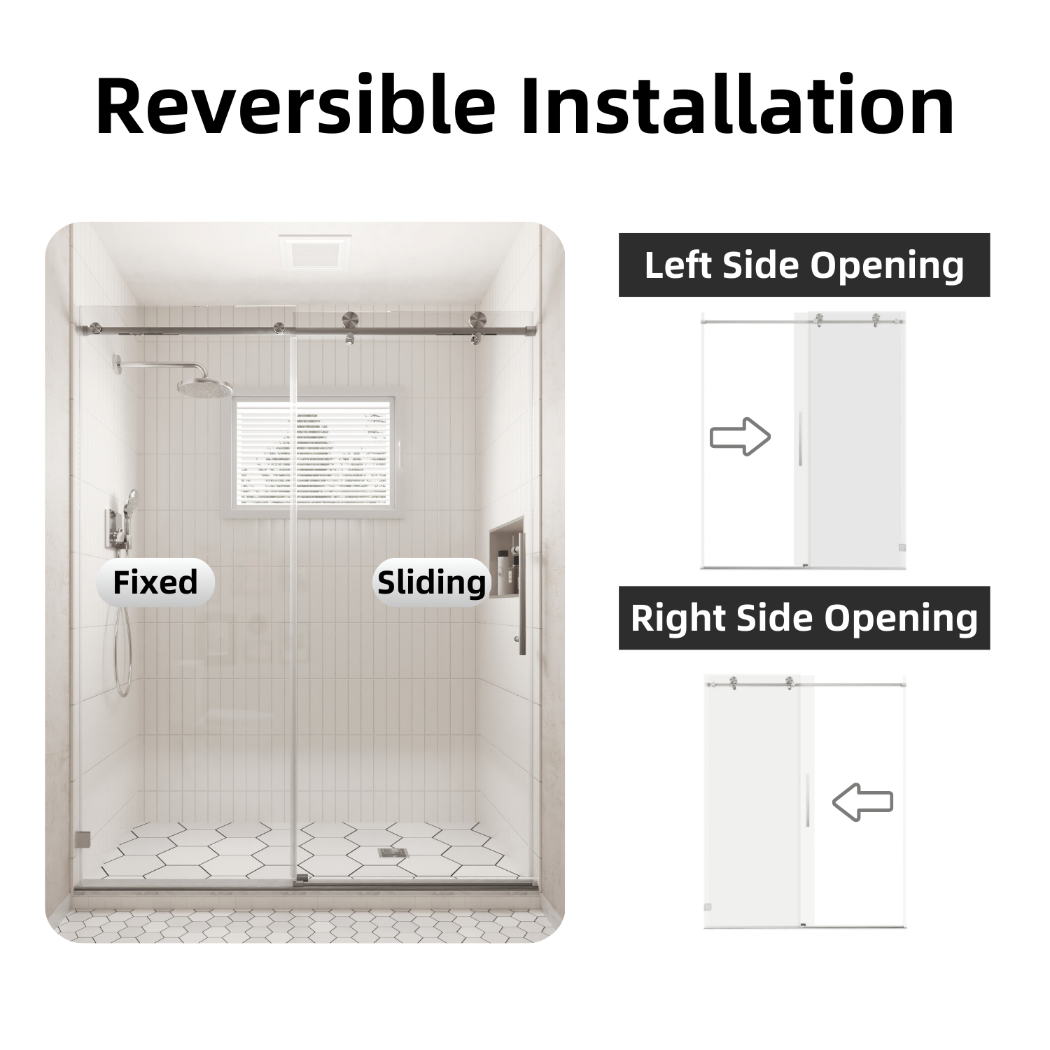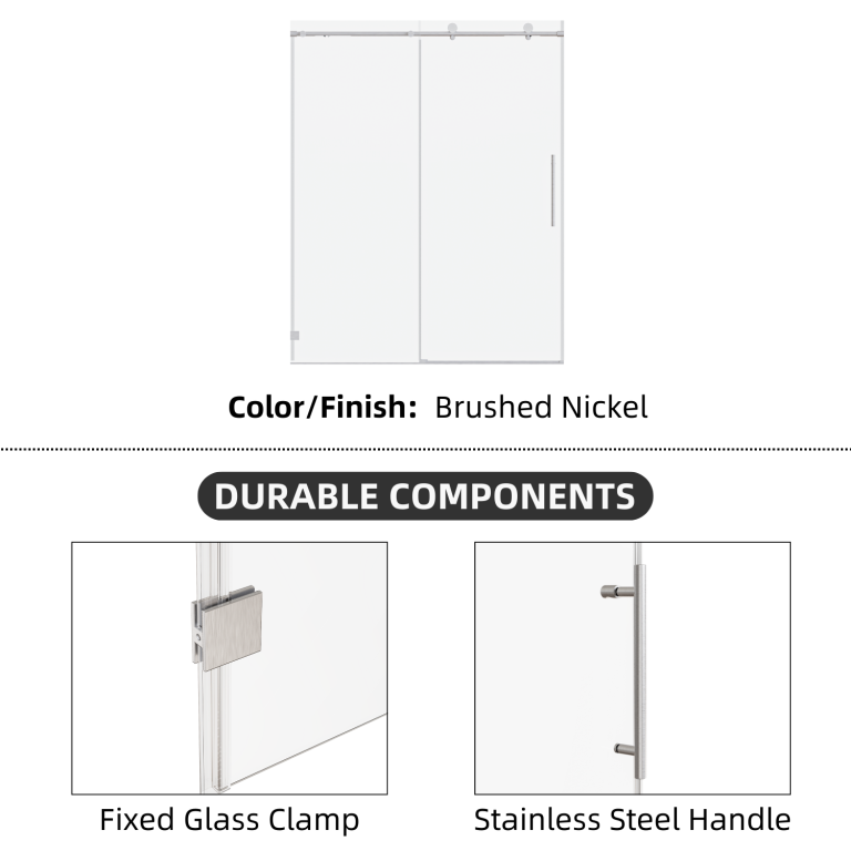 This brushed nickel frameless single sliding door (56″-60″ W) gives your bathroom a clean, modern update. The stainless steel hardware supports an open look while ensuring the structure is robust and steady. Crafted with 8mm SGCC-tempered glass, the panel delivers excellent clarity and high strength for daily use. Experience superior operation with the integrated quiet soft-close system. This dual damping setup ensures the door closes smoothly and silently, reducing noise and wear over time.