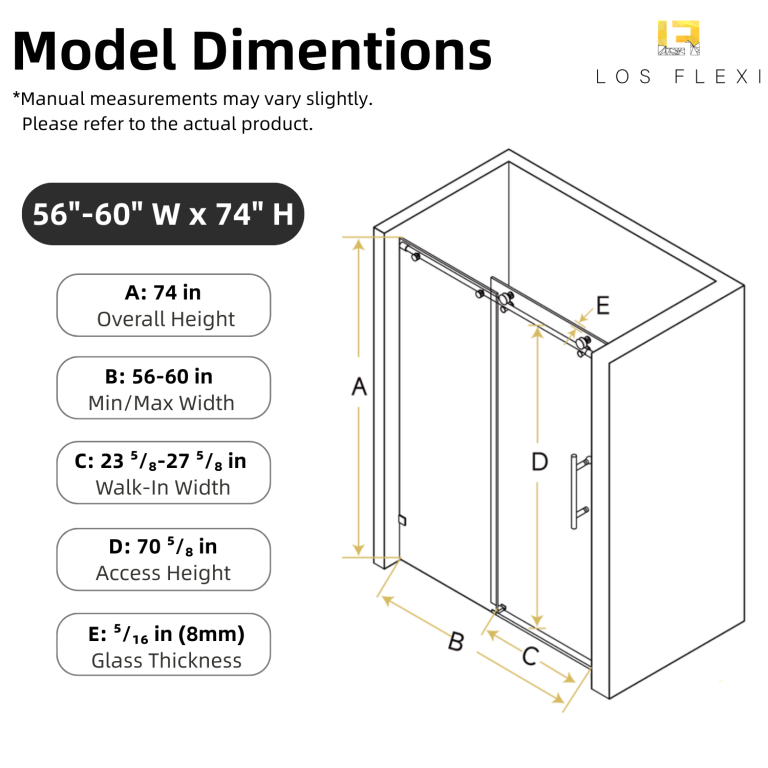 Los Flexi Frameless Single Sliding Shower Door Brushed Nickel 60″W x 74″H with 5/16″ Tempered Glass