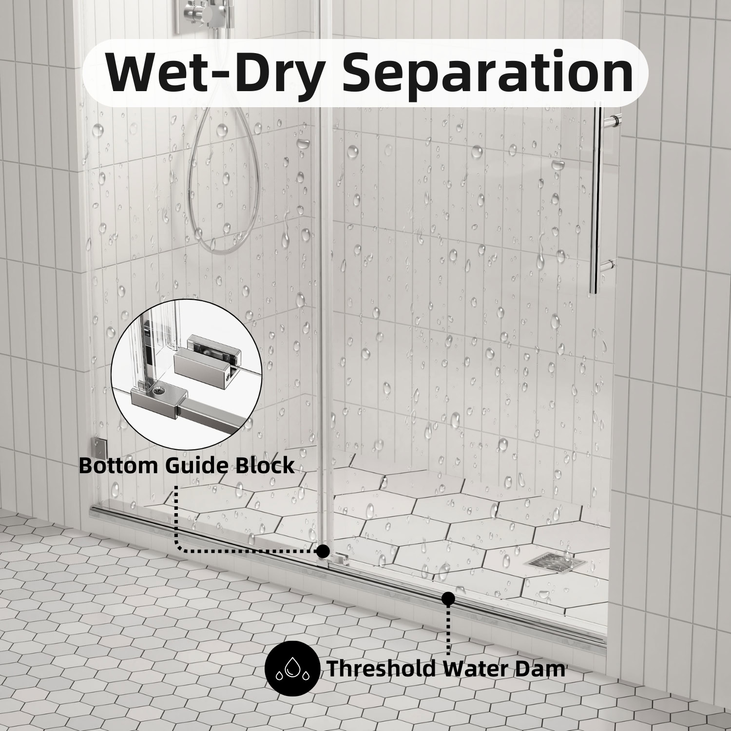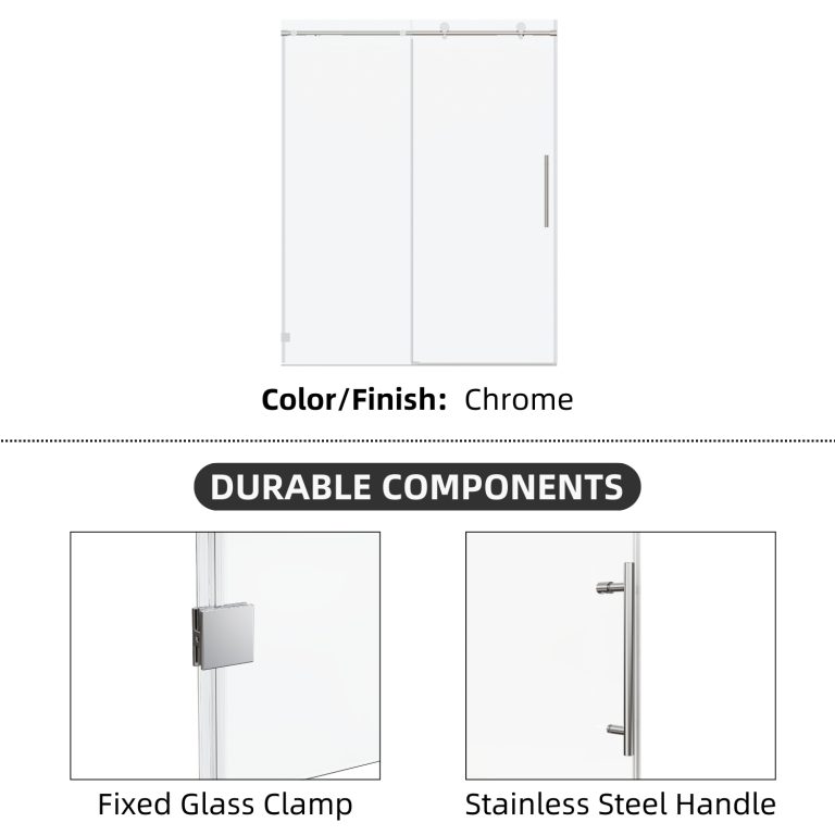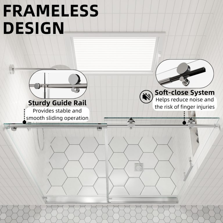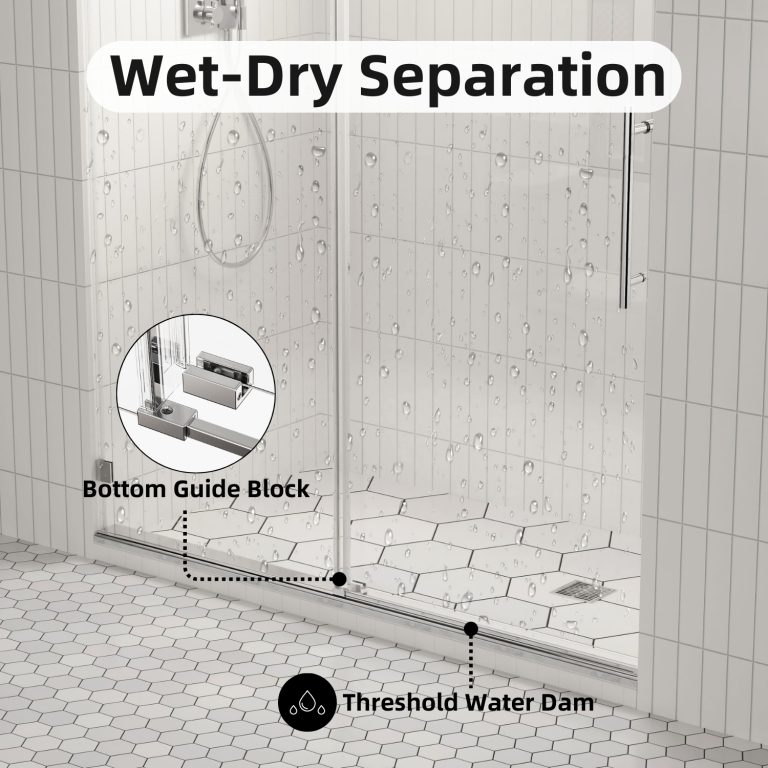 For practicality, door seals and an anti-splash threshold ensure effective water containment for drier floors. Setup is straightforward: organized hardware and adjustable rollers support a secure, adaptable fit (56″-60″ W) for common alcove sizes and long-term use.