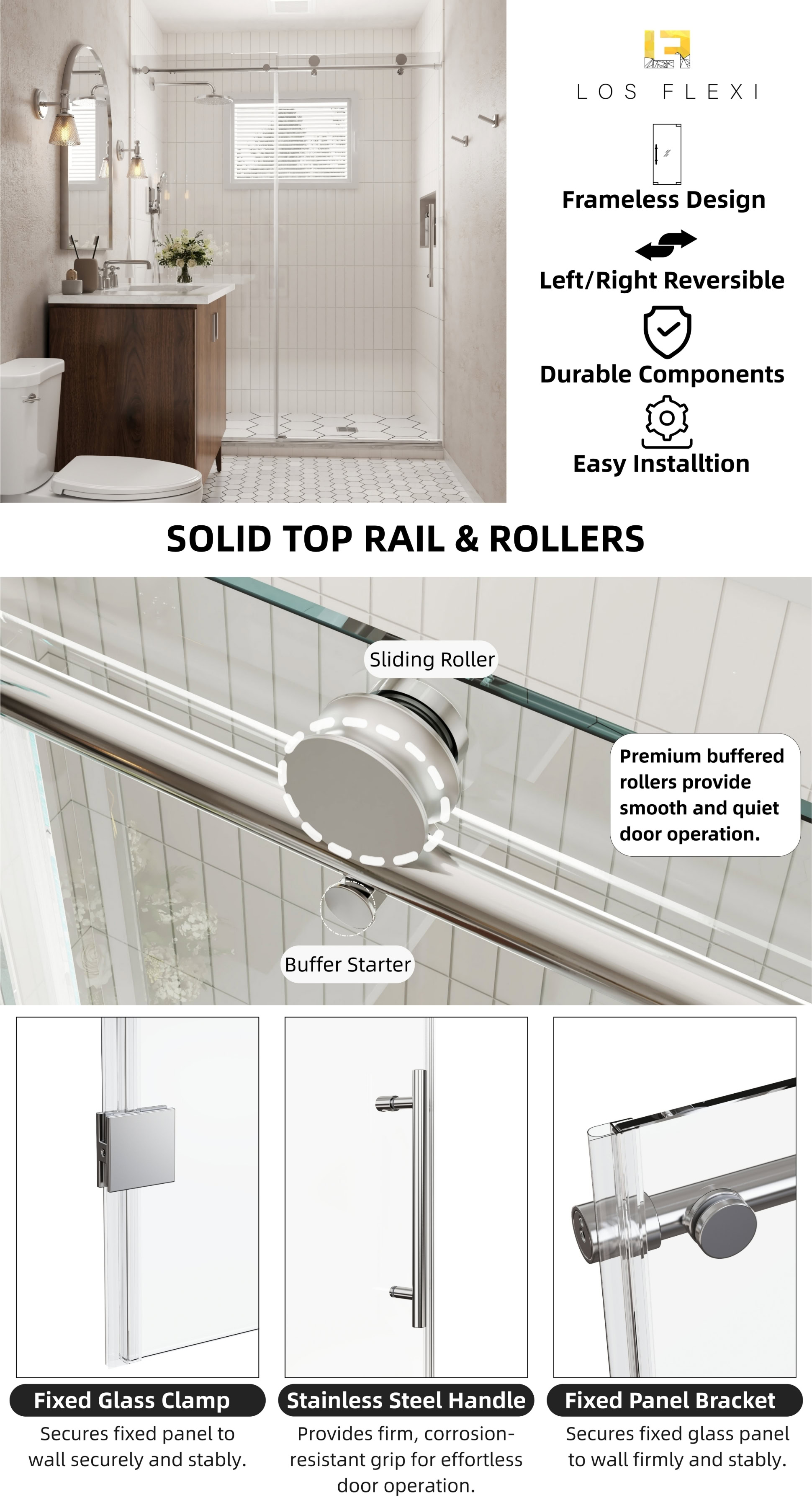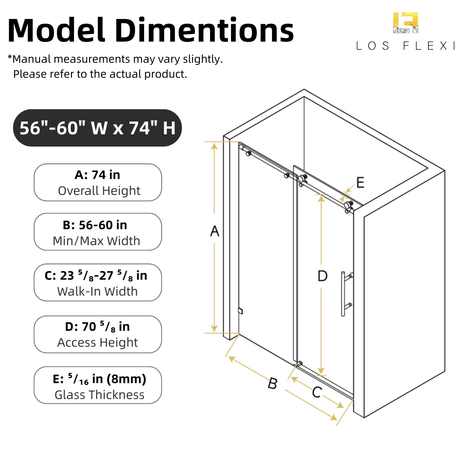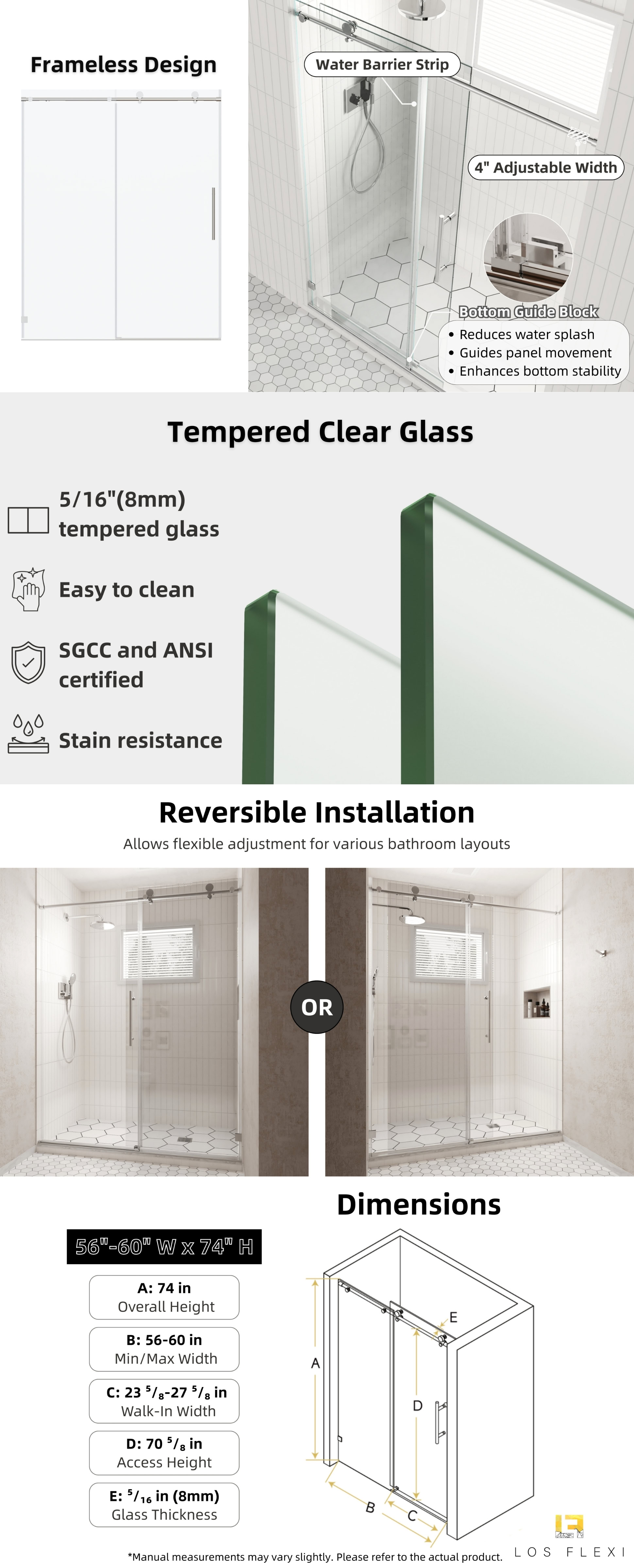 Los Flexi Frameless Single Sliding Shower Door Chrome 60″W x 74″H with 5/16″ Tempered Glass
