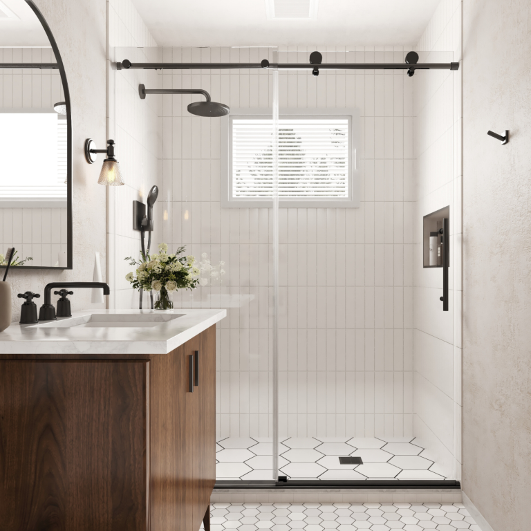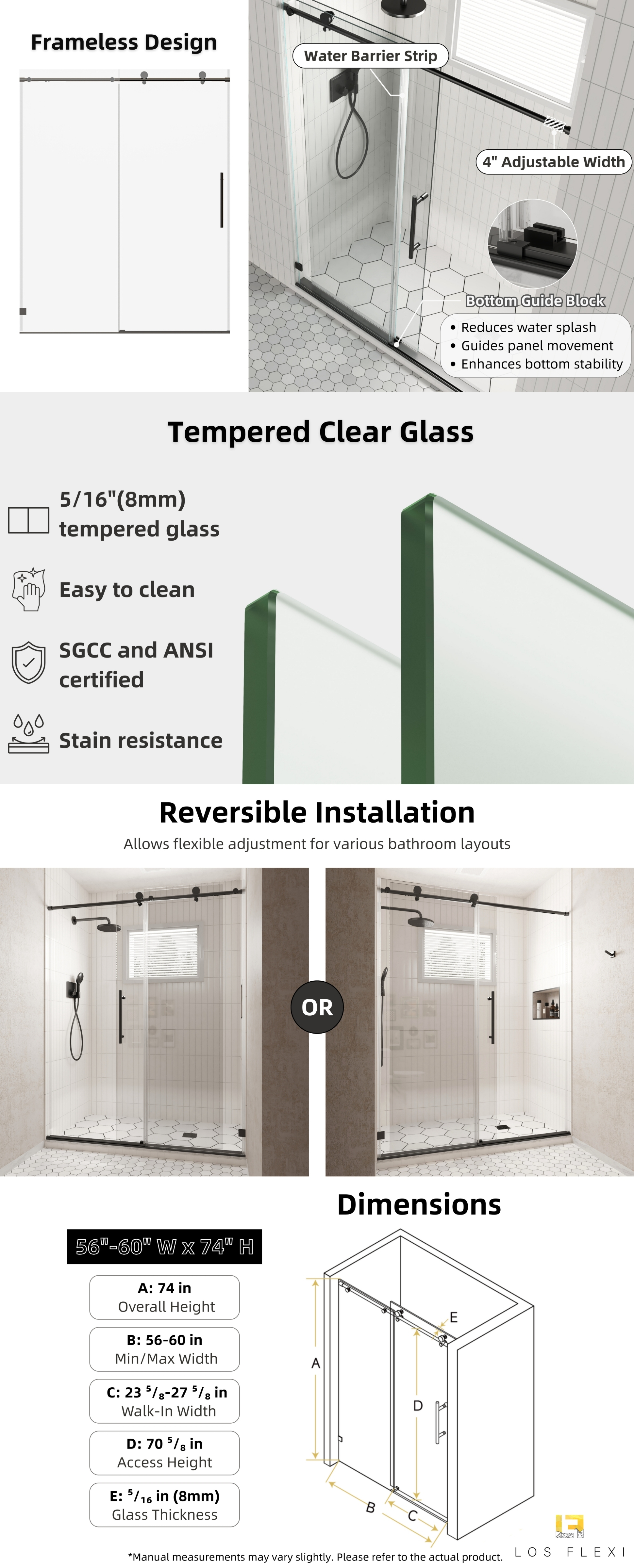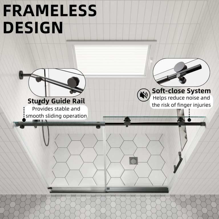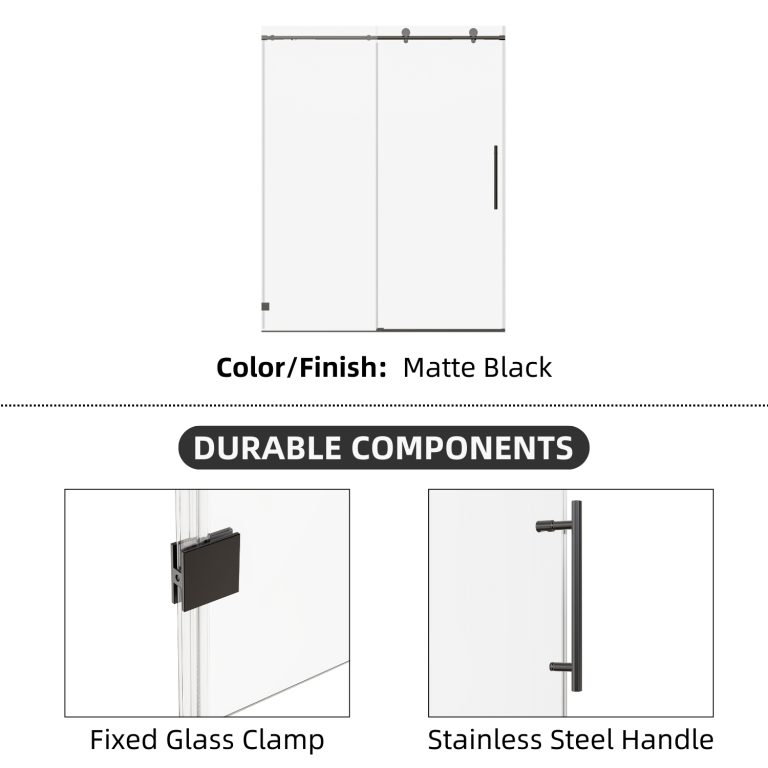 Achieve a high-end look and premium performance with Los Flexi matte black frameless single sliding door (56″-60″ W). It features 8mm SGCC-certified tempered glass for exceptional clarity and strength, meeting strict safety standards.