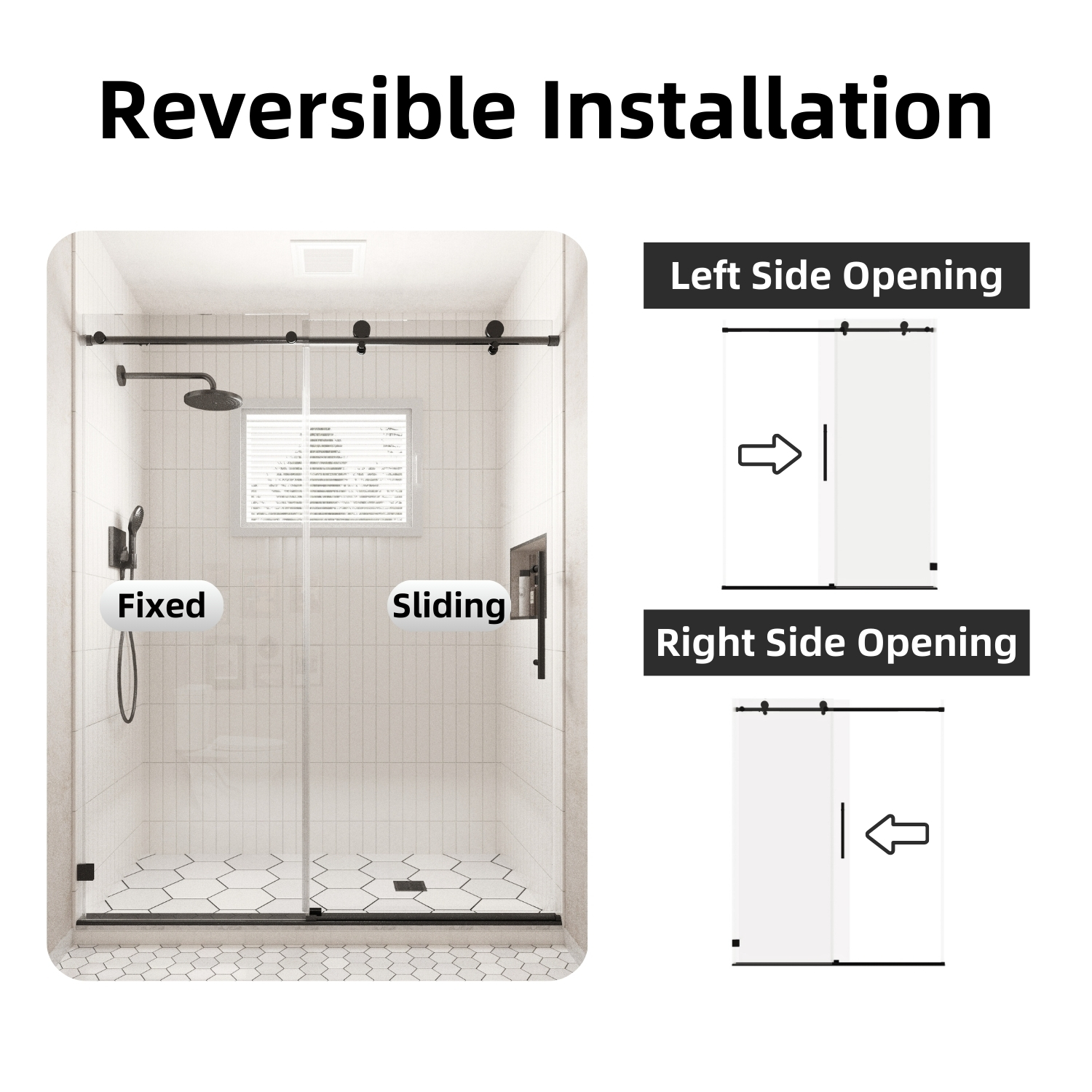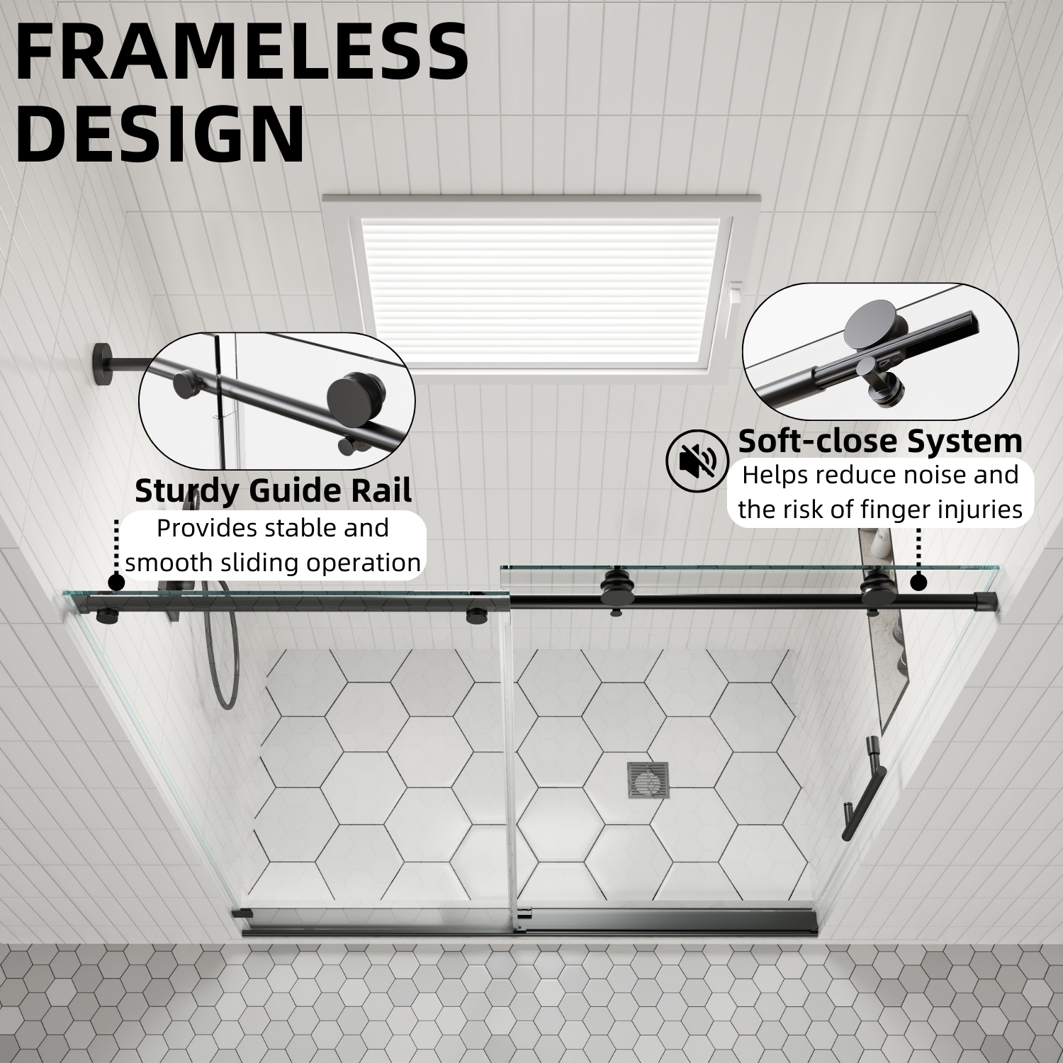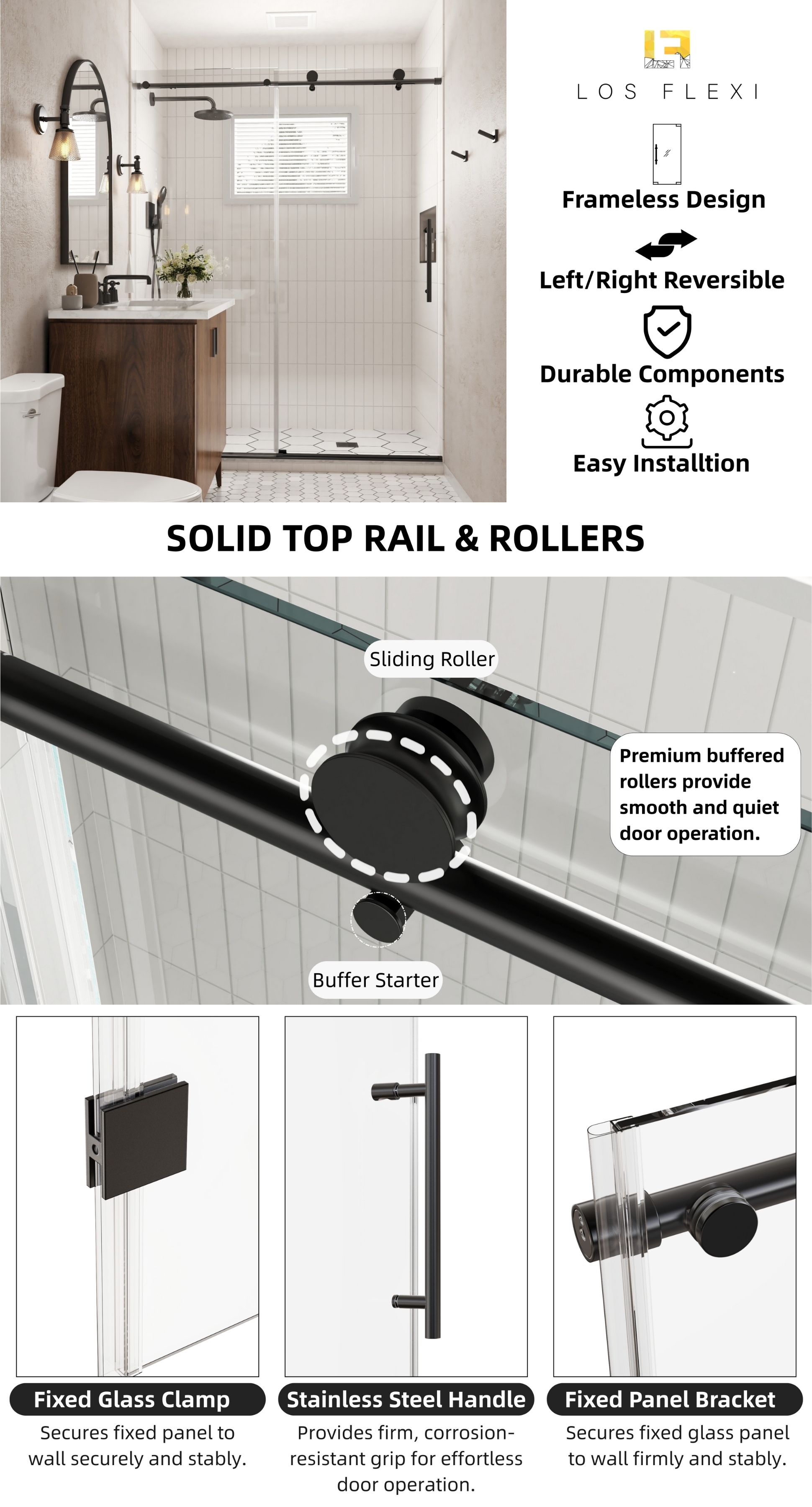 Achieve a high-end look and premium performance with Los Flexi matte black frameless single sliding door (56″-60″ W). It features 8mm SGCC-certified tempered glass for exceptional clarity and strength, meeting strict safety standards.
