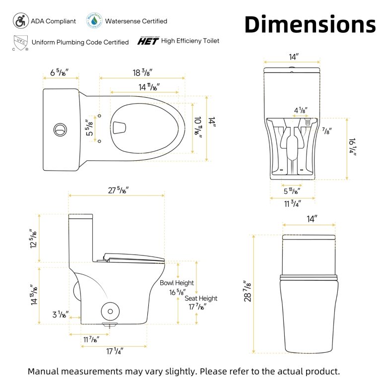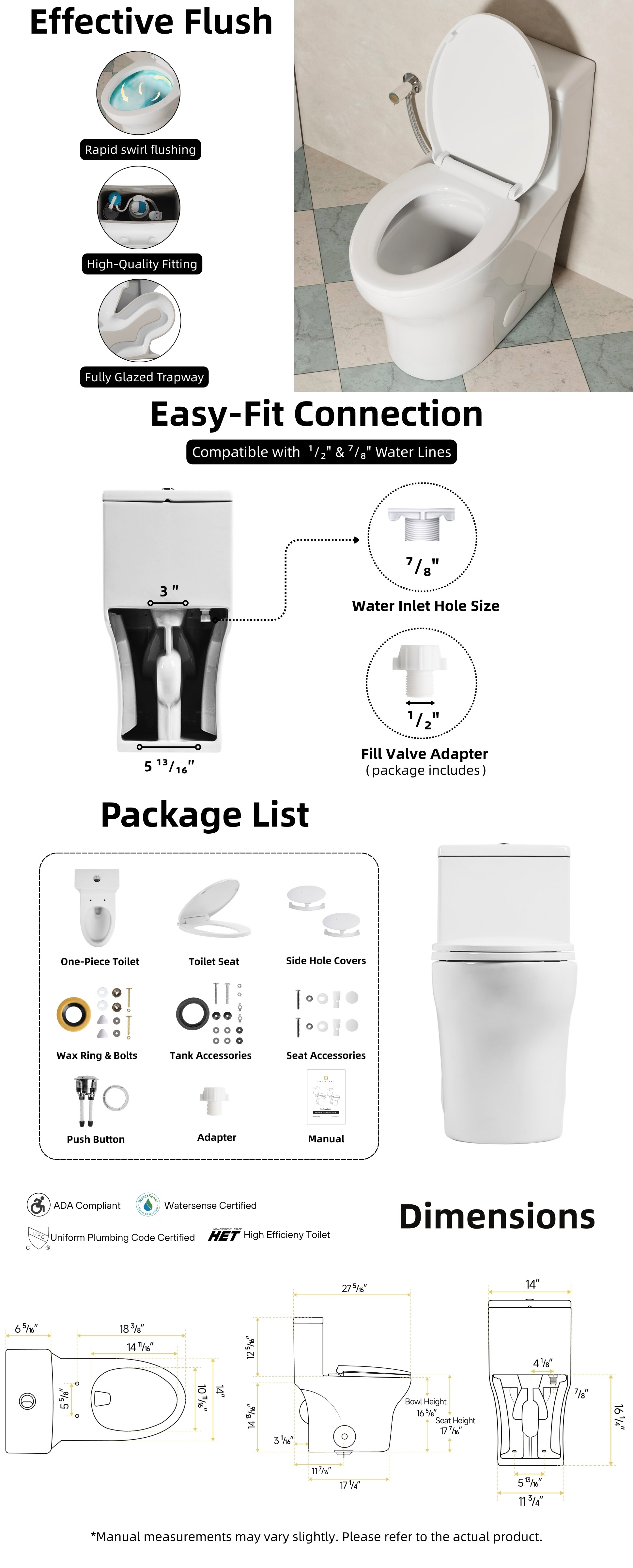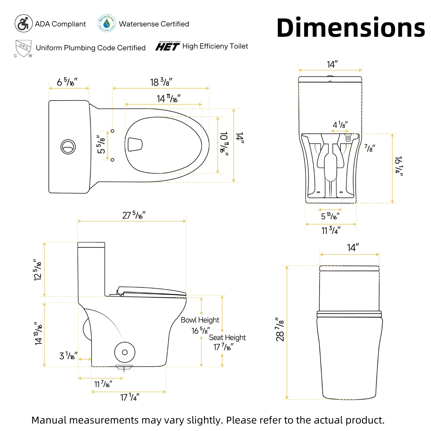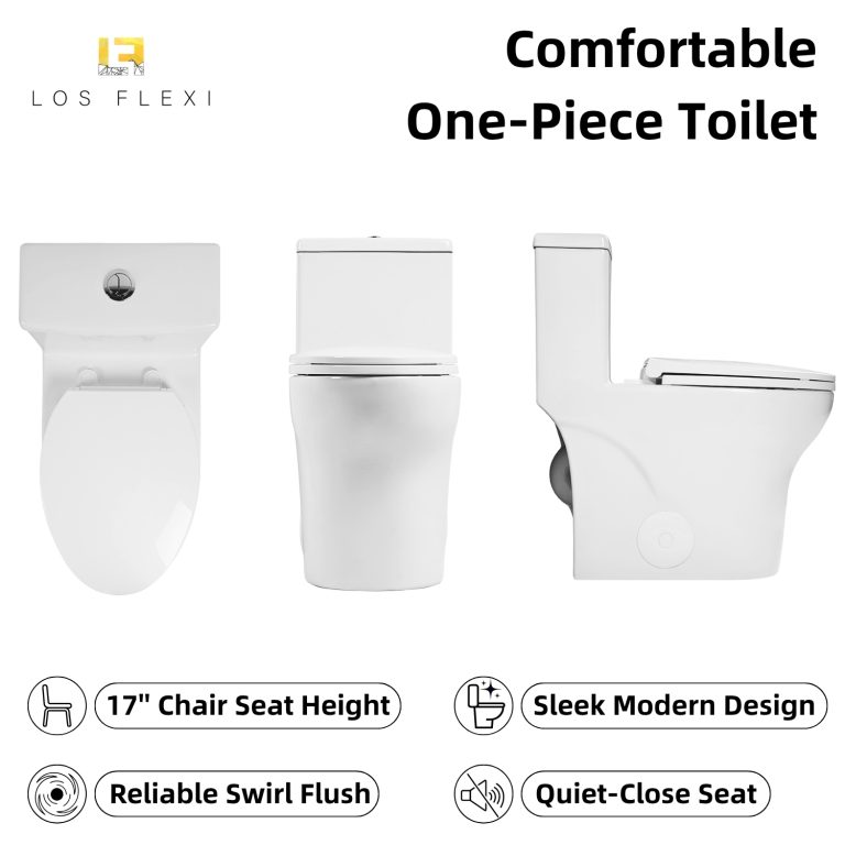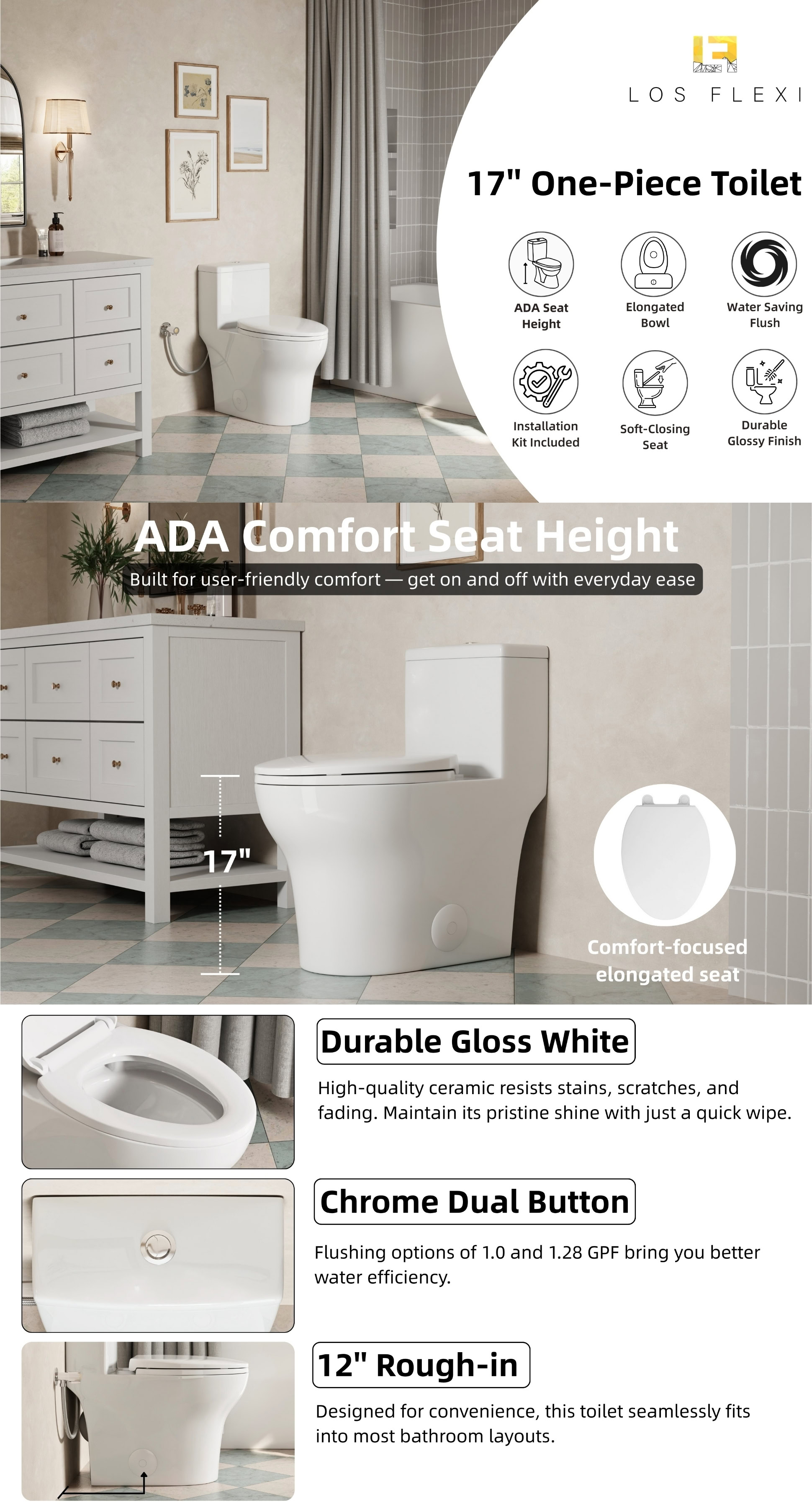 Discover the perfect balance of style, comfort, and efficiency with the Los Flexi one-piece toilet. Designed with a 17” ADA-compliant seat height and an elongated bowl, it offers a natural, ergonomic seating position that makes sitting down and standing up easier. The dual flush system (1.0/1.28 GPF) delivers powerful performance while saving water, making it an ideal eco-friendly toilet solution for modern homes. Crafted from durable ceramic with a sleek skirted design, this modern bathroom toilet resists stains, scratches, and fading, keeping its clean look for years. The soft-close toilet seat with quick-release hinges adds quiet comfort and simple cleaning, while the glossy, easy-to-clean surface reduces maintenance effort. With a standard 12” rough-in and all installation hardware included, setup is quick and straightforward. Backed by a 2-year limited warranty, this chair-height toilet is a premium water-saving fixture that enhances your bathroom with reliability, style, and long-lasting performance.