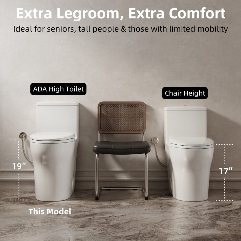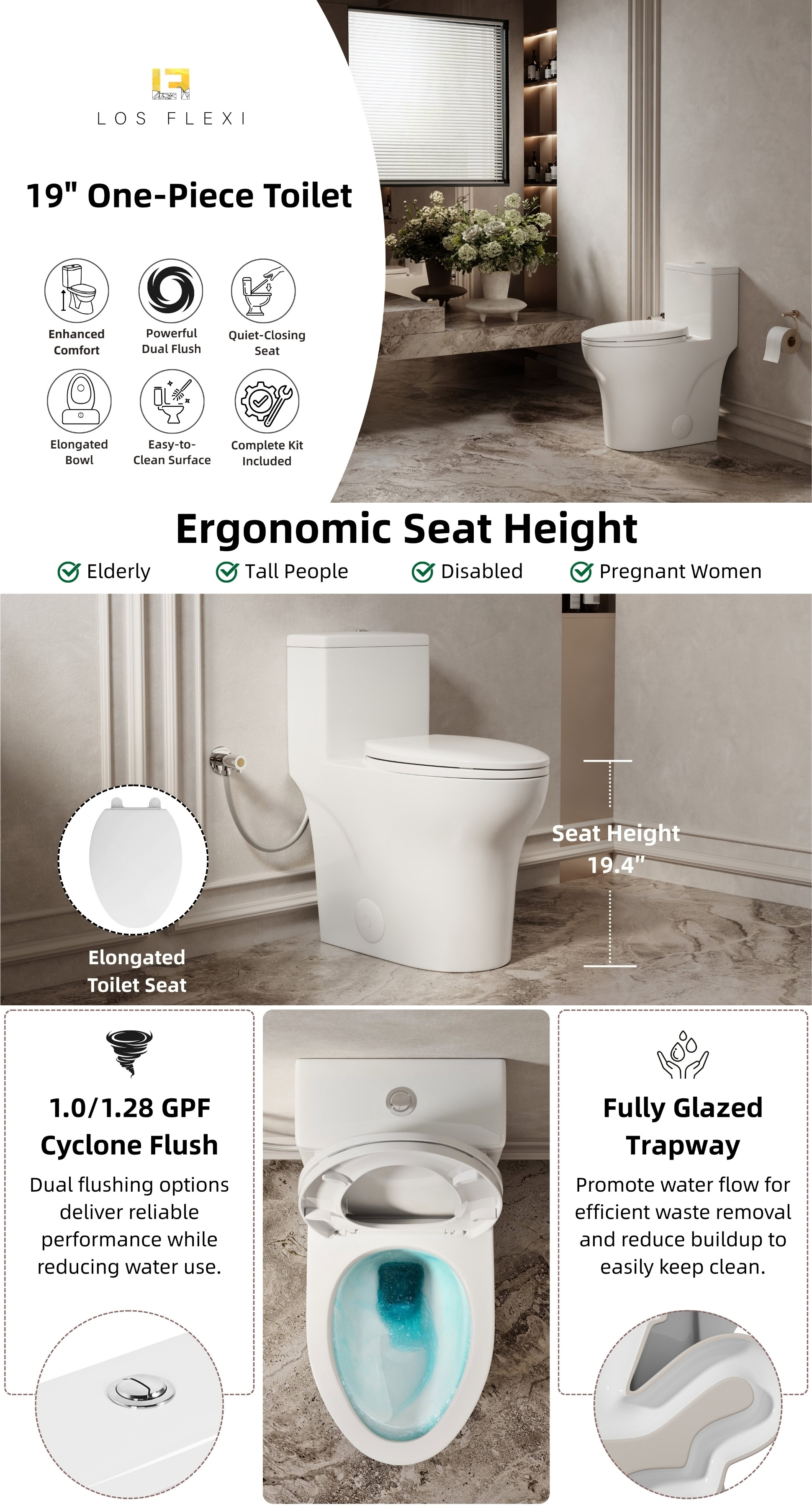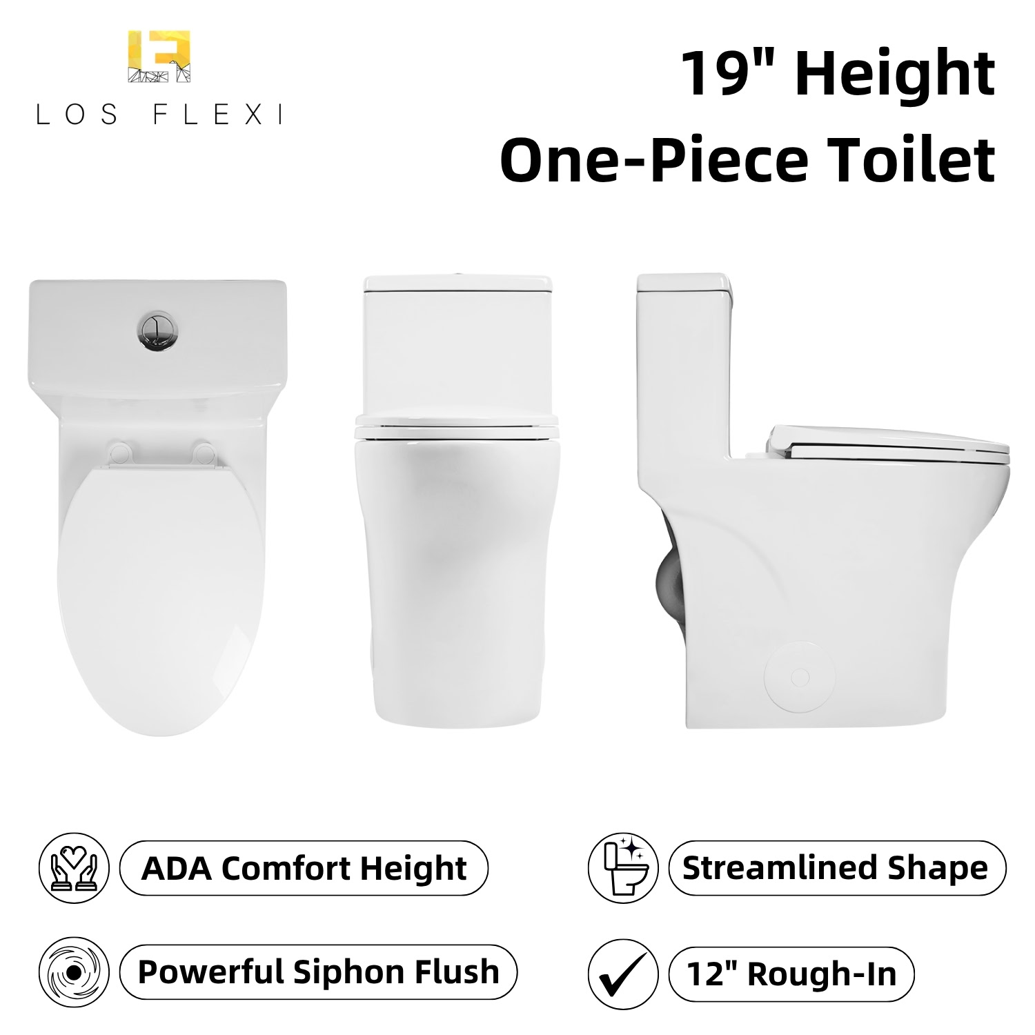 Upgrade your bathroom with the Los Flexi 19” one-piece toilet designed for enhanced comfort and accessibility. Featuring a comfortable ADA seat height and an elongated bowl, it provides extra legroom and a more natural seating position, making it easier for tall people, seniors, and those with limited mobility to sit down and stand up.