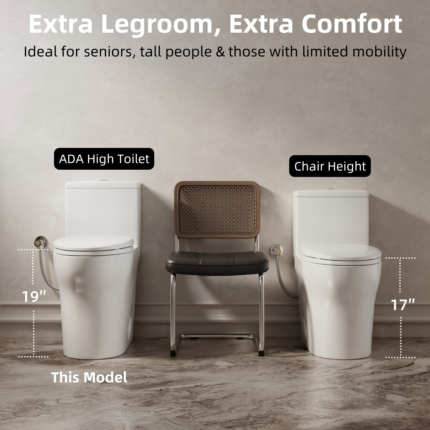 Los Flexi Glossy White Ceramic 19” ADA High Toilet for Tall People with Elongated Bowl, 1.0/1.28 GPF Siphon Flush, Soft-Close Seat, 12″ Rough-In Included