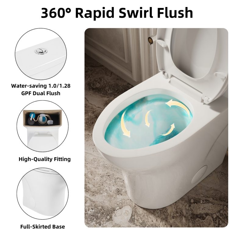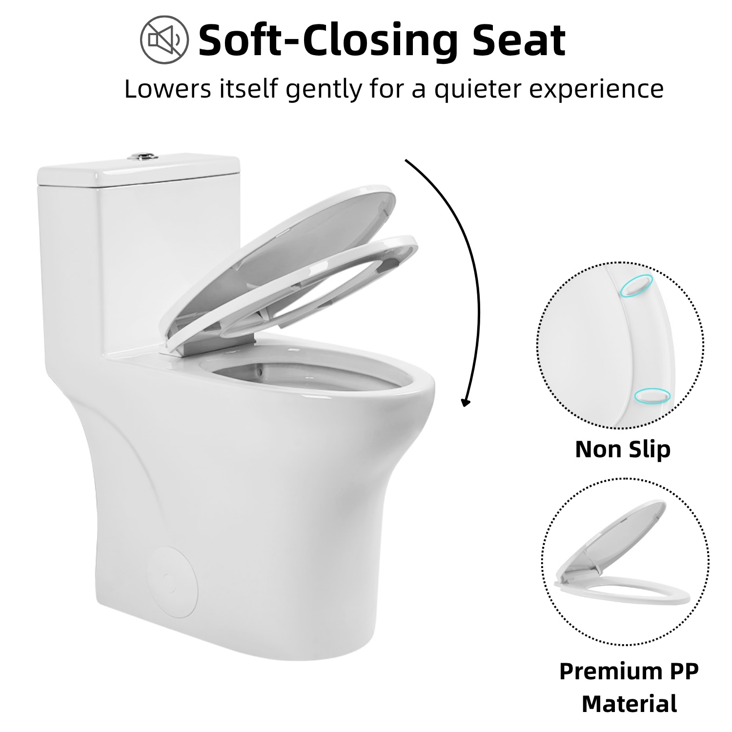Crafted from durable ceramic, this modern toilet features a glossy and robust construction with a fully skirted design, resisting stains and scratches while maintaining a polished, modern look. The dual flush system (1.0/1.28 GPF) combines water efficiency with powerful siphonic flushing, while the fully glazed trapway ensures smooth water flow and helps reduce the chance of clogs.