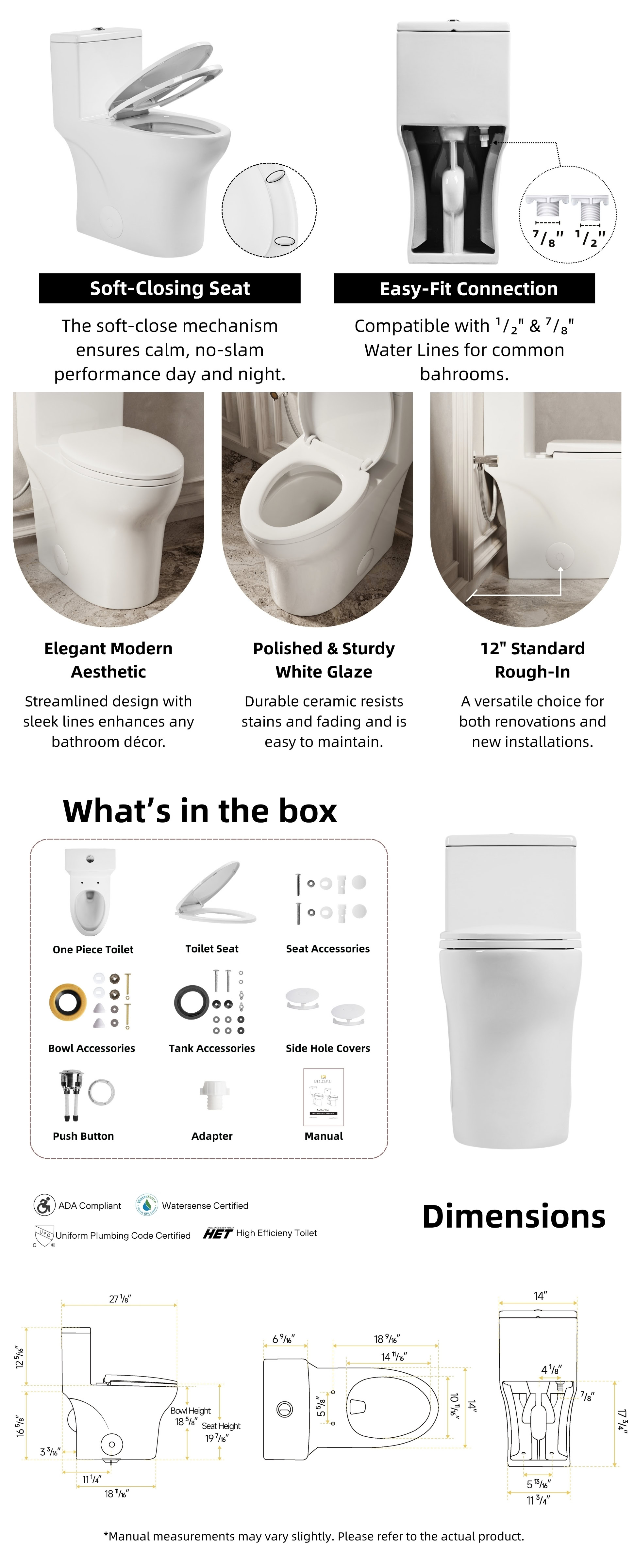For added convenience, this dual flush toilet includes a soft-close seat with quick-release hinges, designed to lower quietly and simplify cleaning or replacement. With a standard 12-inch rough-in and complete installation kit, DIY users can set it up quickly and easily. Covered by a 2-year limited warranty, this water-saving elongated toilet delivers long-term value, style, and reliable performance to your bathroom.