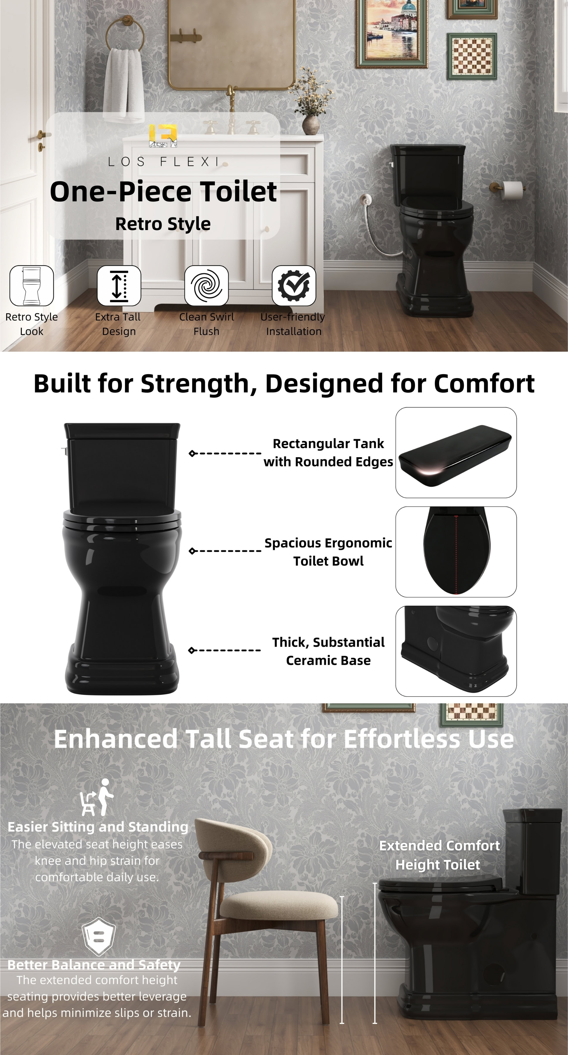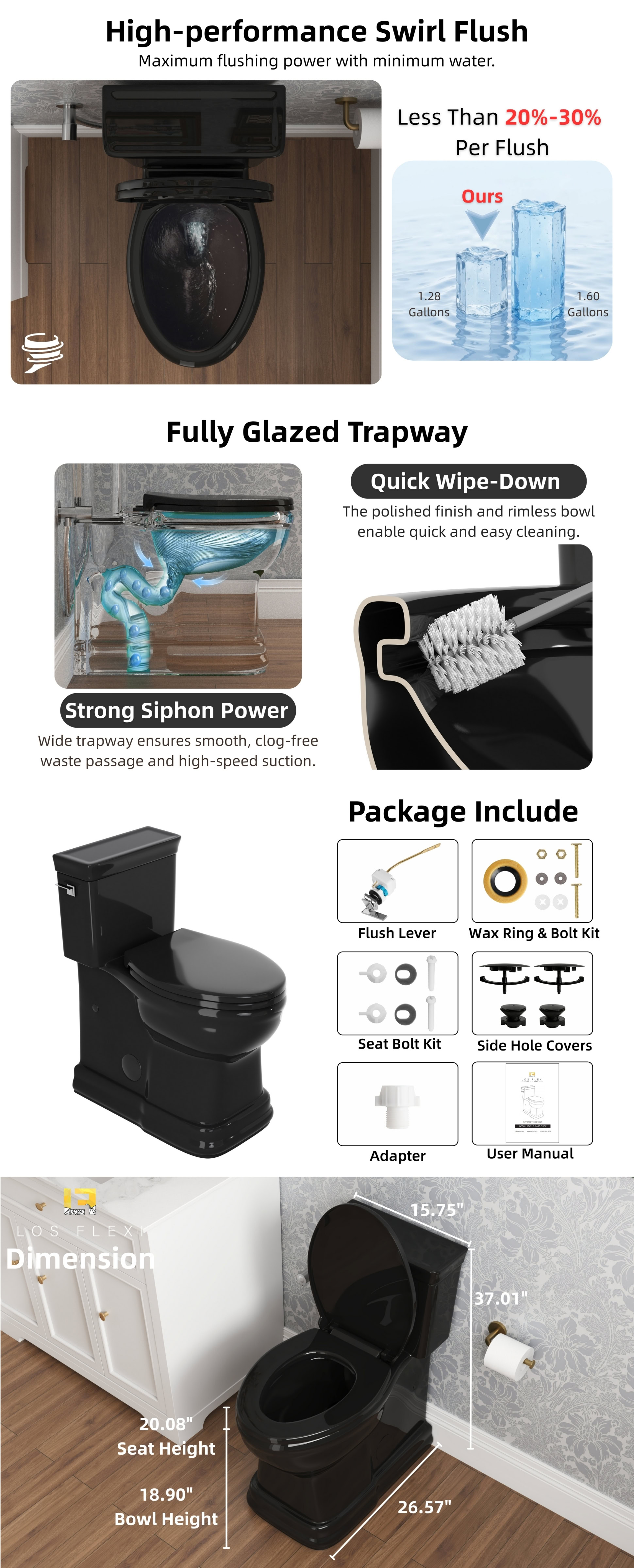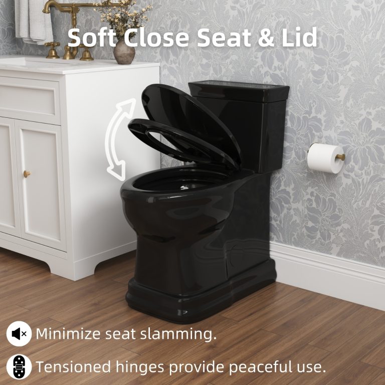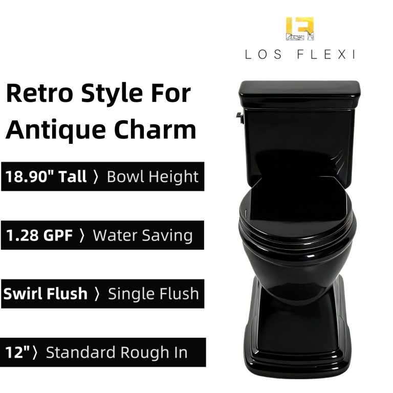 Los Flexi 19-inch tall one-piece toilet is designed to deliver comfort and stability for daily use, particularly for seniors, taller adults, and users who prefer a higher seating position. The elevated profile helps reduce the amount of bending required when sitting or standing, while the elongated bowl provides additional seating space for a more relaxed and supported experience. A single-flush system operating at 1.28 gallons per flush delivers thorough bowl rinsing with lower water usage, making it suitable for everyday household needs. Inside, the fully glazed trapway features a smooth surface that supports efficient waste movement and helps maintain a cleaner interior over time. The skirted base conceals the trapway for a streamlined appearance and simplifies exterior cleaning, complementing modern and contemporary bathroom designs. To enhance comfort further, the included soft-close seat and lid lower gently and quietly, minimizing noise and preventing sudden impact. Designed for a standard 12-inch rough-in, this floor-mounted toilet installs with hardware and is supported by a 2-year limited warranty, providing confidence in both performance and durability.