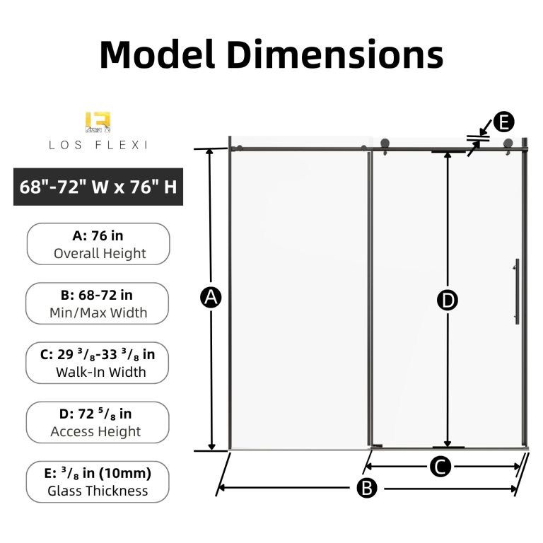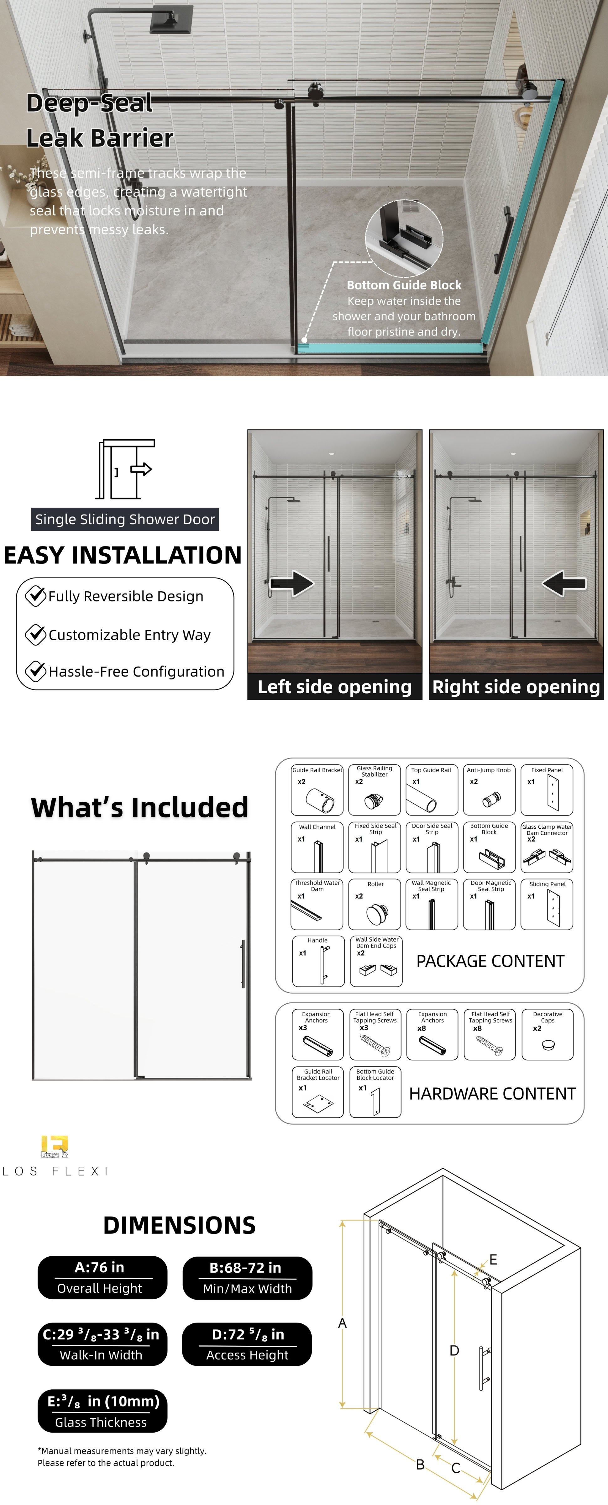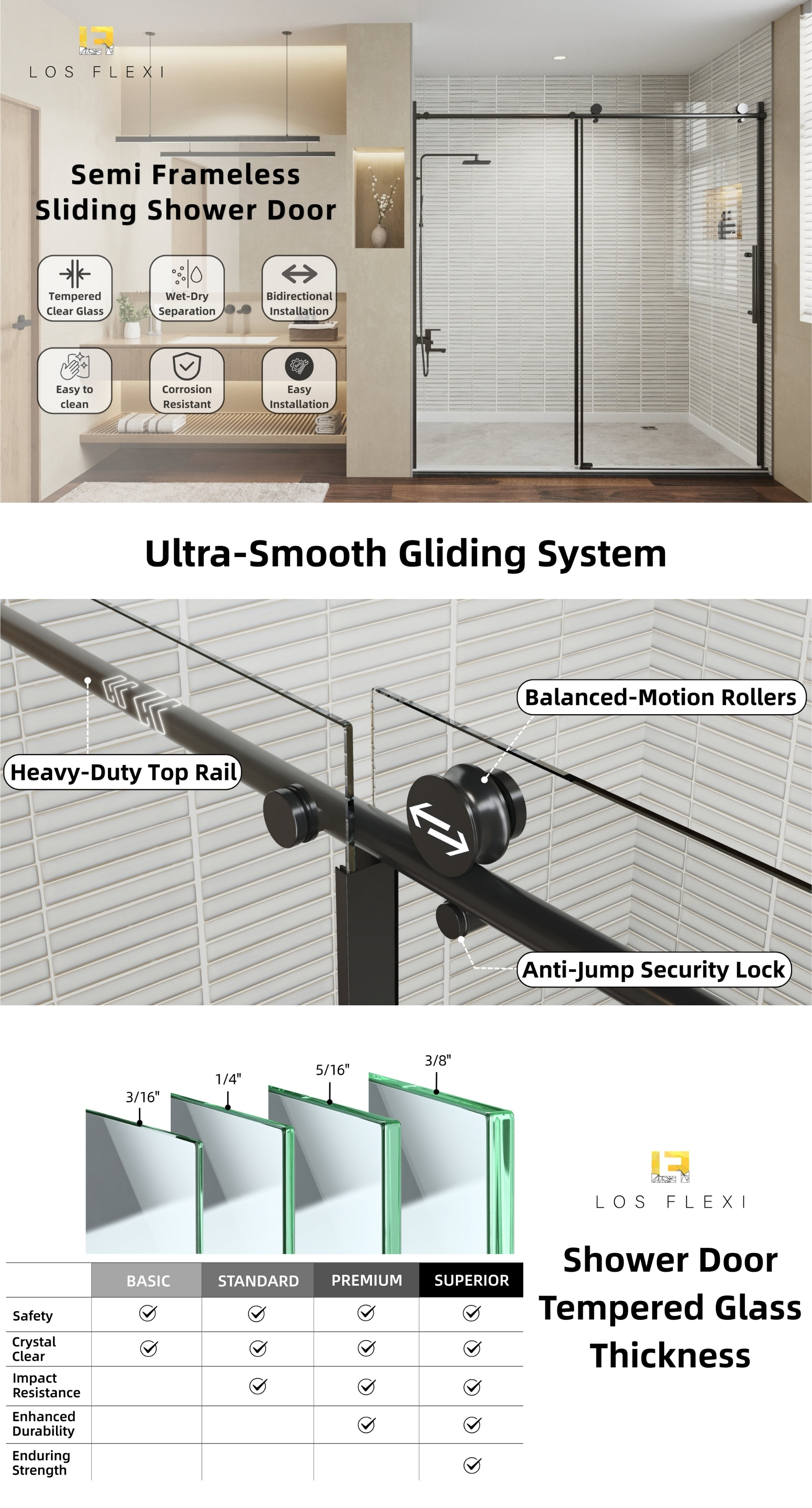 Los Flexi Matte Black Semi-Frameless Single Sliding Shower Door 72″W x 76″H with 3/8″ Thick Clear Tempered Glass