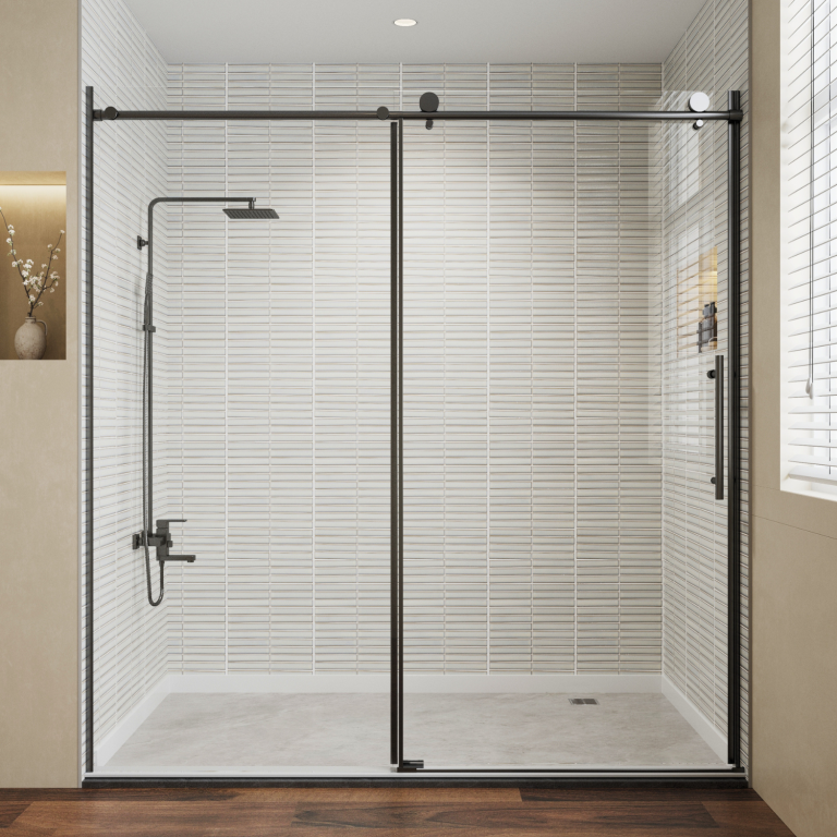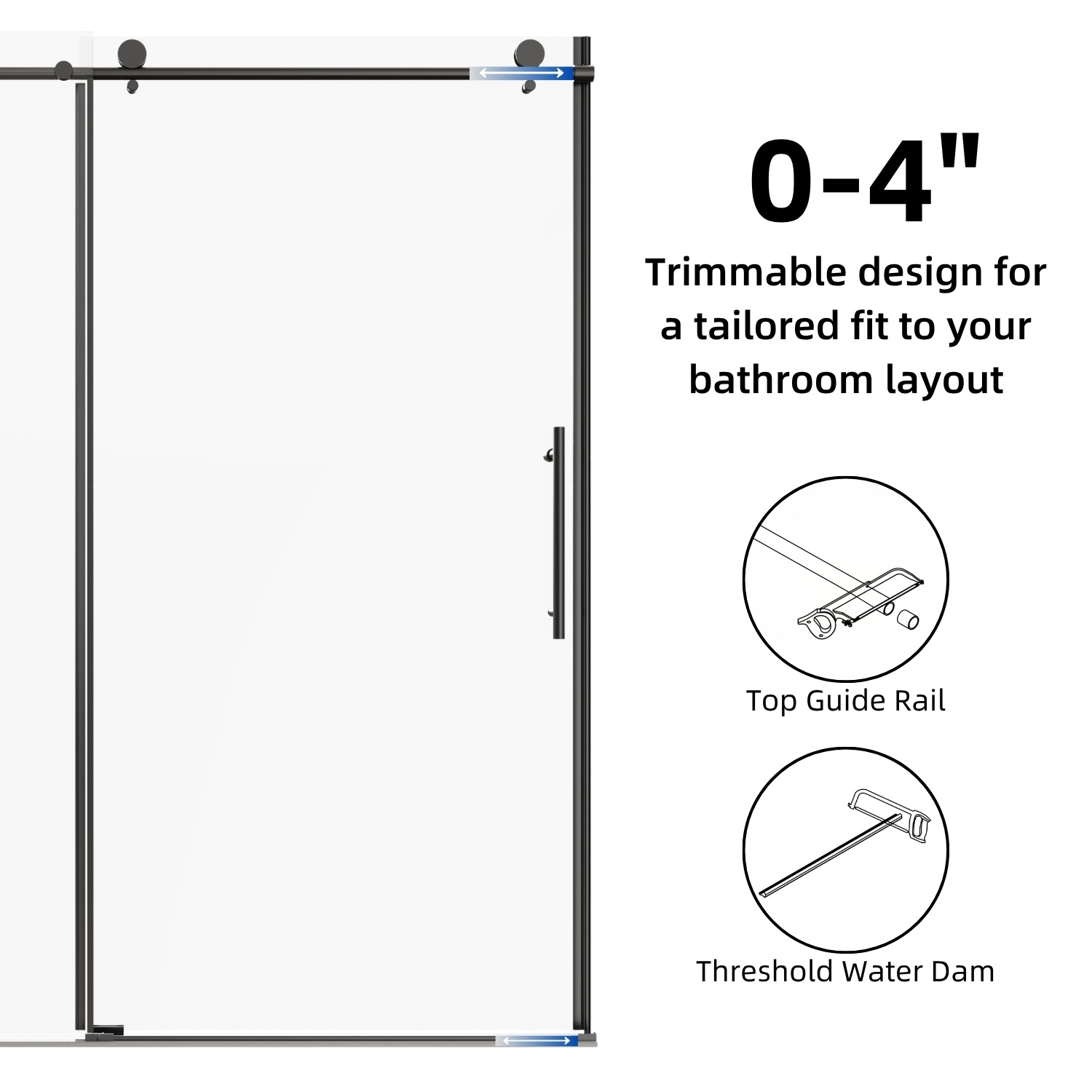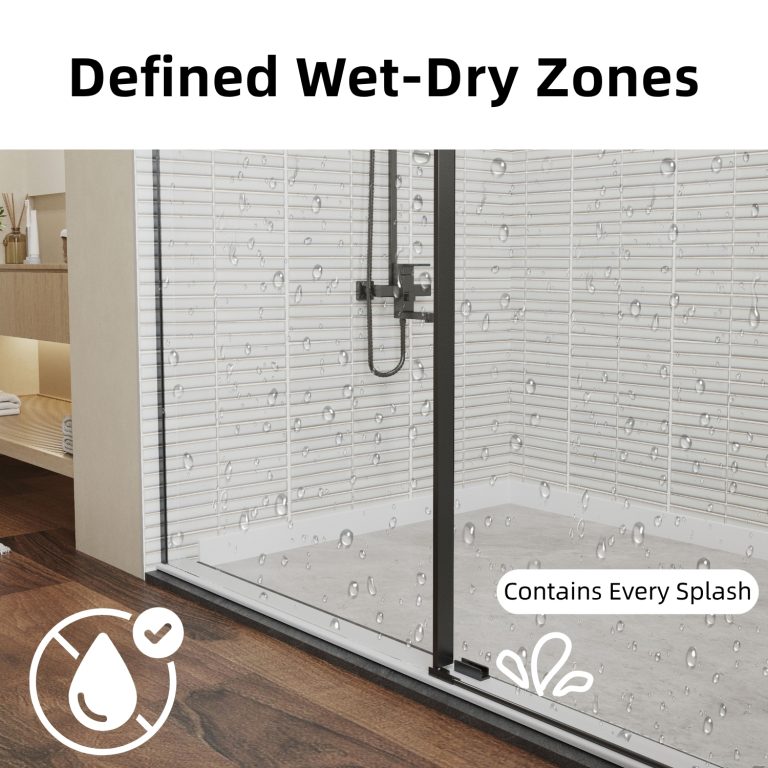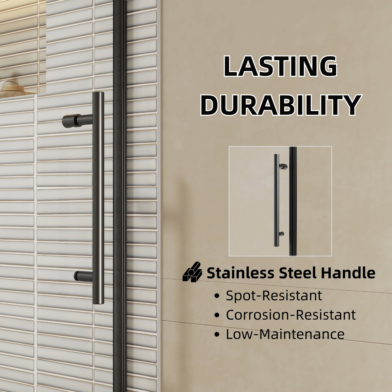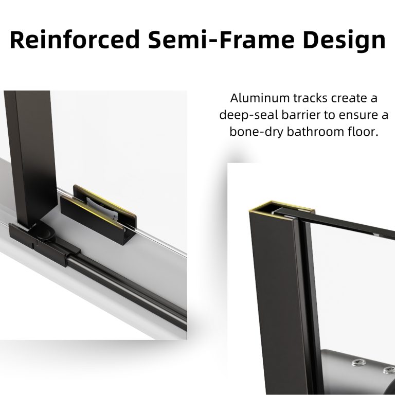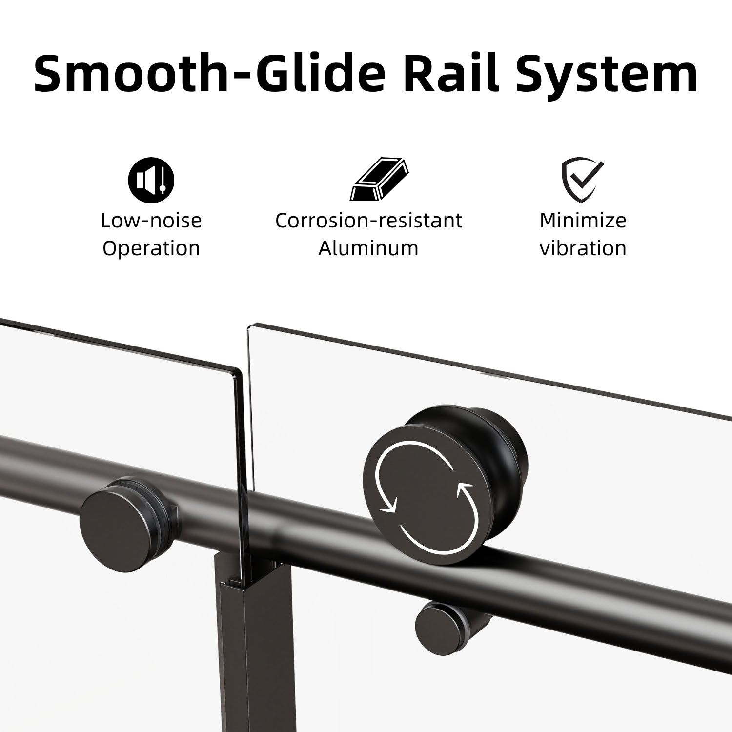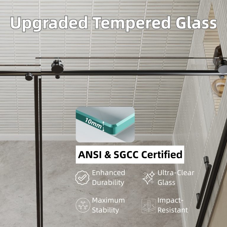 Built around 3/8″ thick SGCC and ANSI certified tempered glass, this matte black semi-frameless sliding shower door offers a more substantial feel and greater impact resistance than standard panels. The added glass thickness reduces vibration during use and supports a more stable overall enclosure. A reinforced glide rail with guided track components delivers smooth, low-noise operation across the full sliding range. Integrated side seal strips and a full-length threshold water dam work together to reduce moisture from escaping the enclosure, helping maintain a drier bathroom environment. The top guide rail can be trimmed to fit alcove openings from 68 to 72 inches wide, and the reversible panel supports both left and right opening configurations. All hardware is included. The matte black finish brings a clean, modern look to a range of bathroom styles, backed by a 1-year limited warranty.