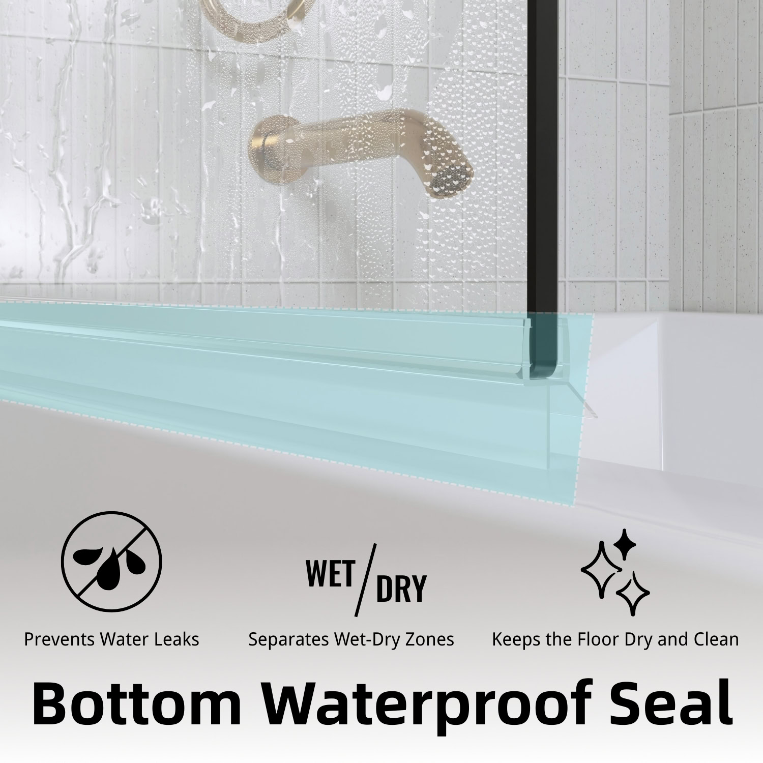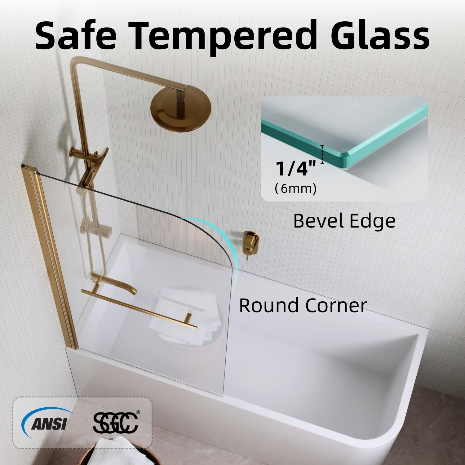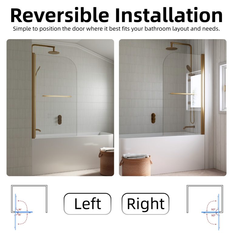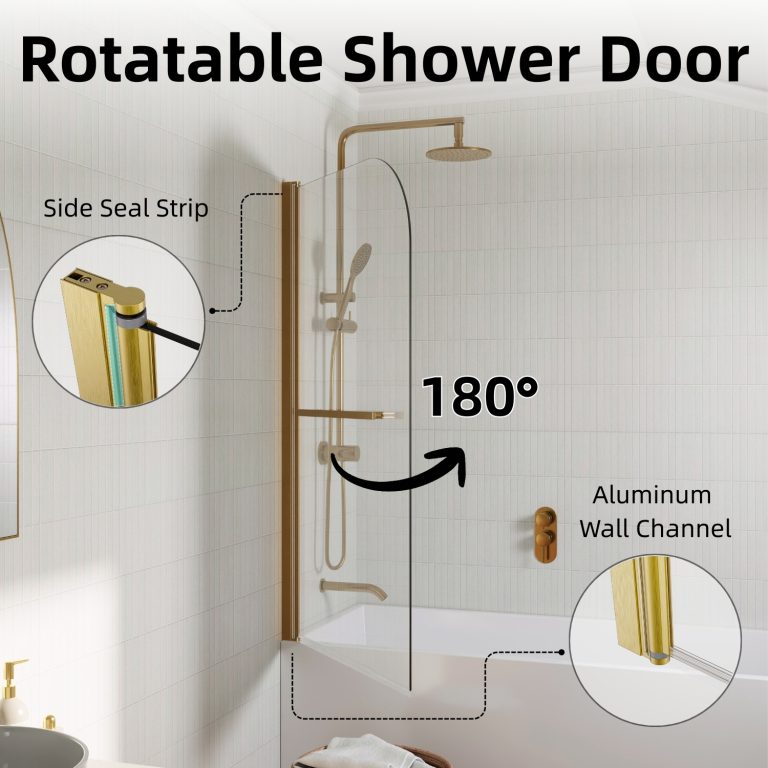 This frameless pivot shower door for tub combines style, safety, and functionality to elevate any bathroom. Constructed from 1/4″ (6mm) tempered glass, it is engineered to endure daily use, and in the rare event of breakage, it fragments into small, blunt pieces for enhanced protection. The pivot hinge allows a full 180° rotation inward or outward, providing easy access and convenient cleaning, while installation on either side creates a wide, space-efficient opening. Its sleek, frameless design with a brushed gold finish brightens the room and visually enlarges small spaces, giving the tub area an airy, modern appeal. A bottom water strip blocks splashes, keeping the bathroom floor dry and defining wet and dry zones. Setup is simple with included mounting hardware and illustrated instructions, and a 1-year warranty along with responsive customer support ensures confidence and peace of mind for long-term use.