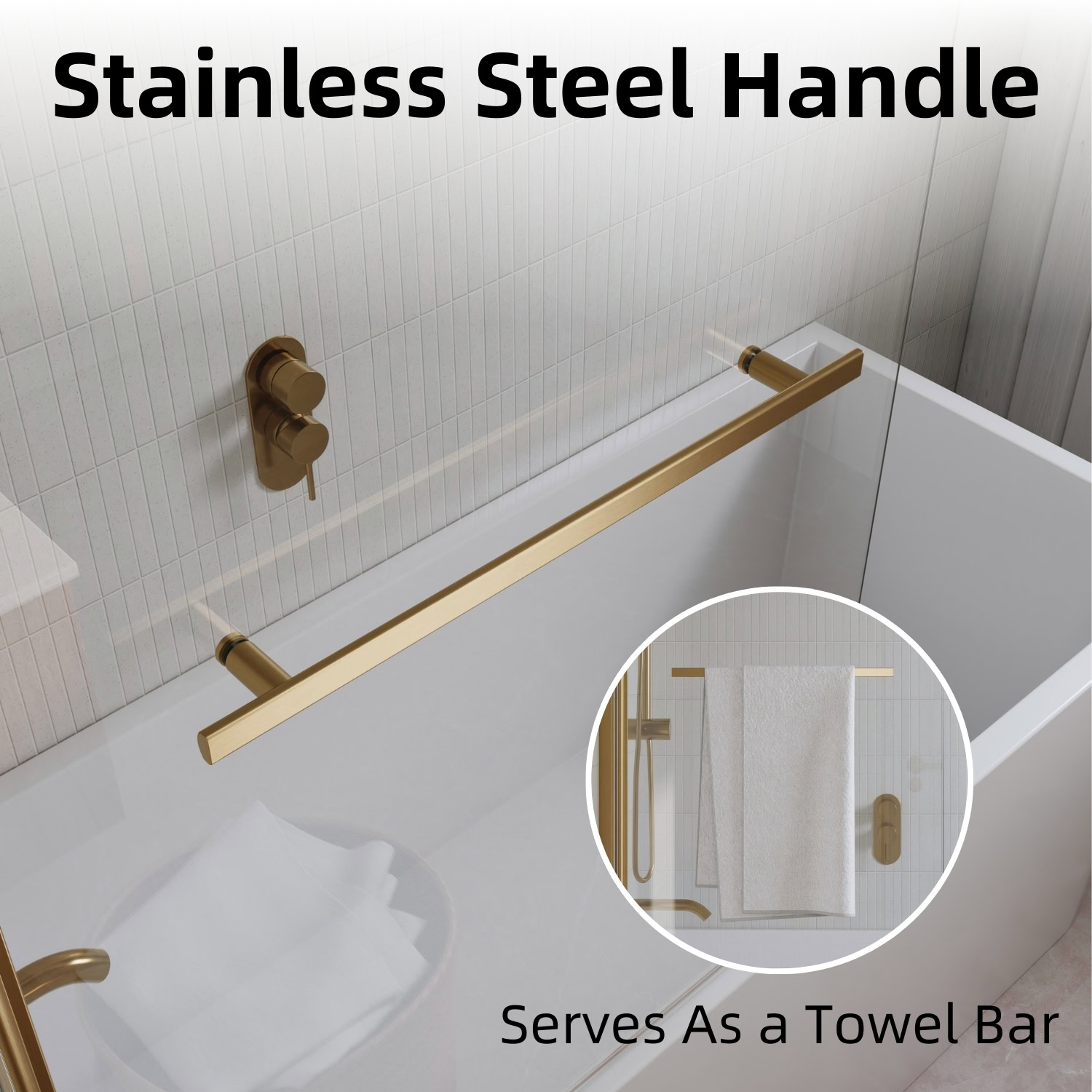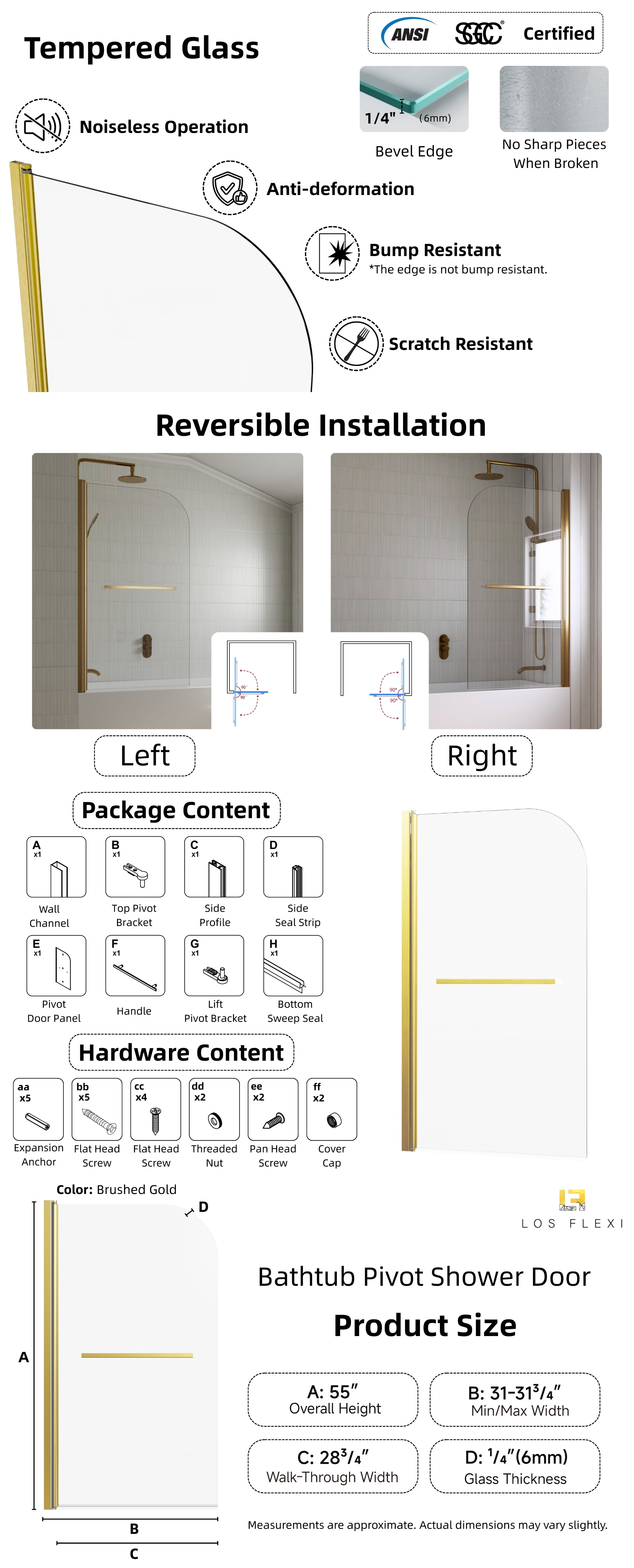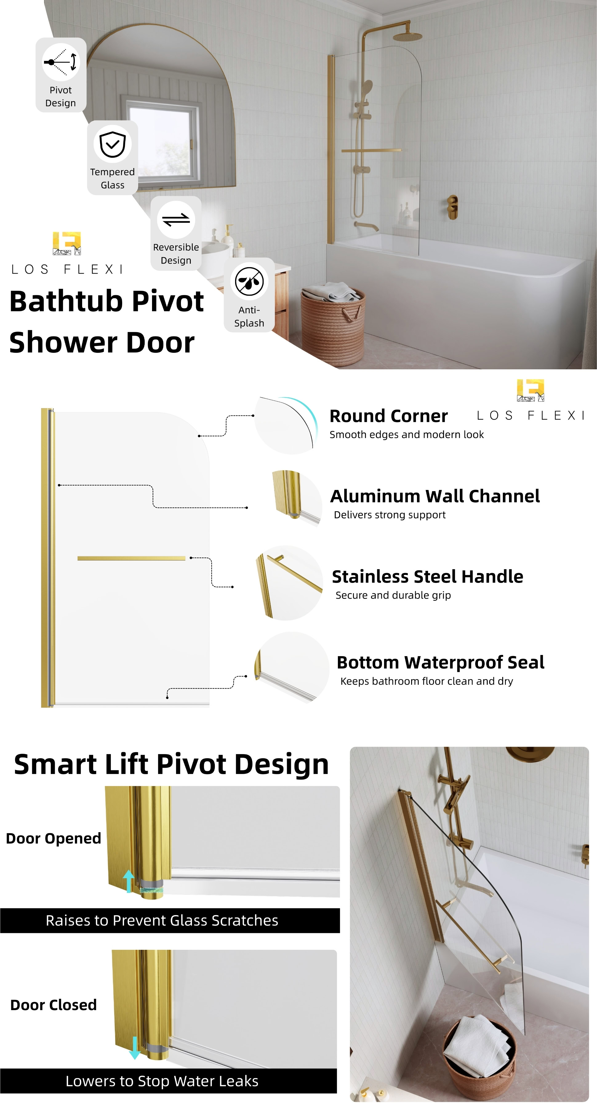 Los Flexi Pivot Half Shower Door for Bathtub Brushed Gold 31″ W x 55″ H with 1/4″ Glass