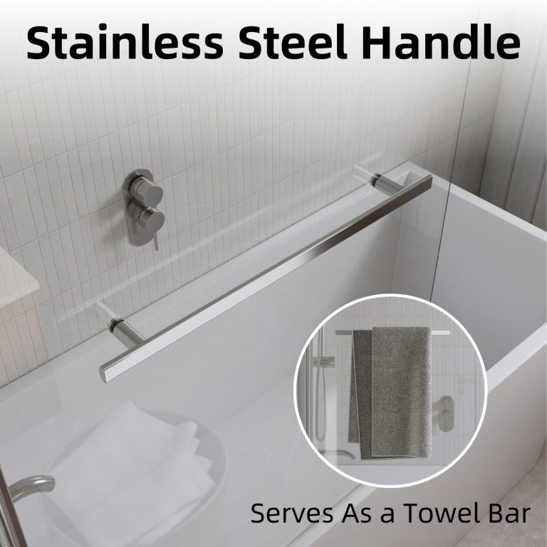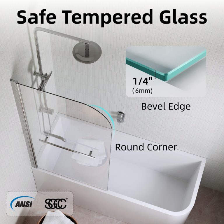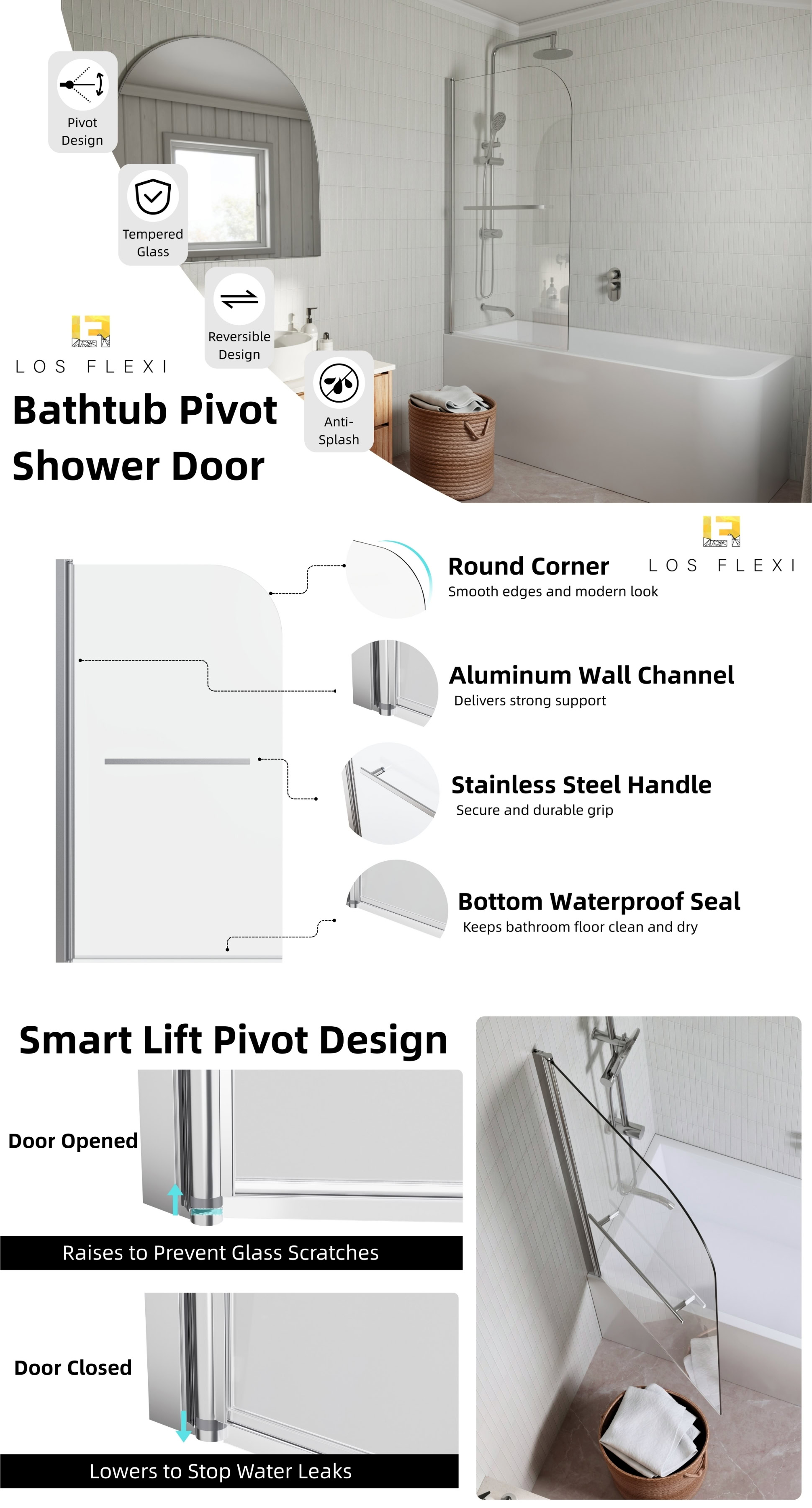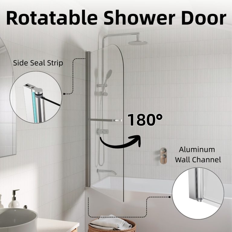 Los Flexi frameless pivot half shower door combines style, flexibility, and safety to enhance any bathroom. Constructed from 1/4″ (6mm) tempered glass, it is designed to withstand daily use, and in the rare event of breakage, it fragments into small, blunt pieces to protect users. The pivot hinge allows a full 180° swing, inward or outward, providing easy access and effortless cleaning. Installation on either side creates a wide, space-efficient entry while also serving as a splash-blocking screen. The sleek frameless design with a chrome finish brightens the bathroom and visually expands smaller spaces, giving the tub area an airy, modern feel. A water-retaining strip along the bottom helps contain splashes and keeps the floor dry, clearly separating wet and dry zones. Installation is straightforward with included hardware and illustrated instructions, and responsive customer service plus a 1-year warranty ensures lasting satisfaction and peace of mind.