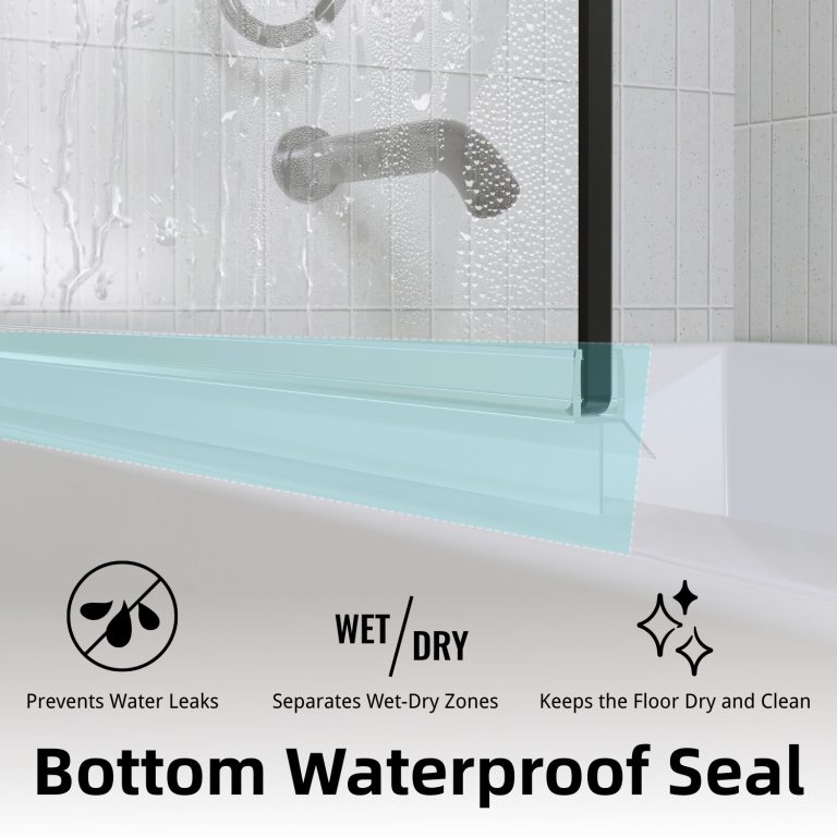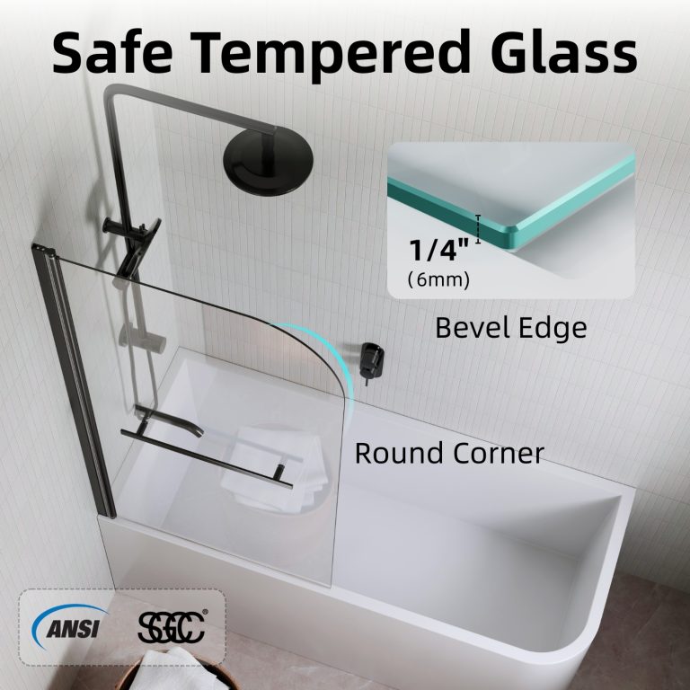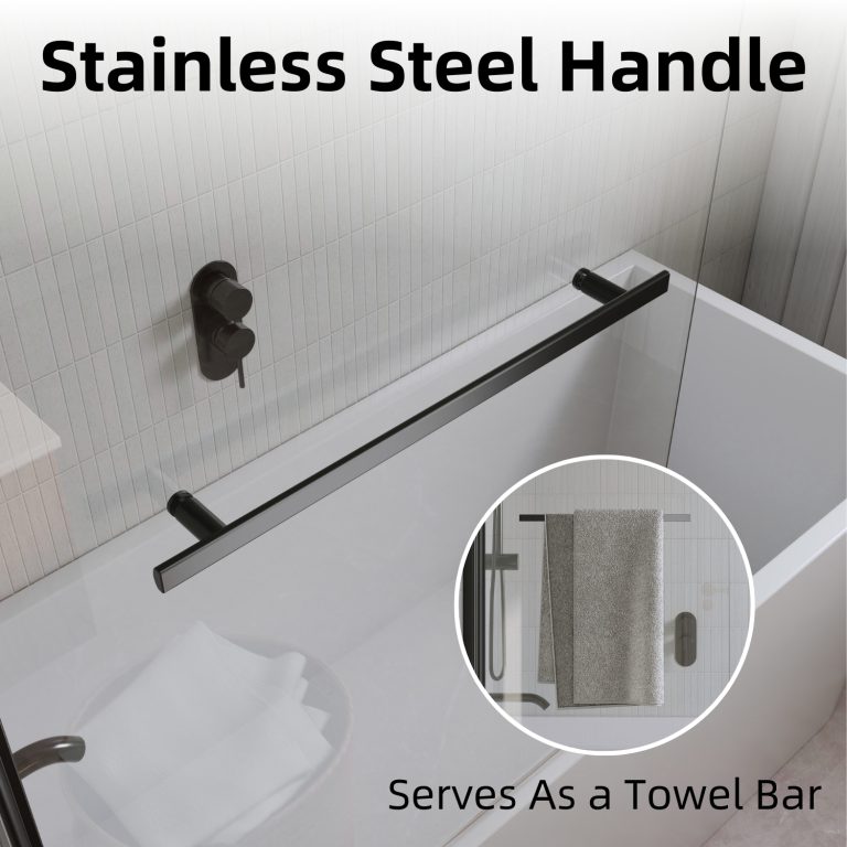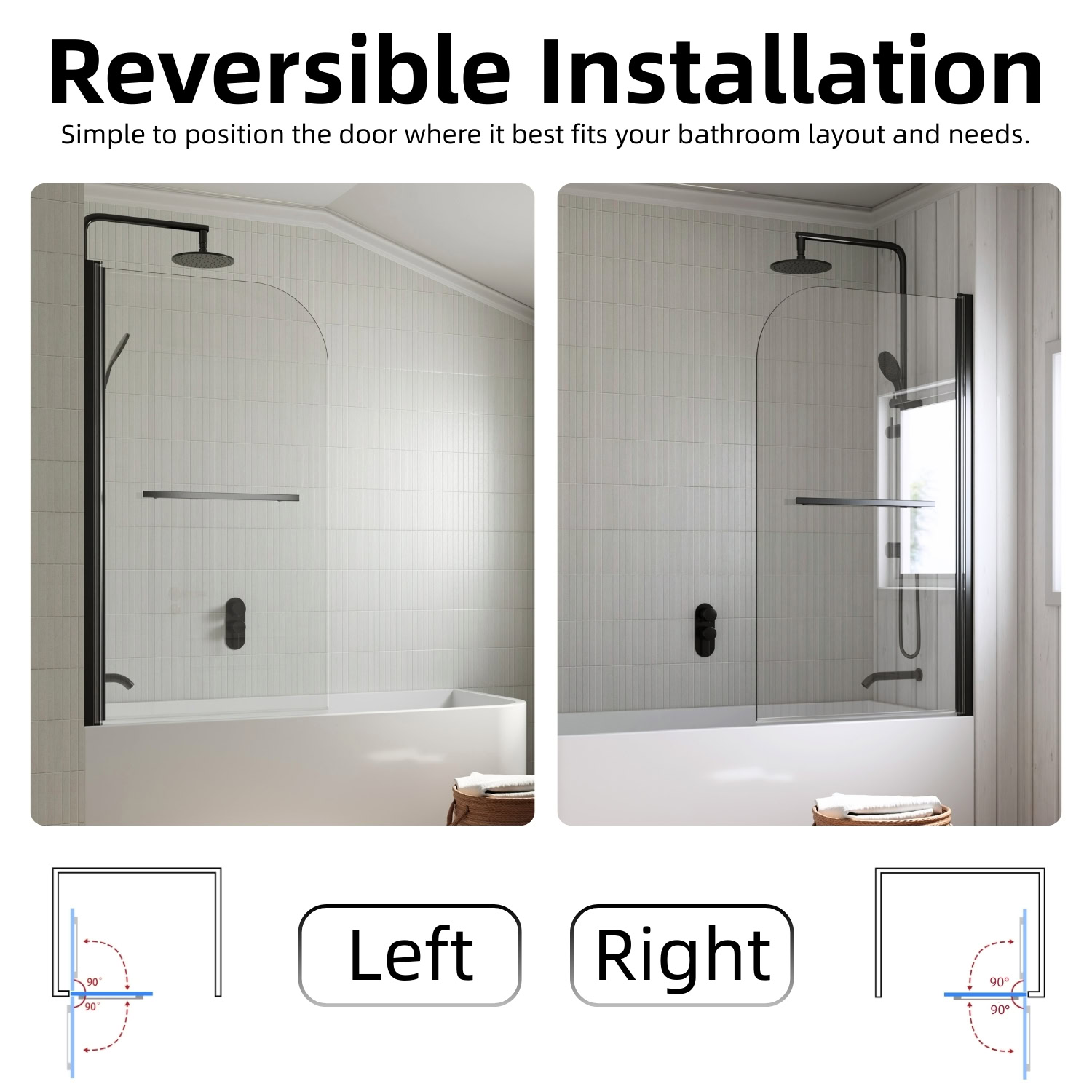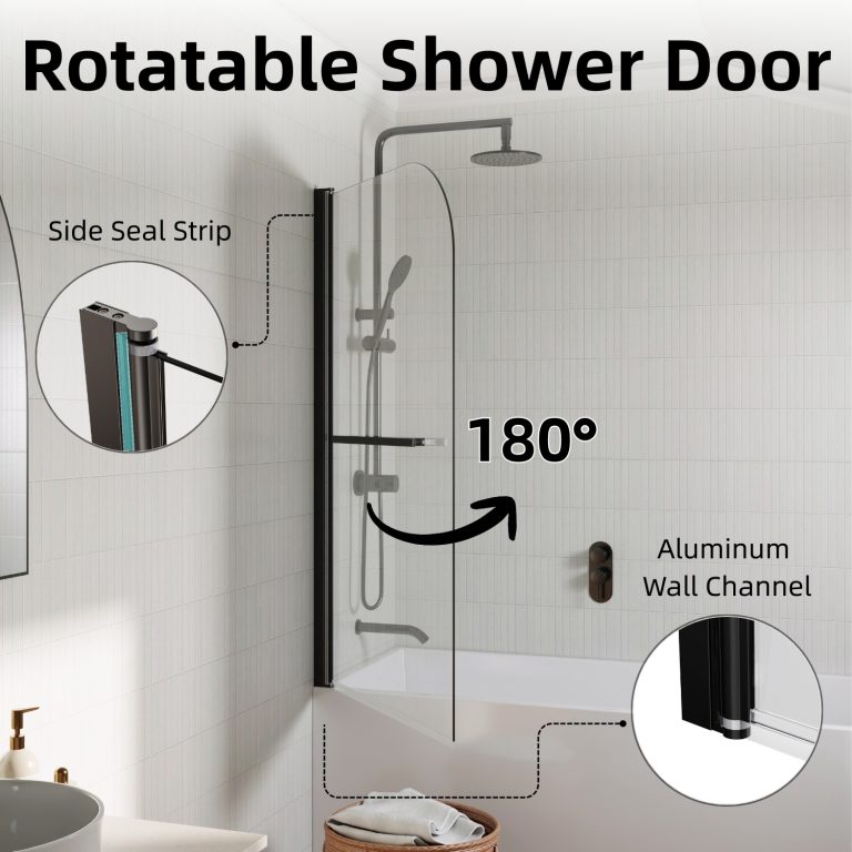 Upgrade your bathroom with this sleek frameless pivot shower door, designed for both style and practicality. Made from 1/4″ (6mm) tempered glass, it stands up to daily use, and if broken, it shatters into small, blunt pieces for added protection. The pivot hinge offers a full 180° swing in either direction, making entry and cleaning effortless, while reversible installation creates a wide, space-saving opening that doubles as a splash barrier. Its matte black frameless design brightens your bathroom and visually enlarges smaller spaces, giving your tub area a modern, airy feel. A water-retaining strip at the bottom keeps splashes contained and helps maintain a dry floor, clearly defining wet and dry zones. Setup is simple with included hardware and easy-to-follow instructions, while responsive customer support and a 1-year warranty ensure long-term satisfaction and worry-free use.