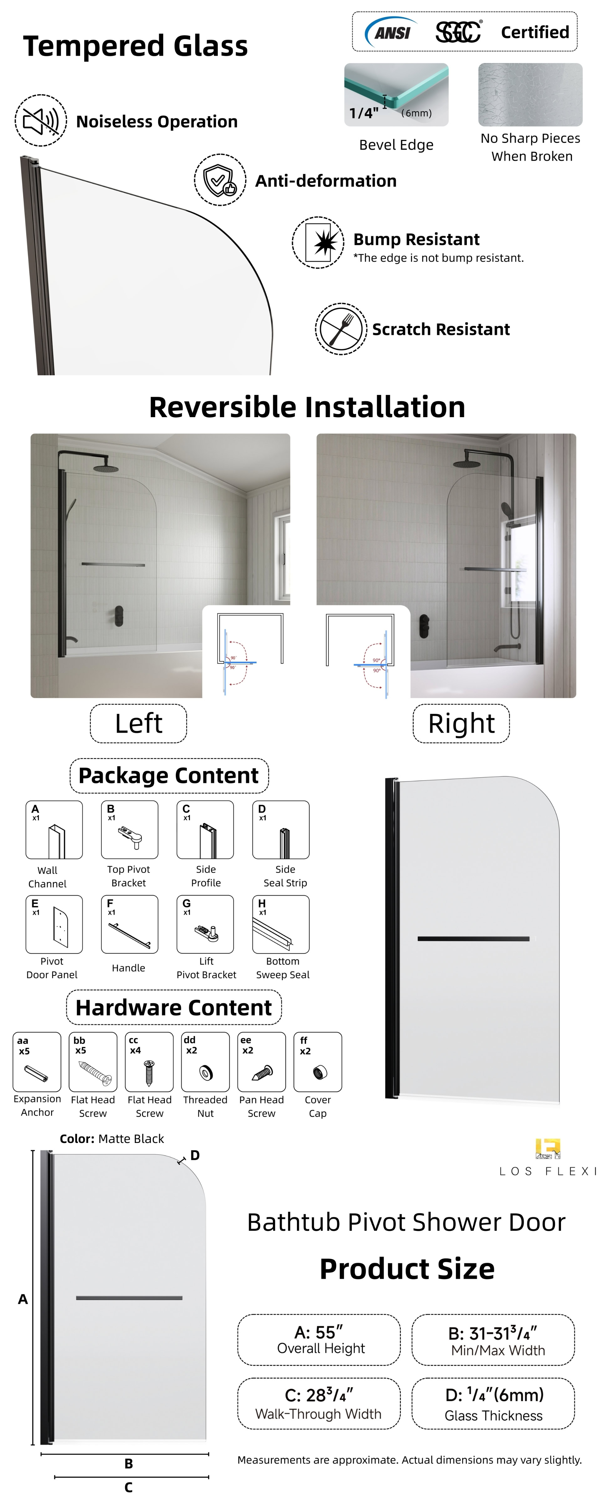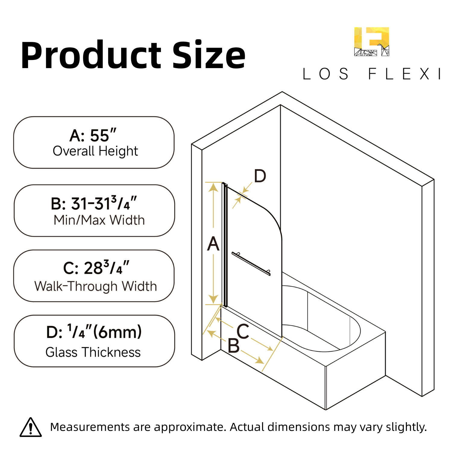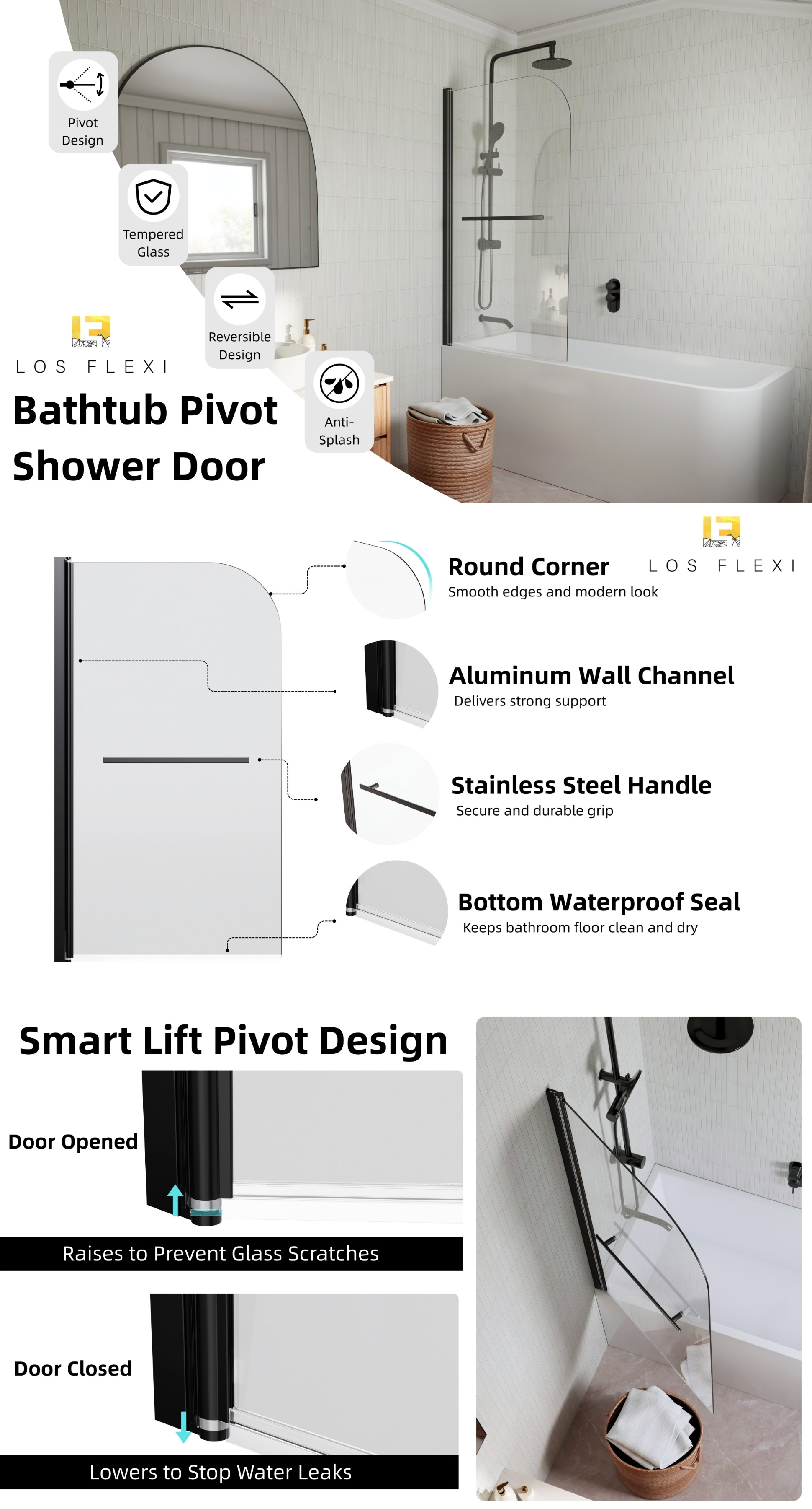 Los Flexi Pivot Half Shower Door for Bathtub Matte Black 31″ W x 55″ H with 1/4″ Glass