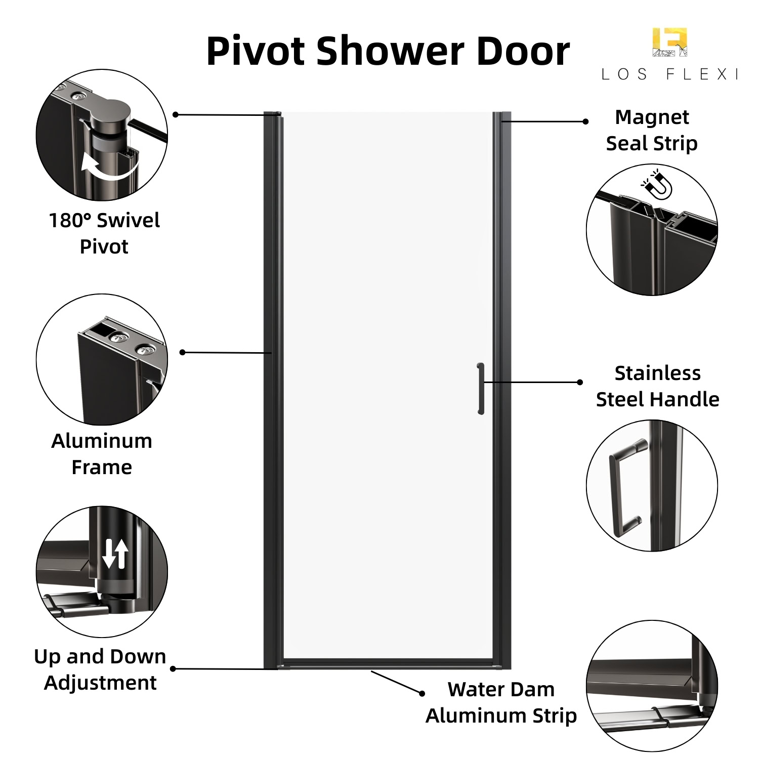 Los Flexi Pivot Shower Door Matte Black 32″W x 72″H with 1/4″ Tempered Glass