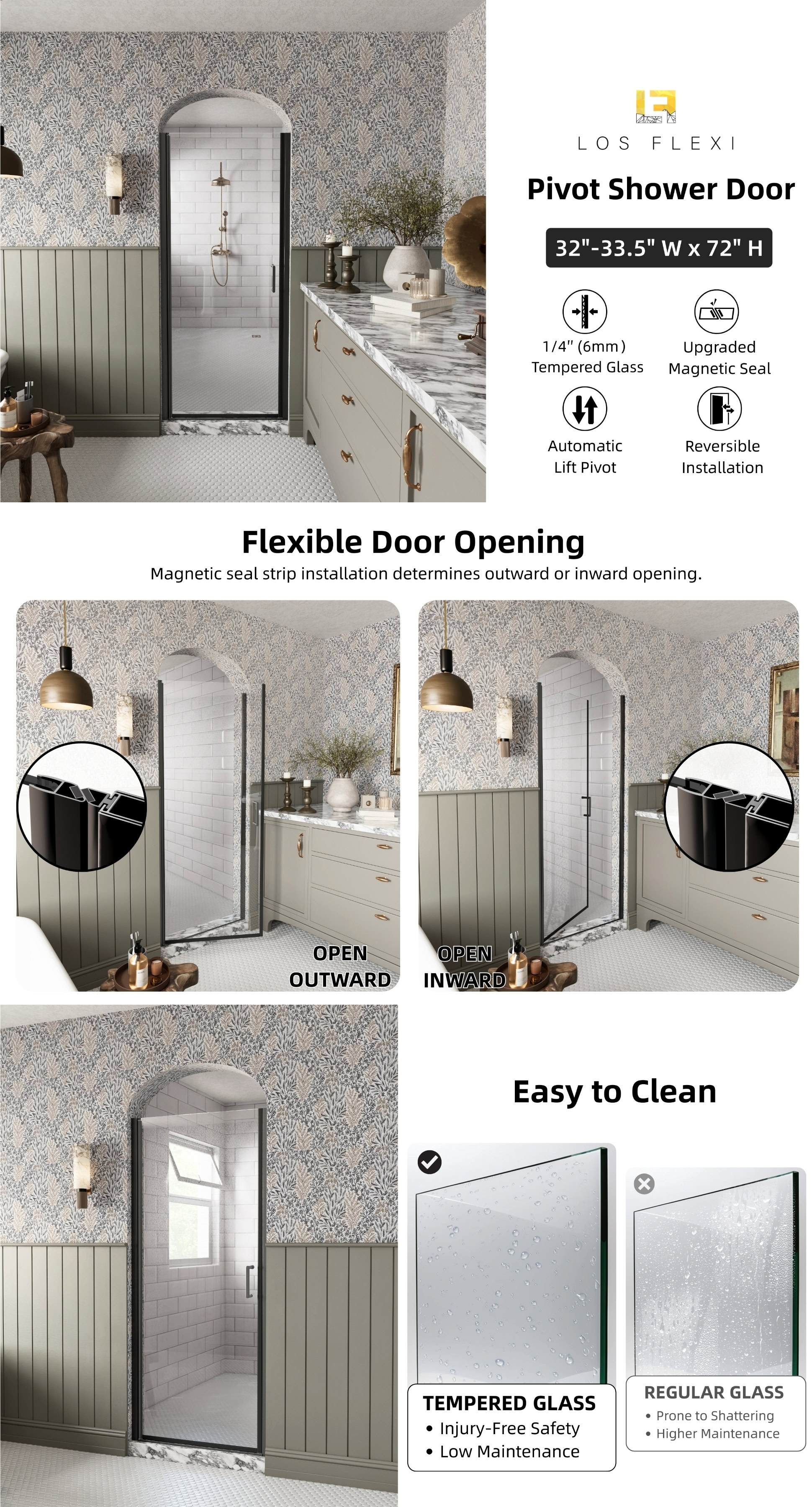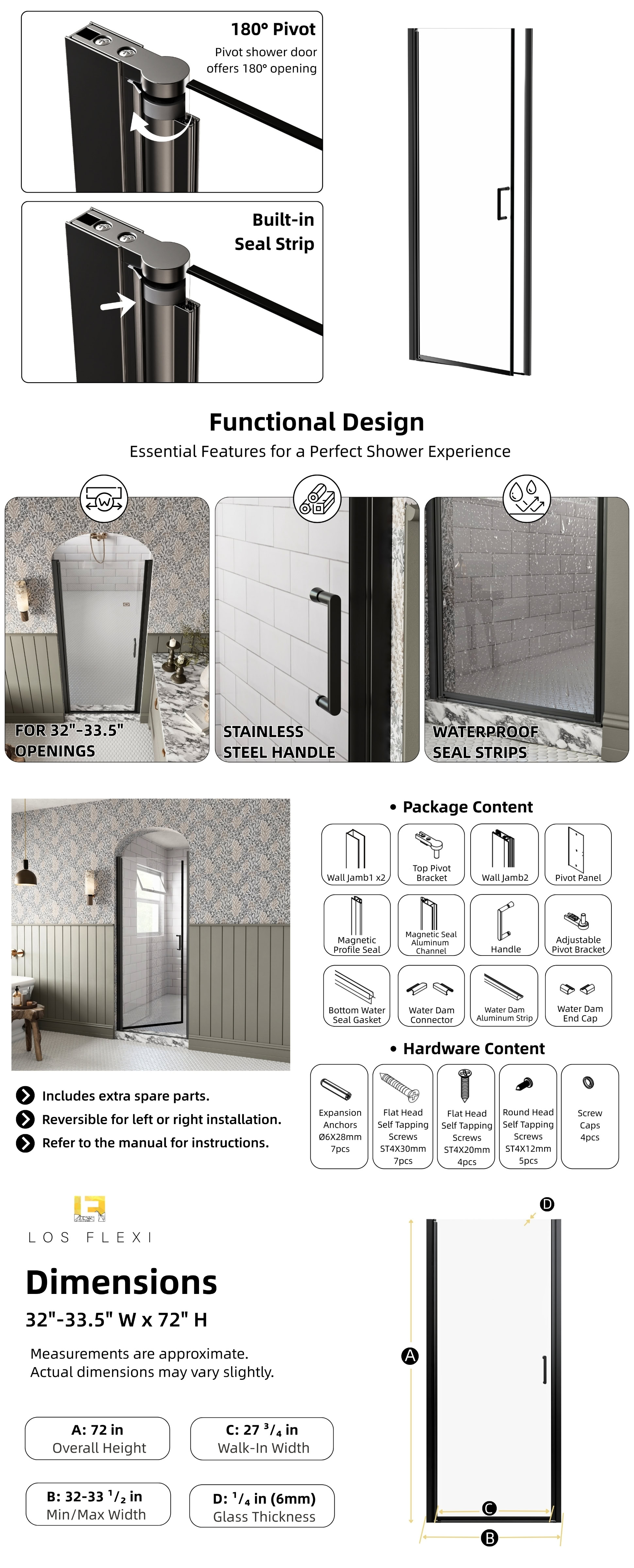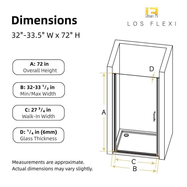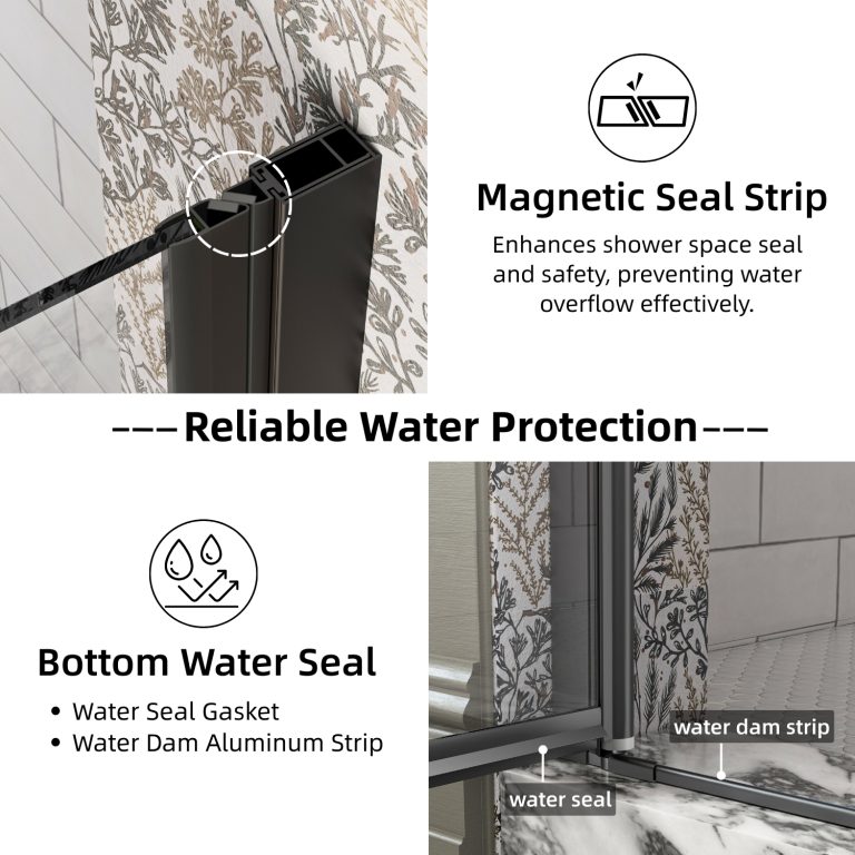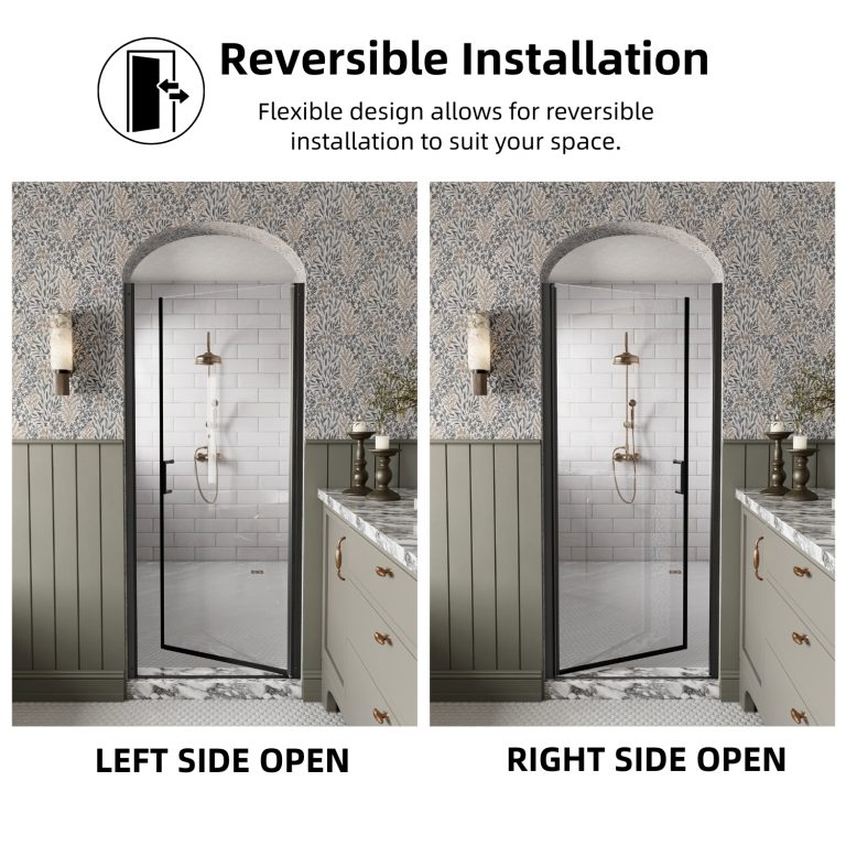 Enhance your bathroom with this versatile pivot shower door, designed to fit openings from 32″ to 33.5″ in width and standing at 72″ tall. Its adjustable width and reversible installation provide a tailored fit for various layouts. Featuring an innovative auto-lift pivot system, the door opens smoothly with a unique lift-and-lower function, while the sleek matte black aluminum frame adds a modern touch to any bathroom. Made from strong 1/4″ SGCC tempered glass, it offers superior durability and impact resistance. Equipped with an upgraded magnetic seal and bottom water seal, this glass shower door ensures optimal leak prevention and keeps your bathroom dry. With easy installation and a 1-year warranty, it promises lasting performance and peace of mind.